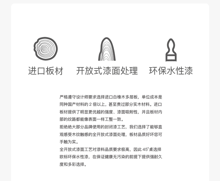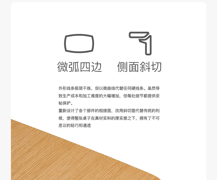 45度桌是一个反抗的产物。为什么桌子需要角,桌角伤人事件常有发生,为什么不取缔那尖锐的90度角?将90度斜切,和同样斜切的桌角重新组成一个全新的无棱角的90度,圆润的直角。向下斜切的侧边,温柔收敛,因为气场从来不是疾声厉色或者毕露的锋芒能够带来的。 举报 极有家认证[原创设计]:专属设计,限量生产,只为你造 商家承诺:提供“免费送装”服务,百城内包物流、包配送、包安装