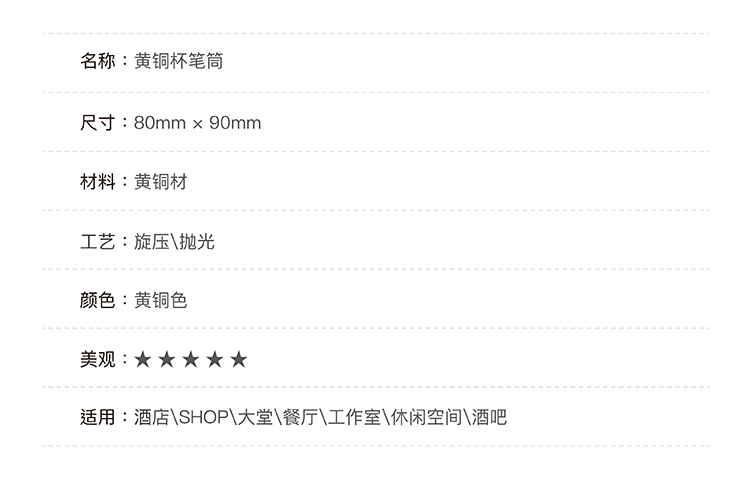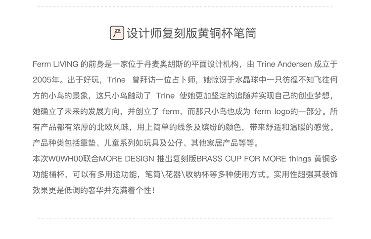 本次inyard严选联合MORE DESIGN 推出复刻版BRASS CUP FOR MORE things 黄铜多功能桶杯,可以有多用途功能,笔筒\花器\收纳杯等多种使用方式。实用性超强其装饰效果更是低调的奢华并充满着个性!(黄铜材质的产品避免碰水哦,黄铜遇水是易氧化起锈斑的。) 举报 极有家认证[原创设计]:专属设计,限量生产,只为你造 商家承诺:提供“材质保真”服务,如材质与描述不符可获赔200%