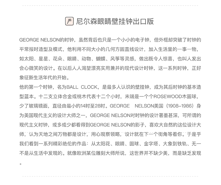 尼尔森眼睛挂钟极简北欧风壁挂钟创意现代壁钟,出口品质,细节工艺精湛。 举报 极有家认证[原创设计]:专属设计,限量生产,只为你造 商家承诺:提供“材质保真”服务,如材质与描述不符可获赔200%