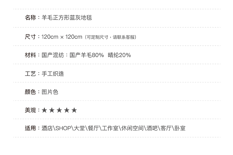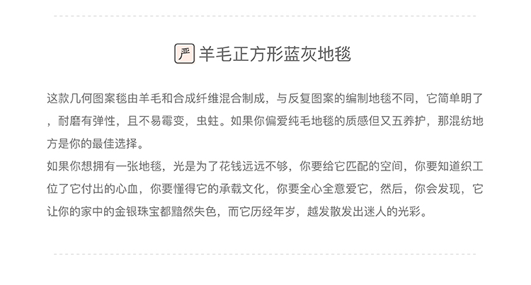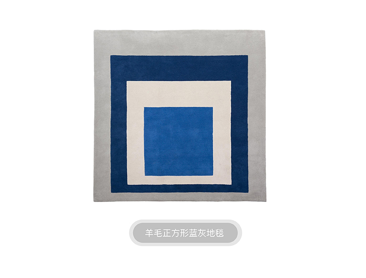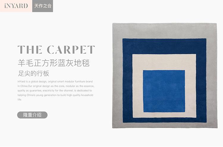 「InYard严选」现代简约羊毛正方形蓝白几何多空间可用地毯设计 举报 极有家认证[原创设计]:专属设计,限量生产,只为你造 商家承诺:提供“材质保真”服务,如材质与描述不符可获赔200%