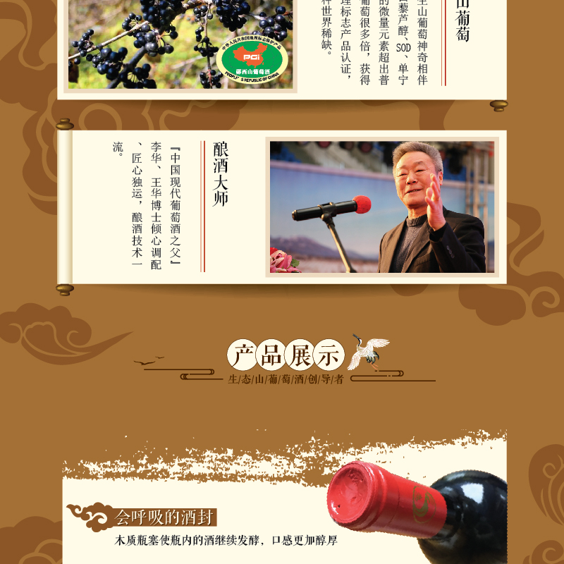 武当红生态山葡萄酒,产自著名的梅诺克酒庄,其拥有20万亩的野生葡萄基地。武当红有机野生山葡萄酒的单宁含量是普通葡萄酒的10倍,白藜芦醇含量是普通葡萄酒的2-3倍。白藜芦醇被称为植物抗毒素,对肿瘤、动脉硬化、心脑血管疾病都有着不可替代的预防及治疗作用。武当红有机野生山葡萄酒将高品质的生活态度与品酒结合,让生活更富有内涵。