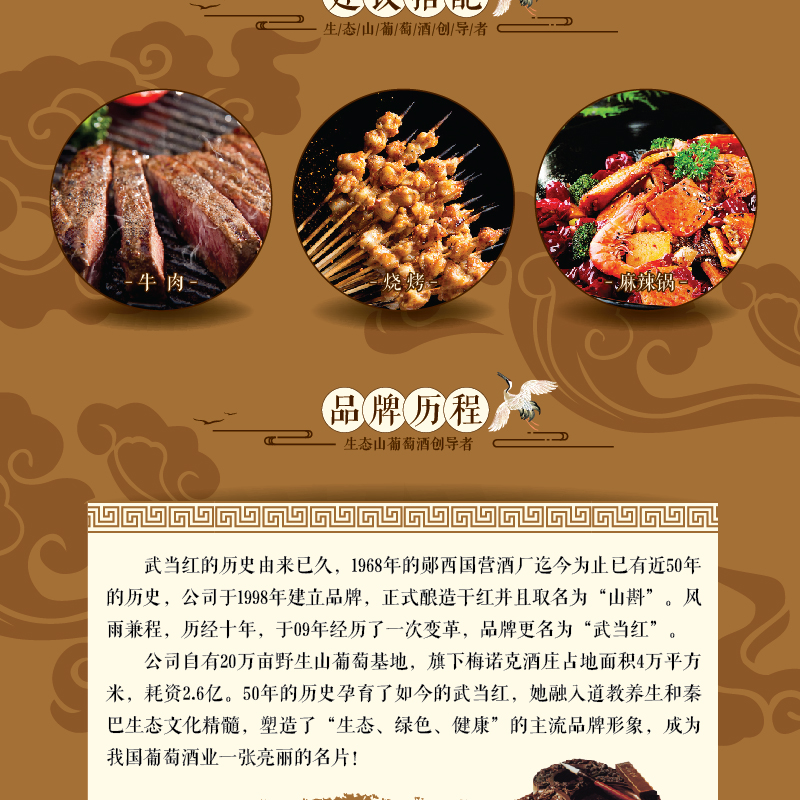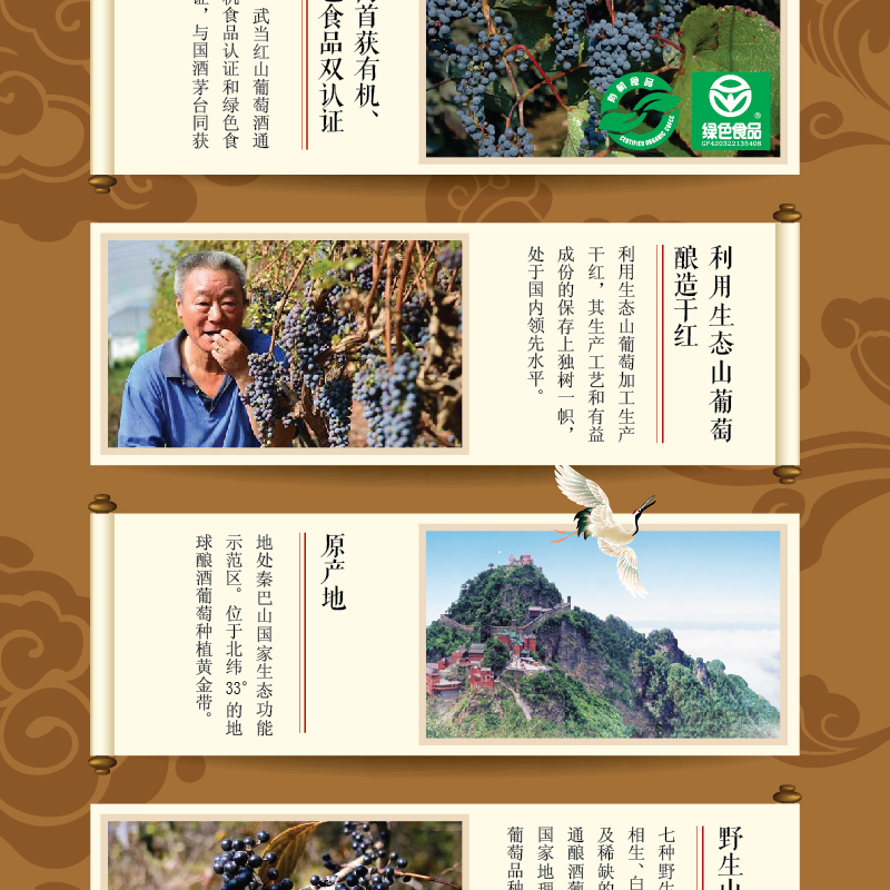 武当红生态山葡萄干红,产自著名的梅诺克酒庄,其拥有20万亩的野生葡萄基地。武当红有机野生山葡萄酒的单宁含量是普通葡萄酒的10倍,白藜芦醇含量是普通葡萄酒的2-3倍。白藜芦醇被称为植物抗毒素,对肿瘤、动脉硬化、心脑血管疾病都有着不可替代的预防及治疗作用。武当红有机野生山葡萄酒将高品质的生活态度与品酒结合,让生活更富有内涵。