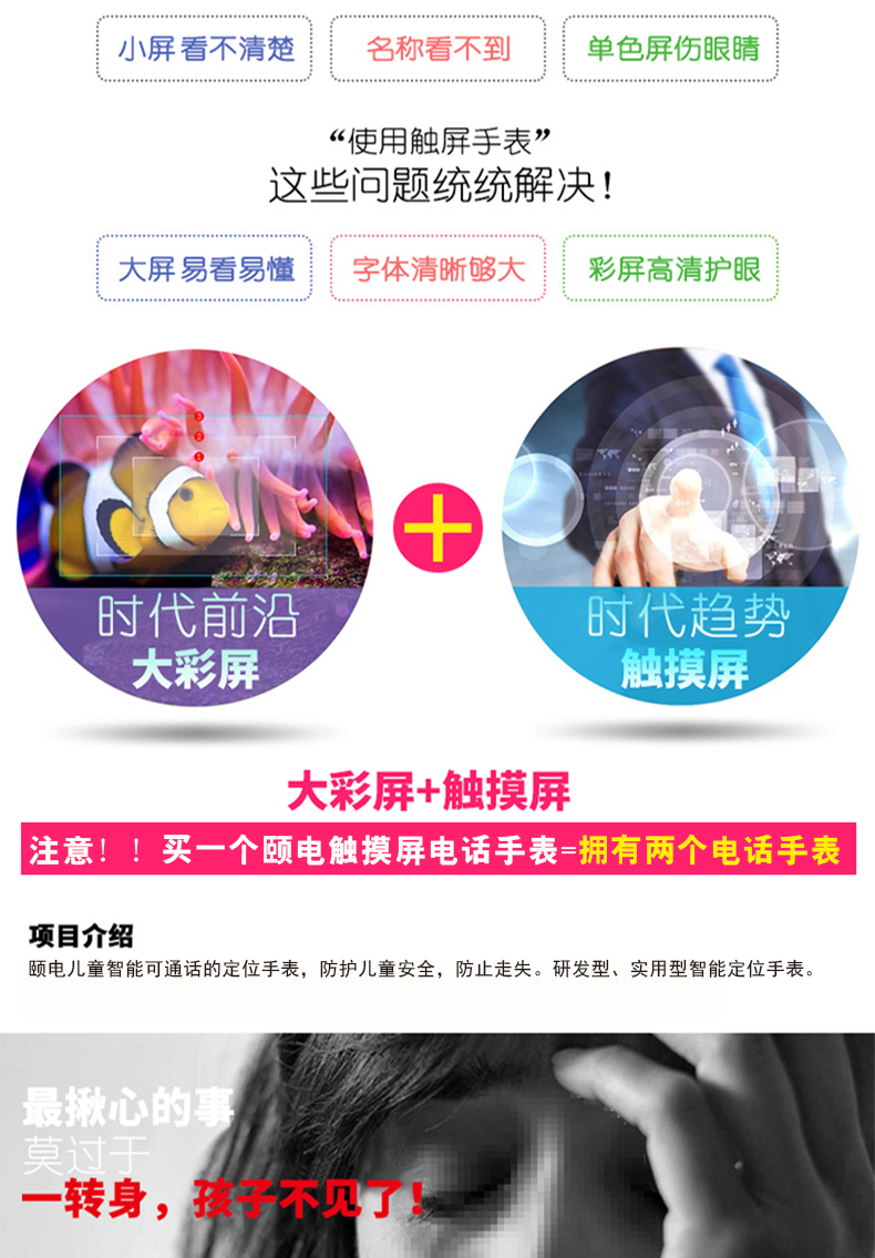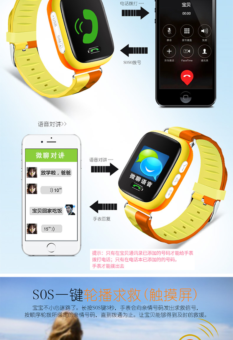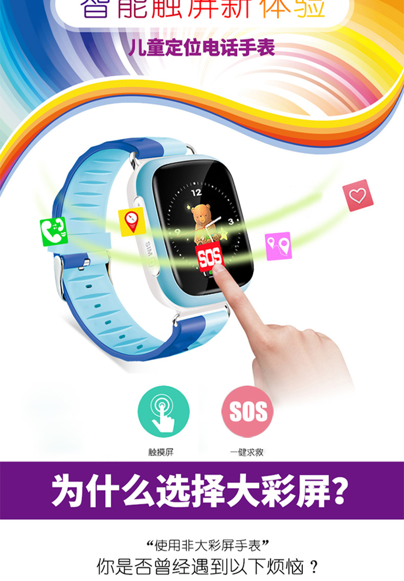 1、1.44寸触摸彩屏,一键SOS求救,双重定位;