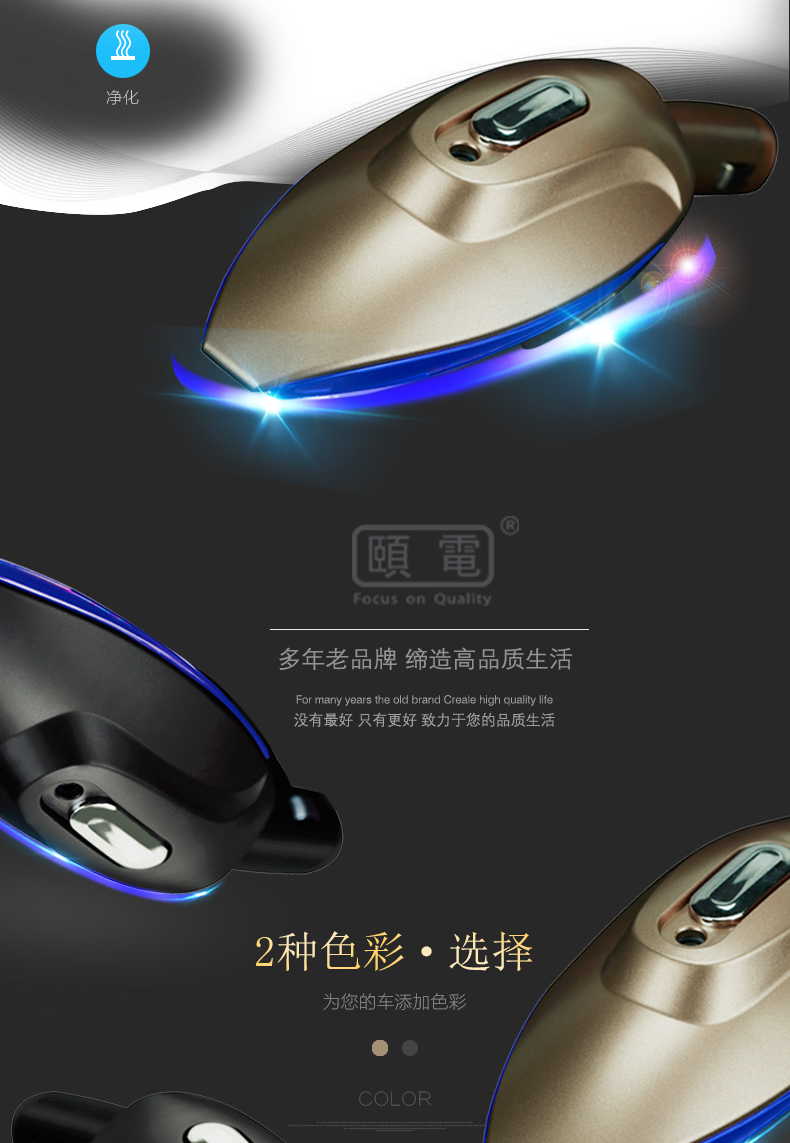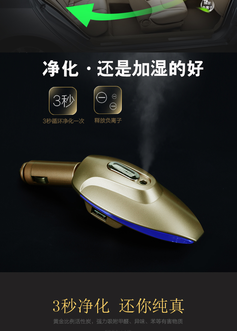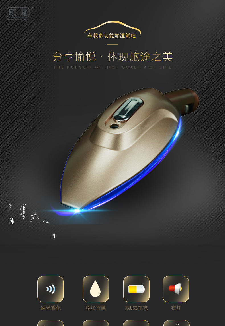 1、多功能合一:纳米雾化、负离子、香薰、双USB车充(12-