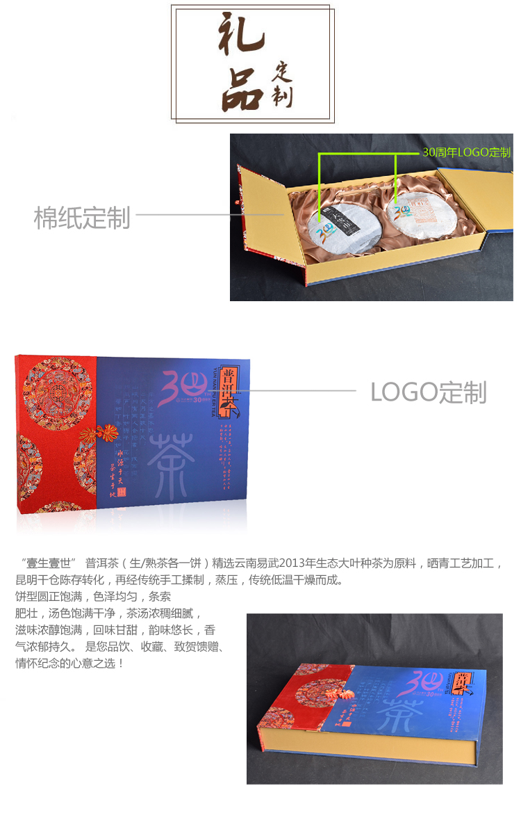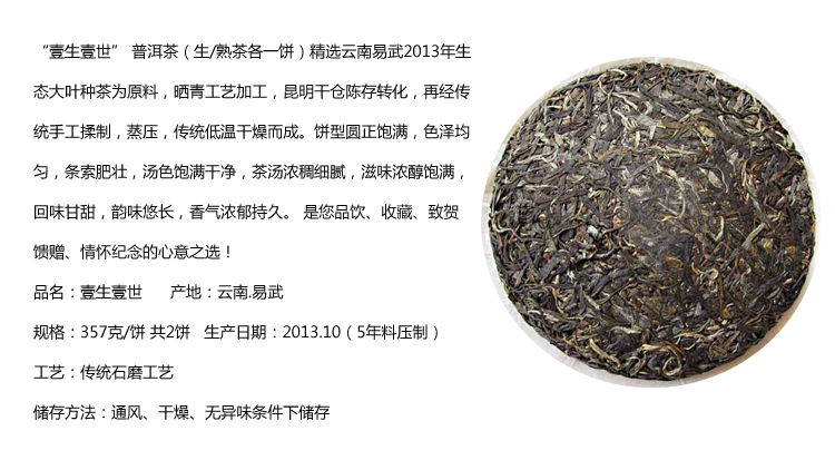 “壹生壹世” 普洱茶(生/熟茶各一饼)精选云南易武2013年生态大叶种茶为原料,晒青工艺加工,昆明干仓陈存转化,再经传统手工揉制,蒸压,传统低温干燥而成。