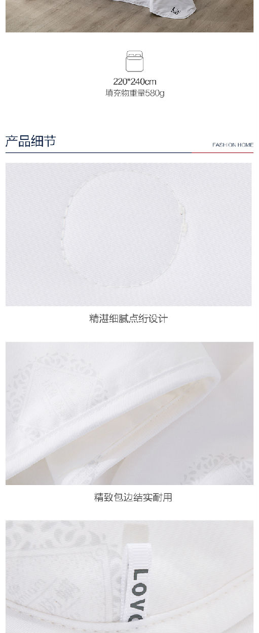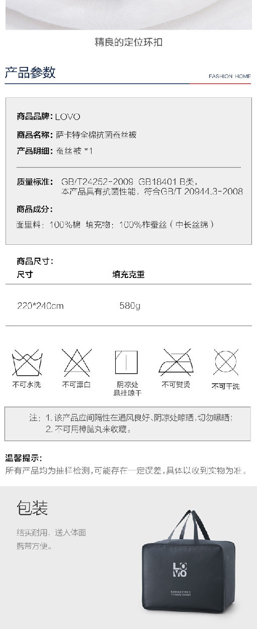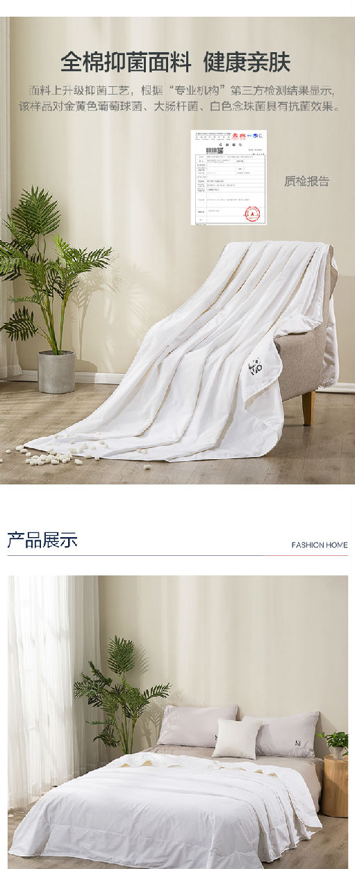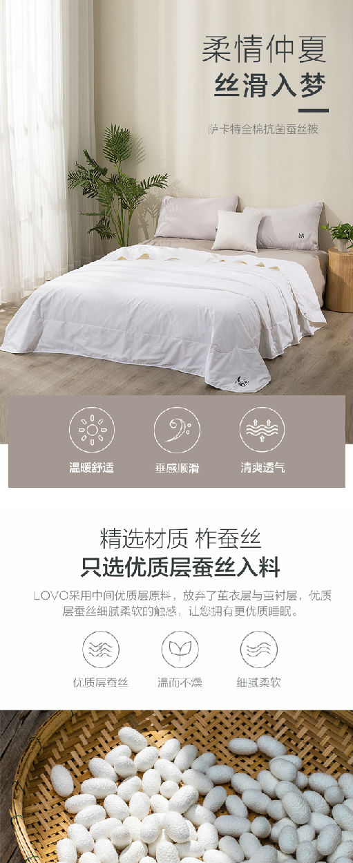 精选材质柞蚕丝,只选优质层蚕丝入料,只为好睡眠;人工制被工序严苛,阡陌结构被子更爽滑透气;全面抑菌面料,健康亲肤。
