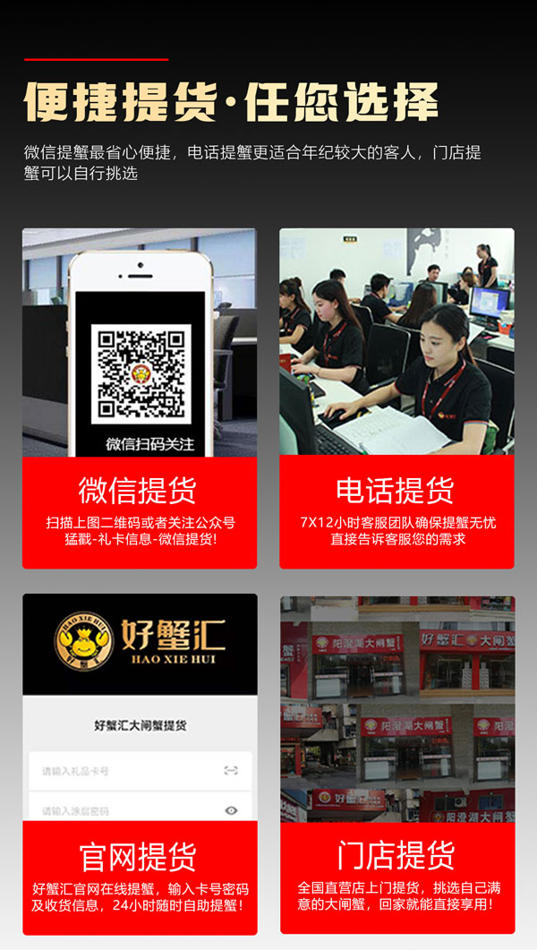 商品特色:蟹卡全国通提,免费顺丰发货,提货便捷:可微信提货电话提货扫描二维码提货推荐门店提货