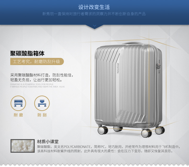 100%PC防刮亚光材质,搭配亮丽动感线条,中间醒目高档