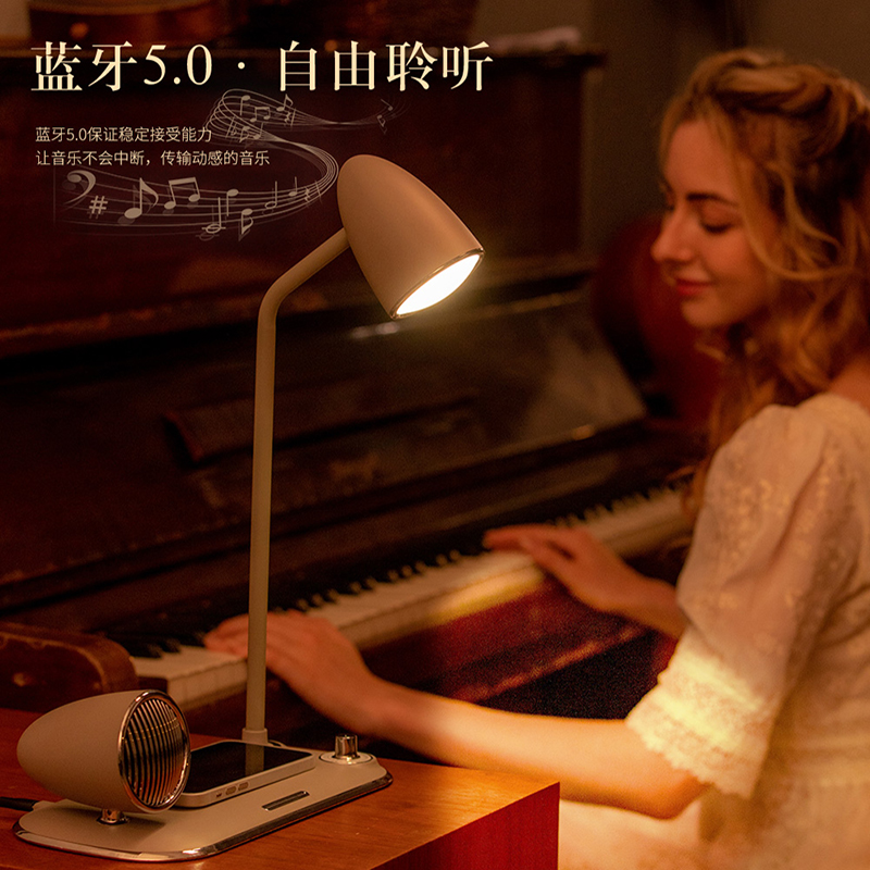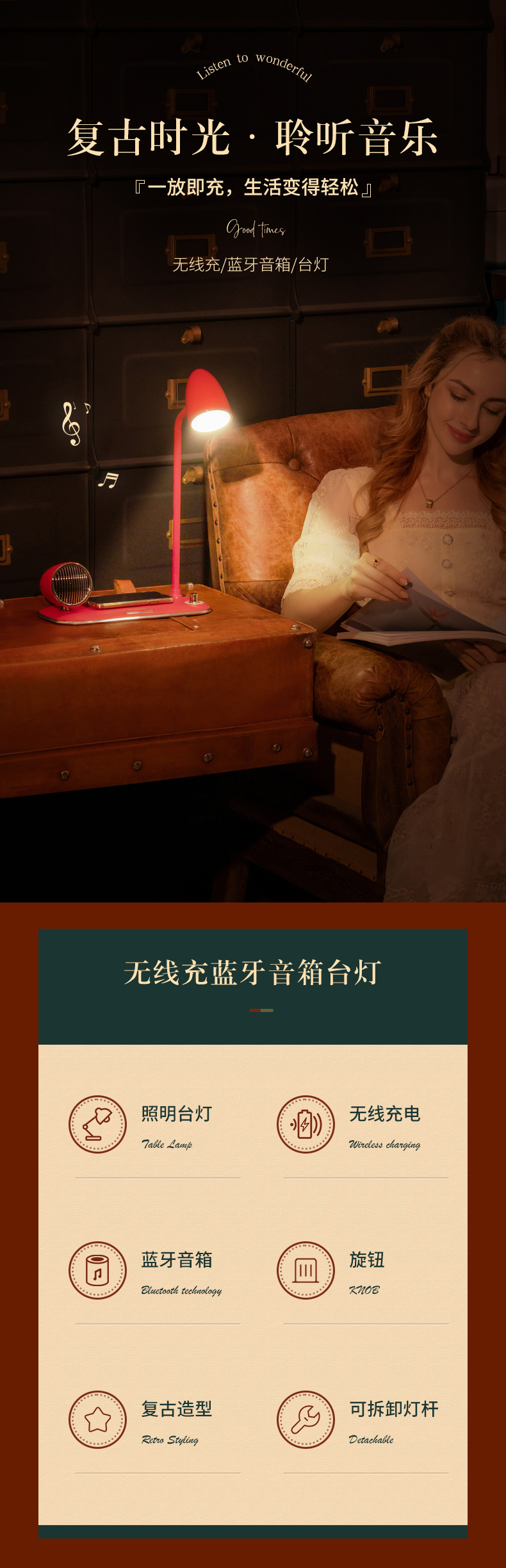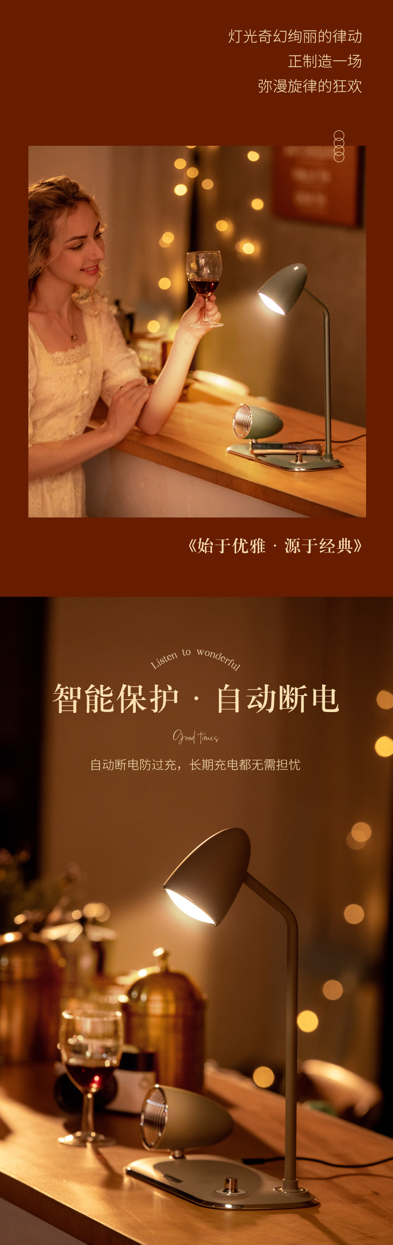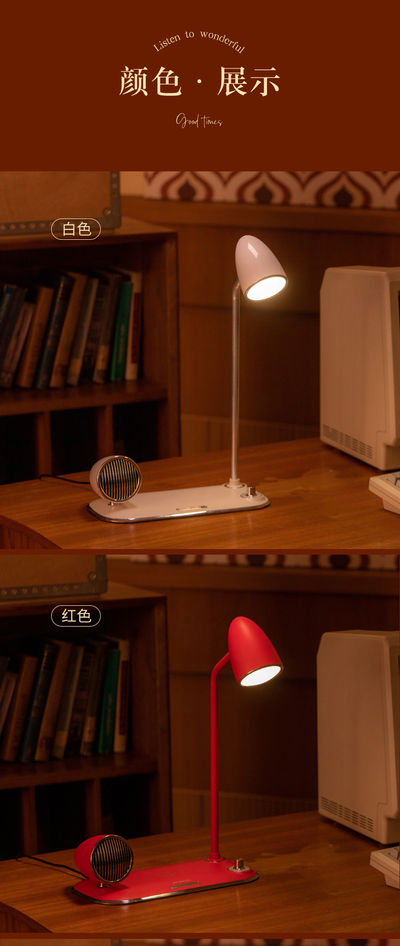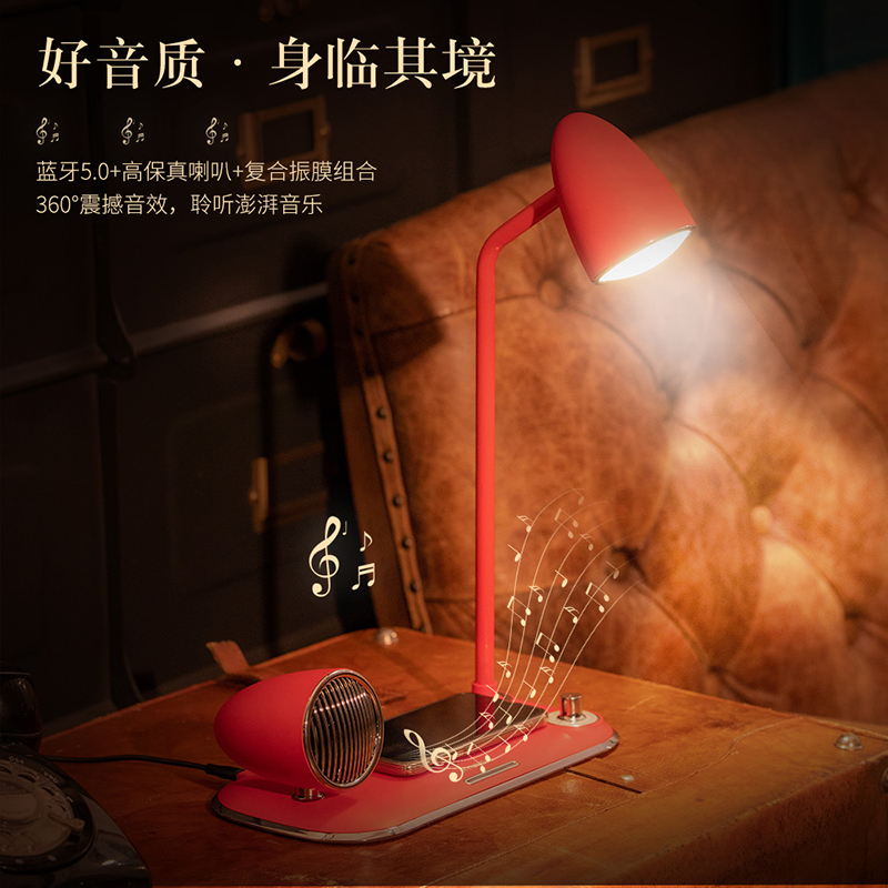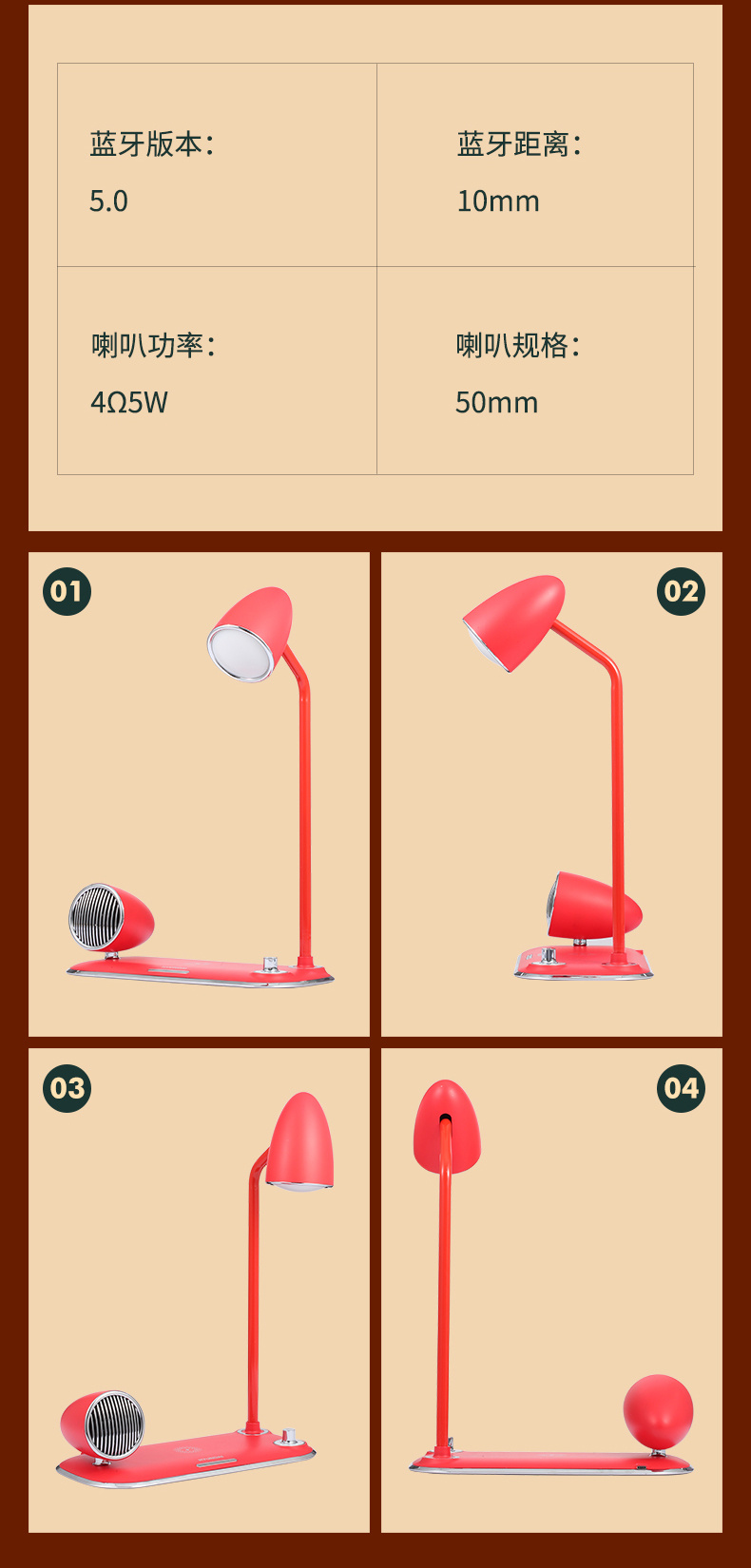 功能说明:蓝牙音箱、无线充、手机支架、台灯配件明细:产品+快充数据线+快充充头产品尺寸:28*13*43 mm