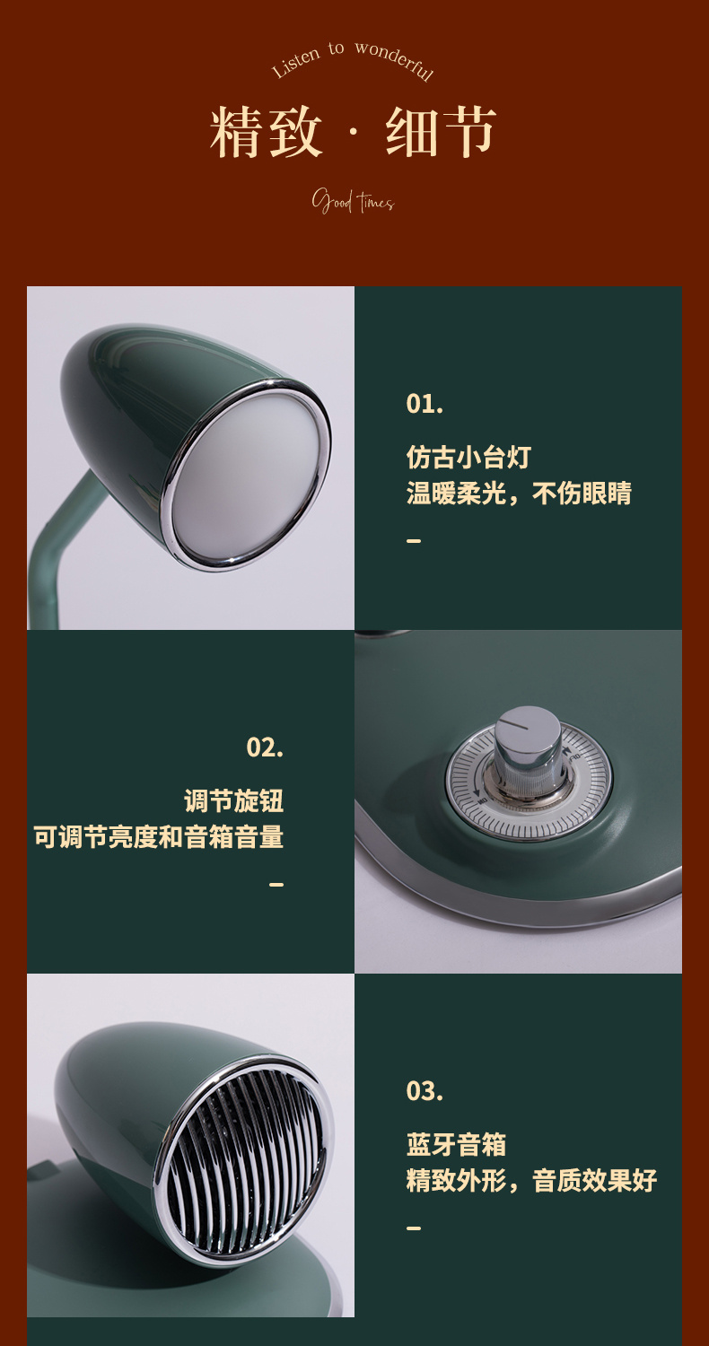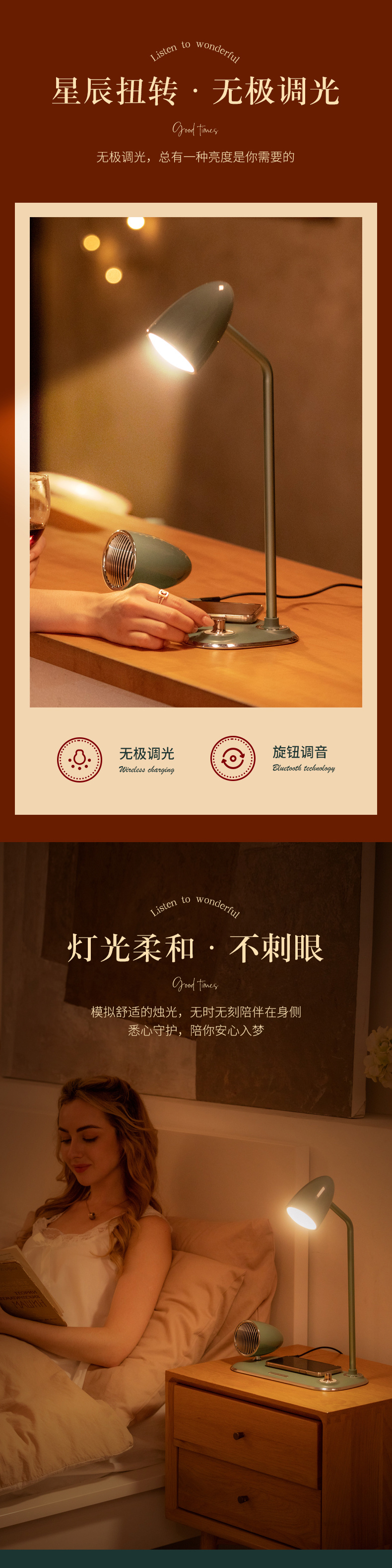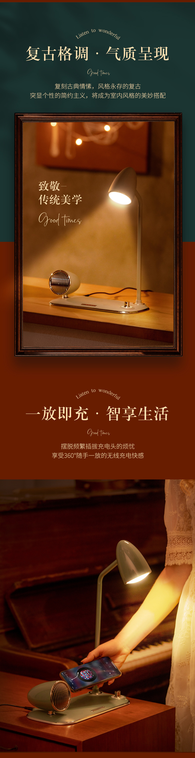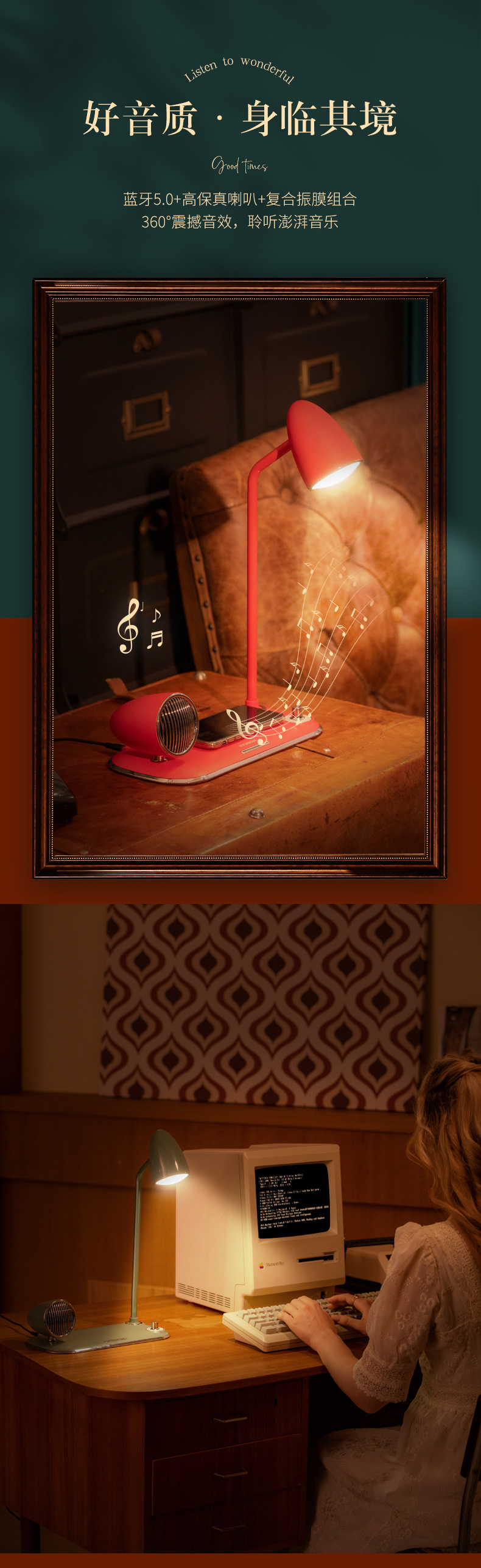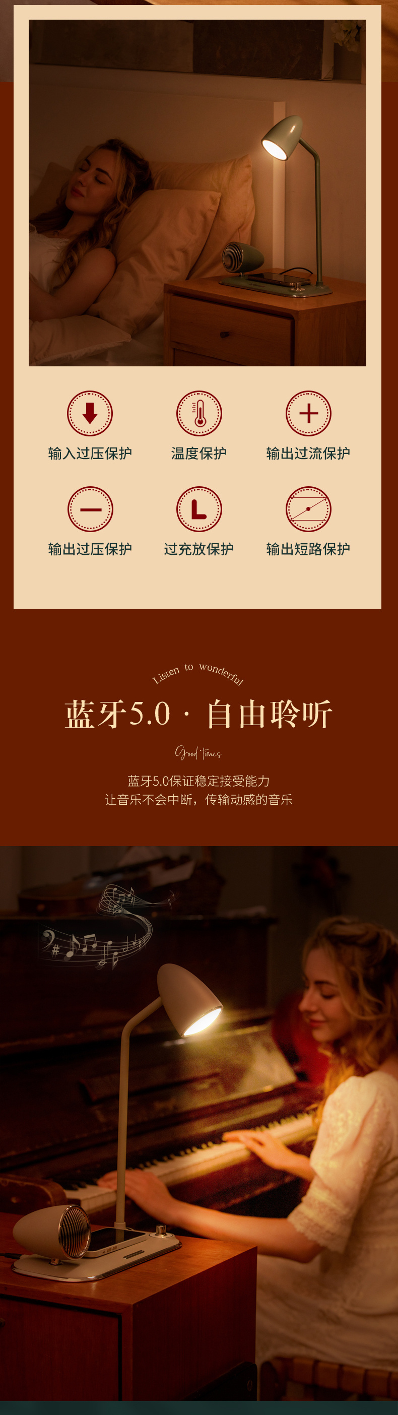 功能说明:蓝牙音箱、无线充、手机支架、台灯配件明细:产品+快充数据线+快充充头产品尺寸:28*13*43 mm