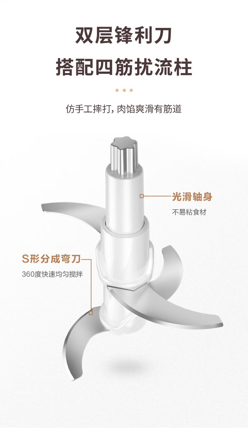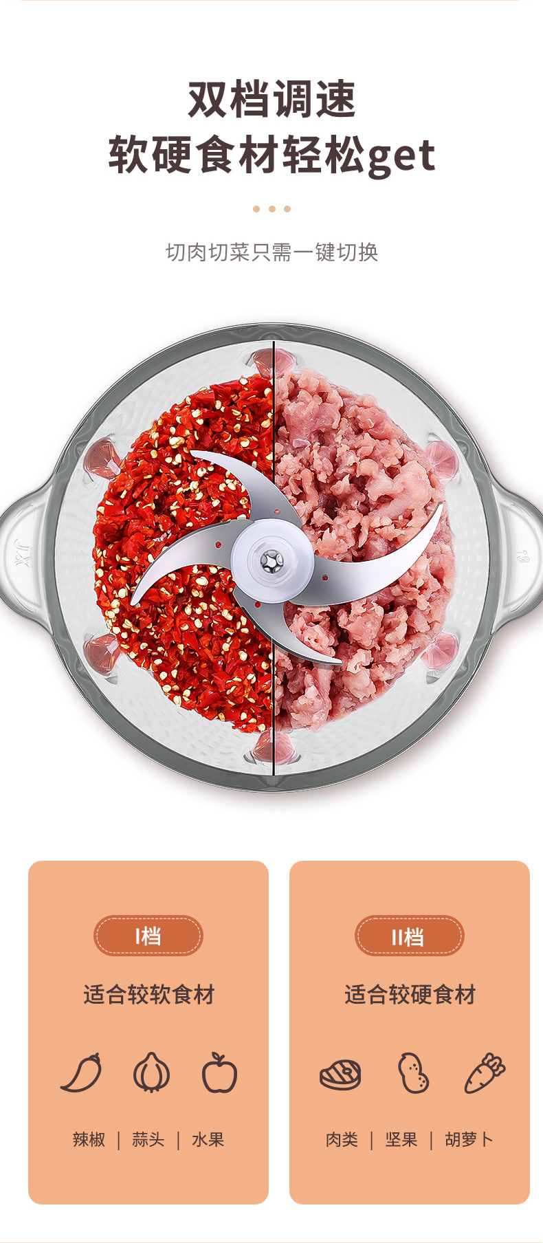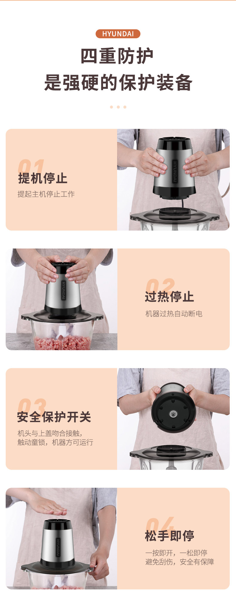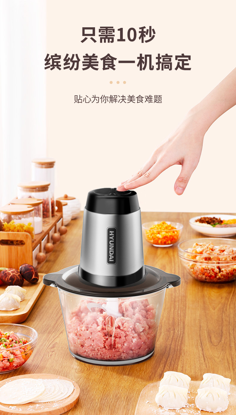 1、一键点动开关设计,快慢两档自由选择 2、杯盖密封防溅,健康洁净 3、精钢轴心,动力澎湃,秒速绞肉 4、可拆卸加厚刀片,双层四刀不锈钢刀片,轻松拆洗不藏垢 5、6mm加厚玻璃杯,硅胶防滑垫,有效防滑、降噪 6、双重保护系统:智能微动安全保护装置,安装不到位无法开机工作;安全过热保护装置,保护核心部件寿命,使用安全