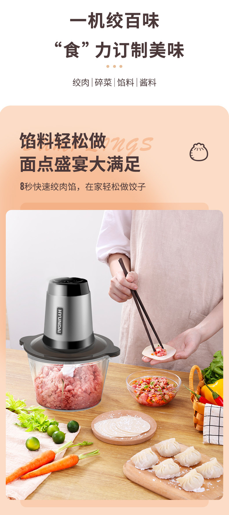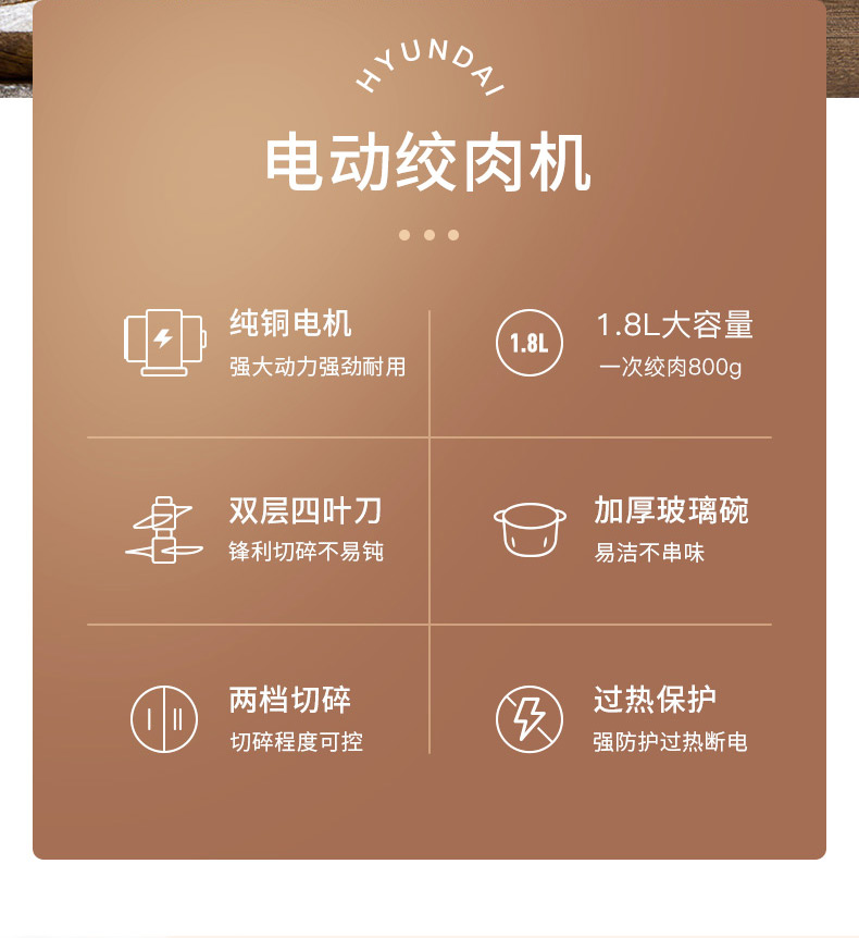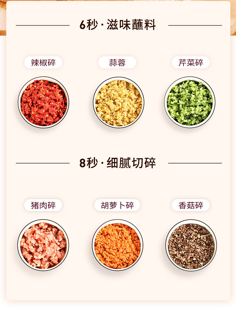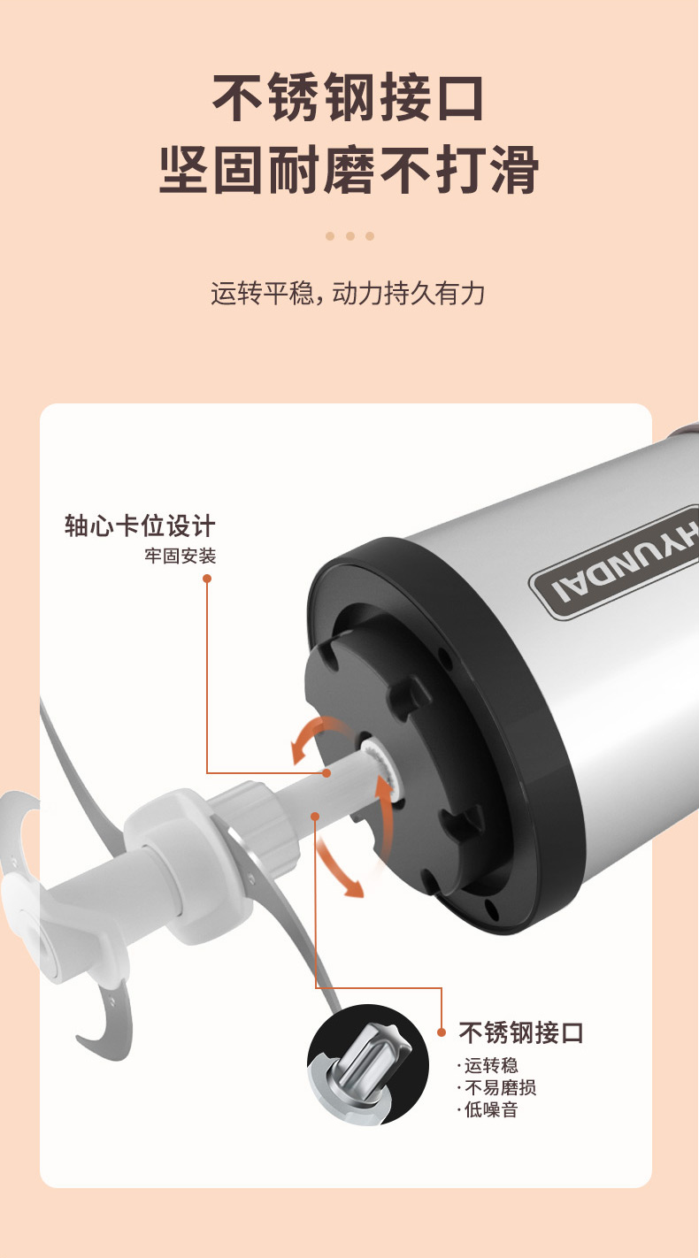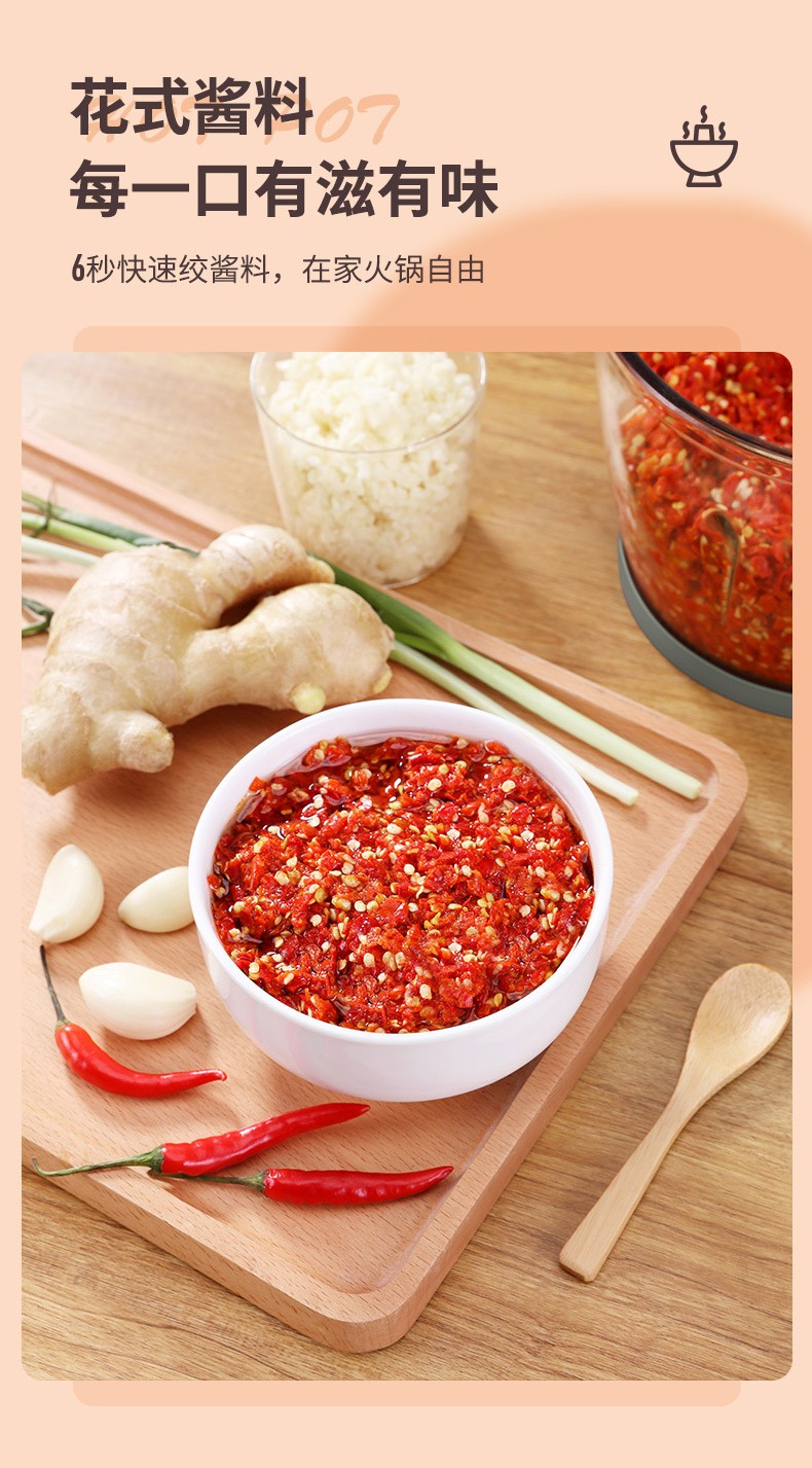 1、一键点动开关设计,快慢两档自由选择 2、杯盖密封防溅,健康洁净 3、精钢轴心,动力澎湃,秒速绞肉 4、可拆卸加厚刀片,双层四刀不锈钢刀片,轻松拆洗不藏垢 5、6mm加厚玻璃杯,硅胶防滑垫,有效防滑、降噪 6、双重保护系统:智能微动安全保护装置,安装不到位无法开机工作;安全过热保护装置,保护核心部件寿命,使用安全