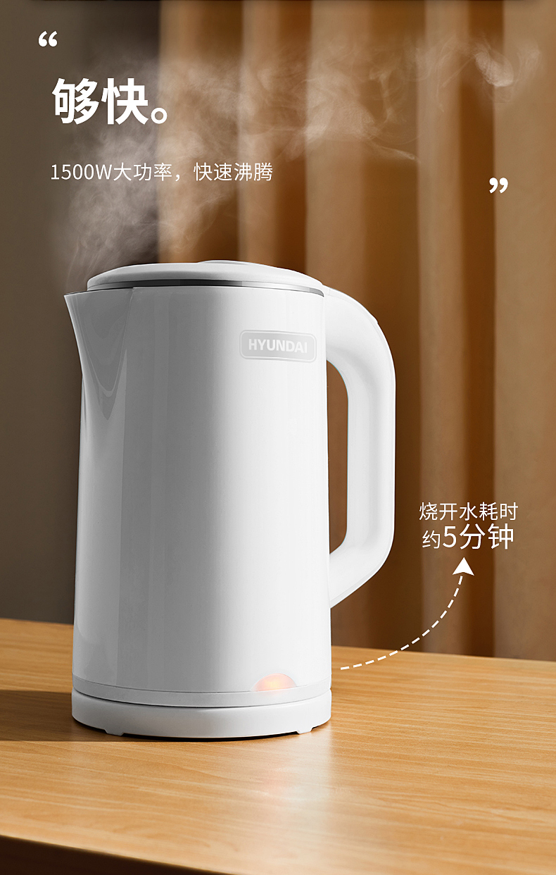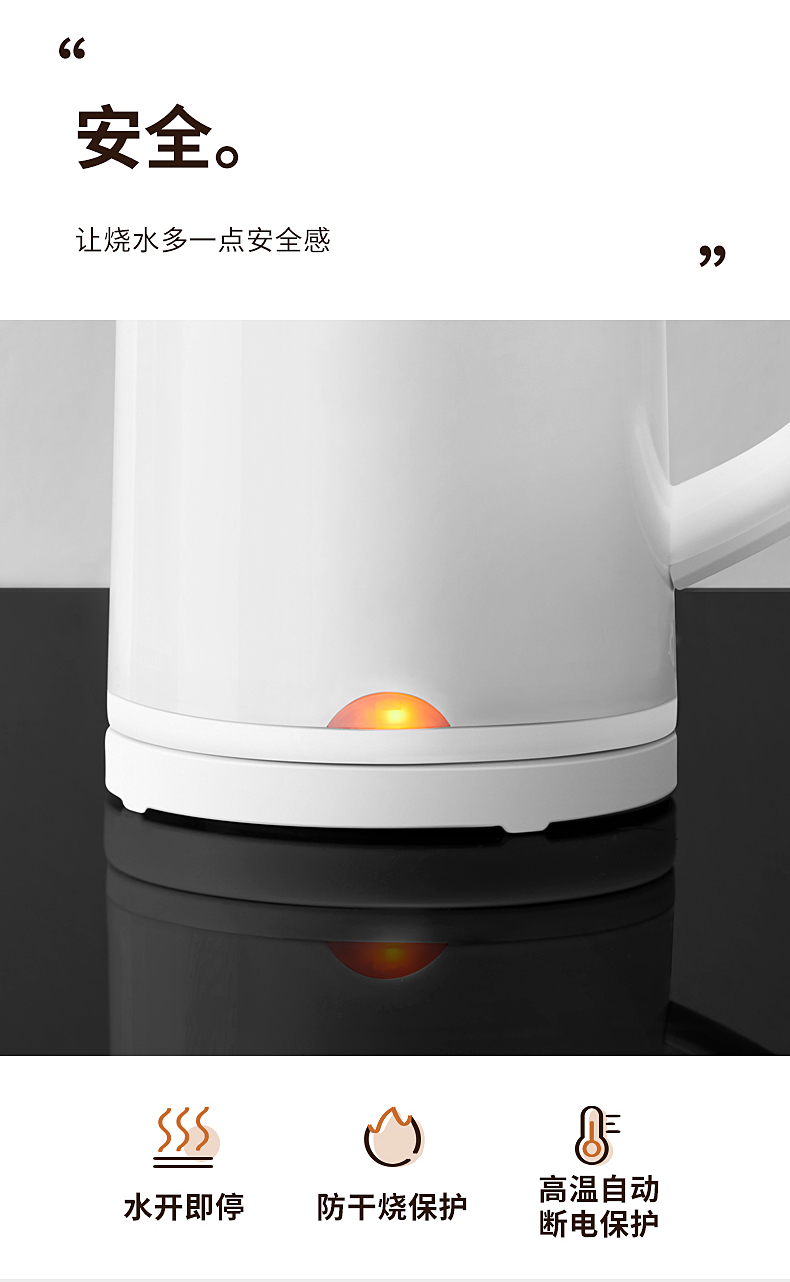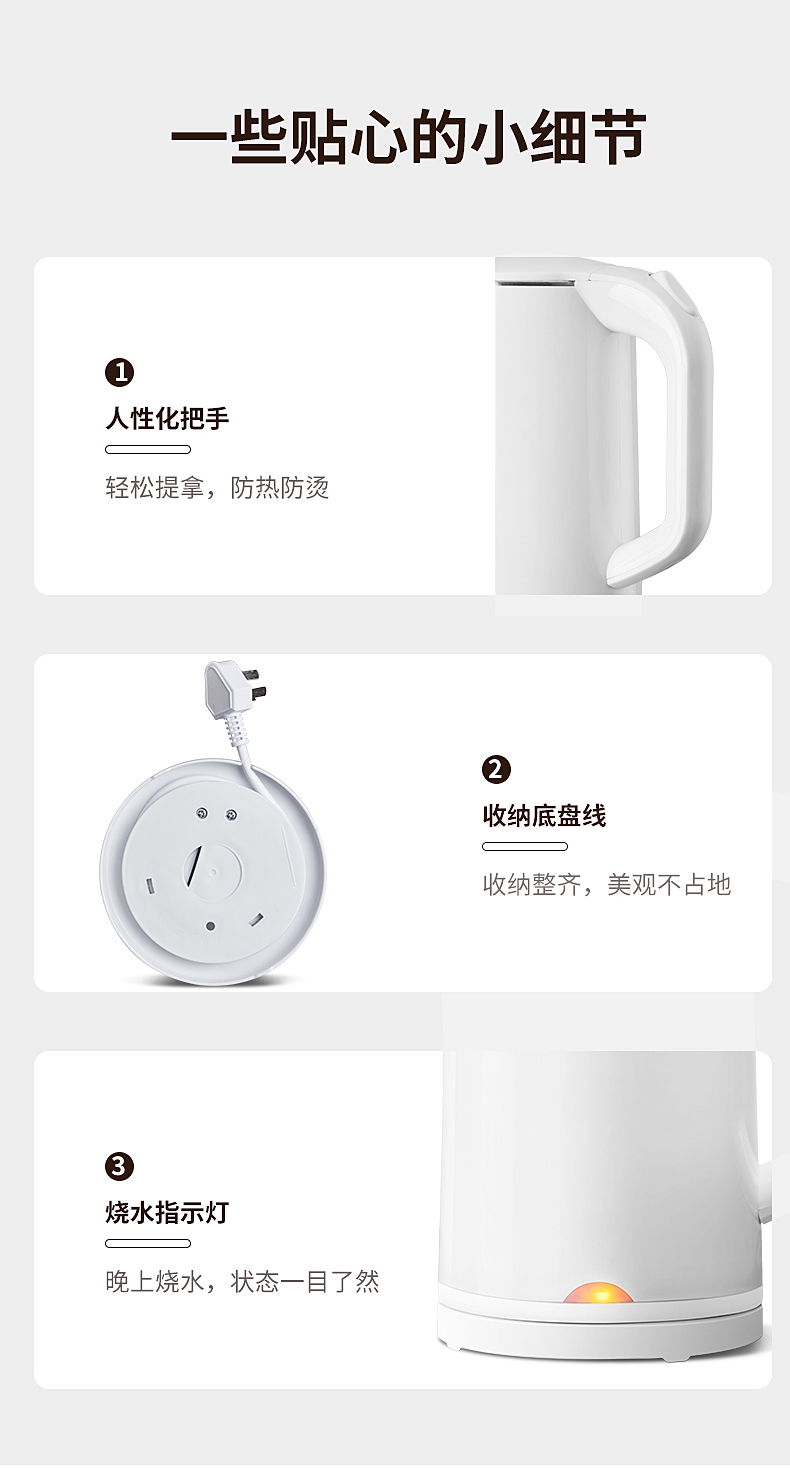 1、一键加热,煮水带蓝光,操作简单快捷,煮水状态一目了然; 2、1.8L大容量,满足多各种饮用需求; 3、快速沸腾,烧水不久候 4、双层壶身,隔热防烫;90°防烫开盖,安全防蒸汽;U型壶嘴,水流稳定;收纳式线盘,收纳方便,不占空间 5、加大壶口,清洗无负担 ; 6、防干烧底座,自动断电,防护更耐用。