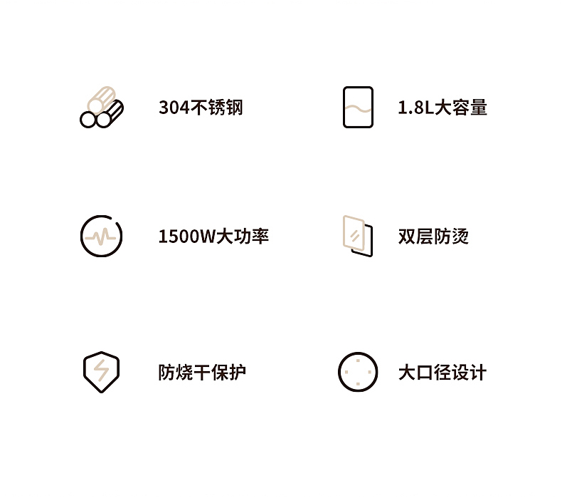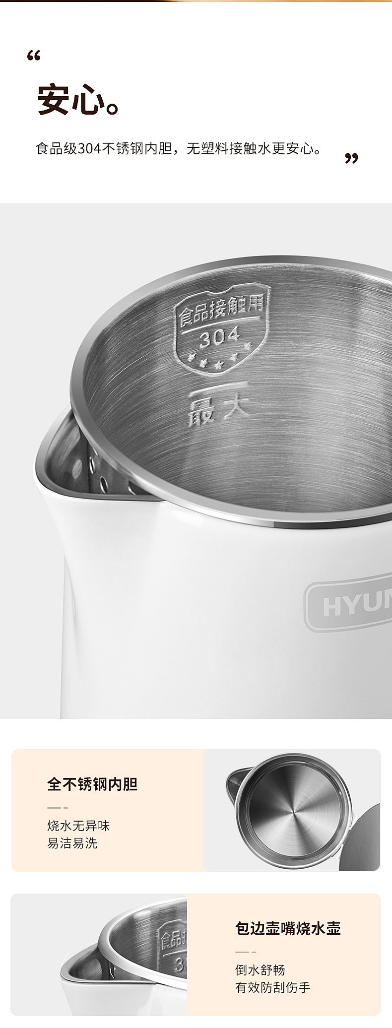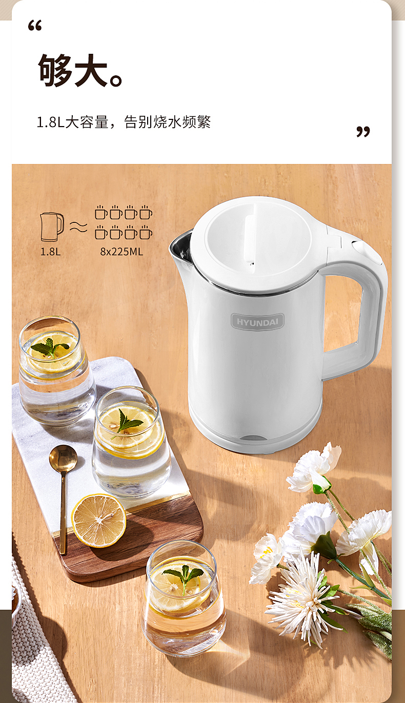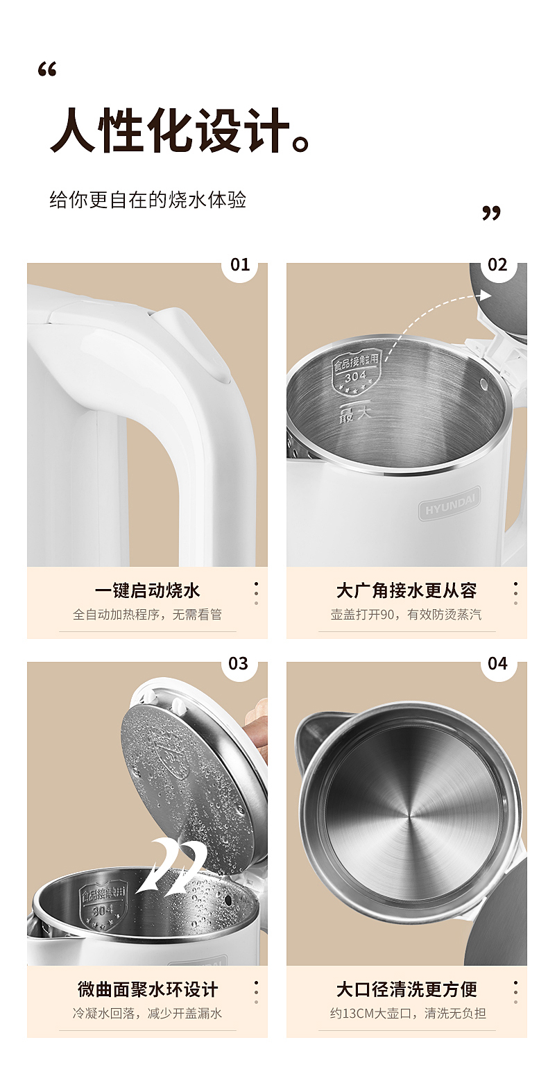 1、一键加热,煮水带蓝光,操作简单快捷,煮水状态一目了然; 2、1.8L大容量,满足多各种饮用需求; 3、快速沸腾,烧水不久候 4、双层壶身,隔热防烫;90°防烫开盖,安全防蒸汽;U型壶嘴,水流稳定;收纳式线盘,收纳方便,不占空间 5、加大壶口,清洗无负担 ; 6、防干烧底座,自动断电,防护更耐用。
