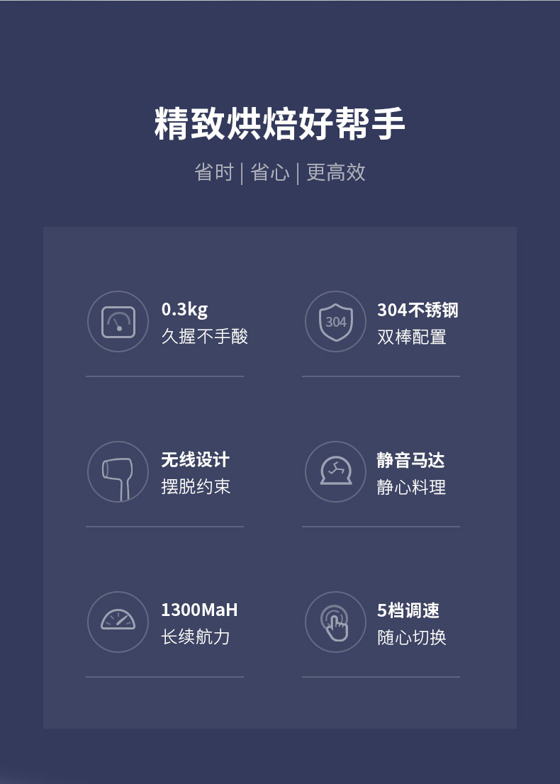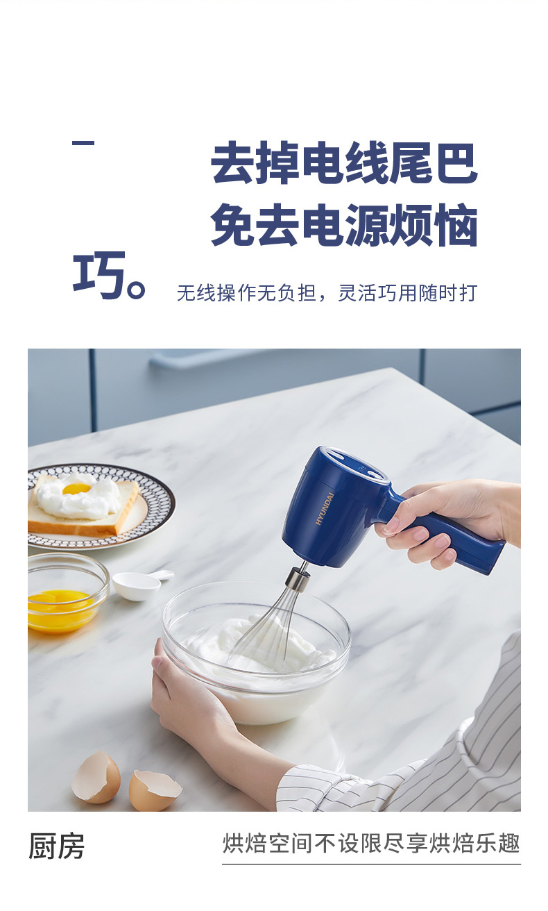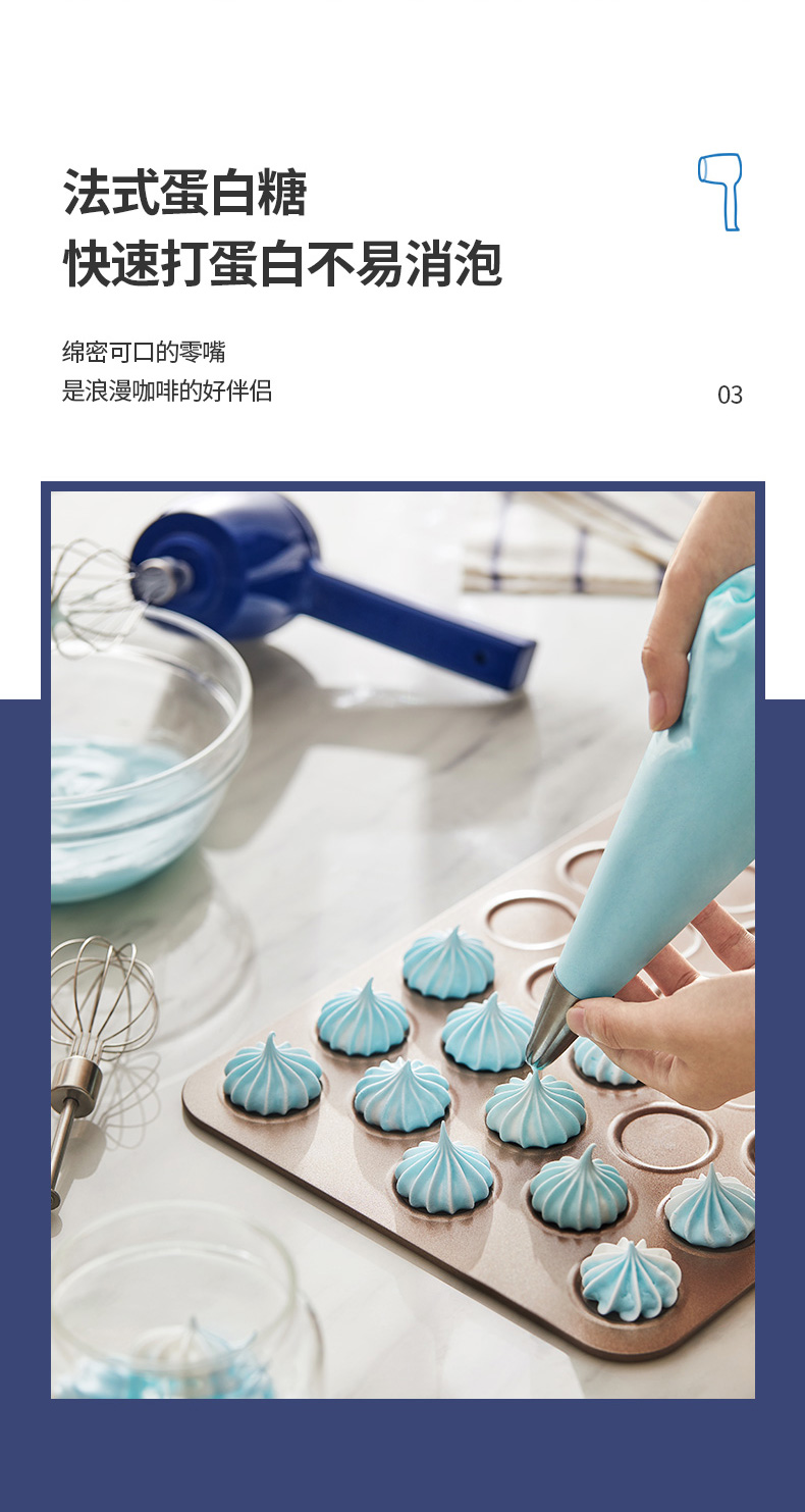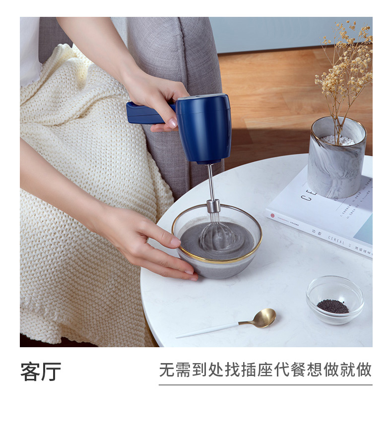 充满电可连续工作约12次(4个蛋清,每次约4分钟);人性化设计;无线使用,摆脱电源线约束,打蛋自由随你选;舒适把手:单手打搅不费力;双棒配置:长形搅拌网,灯笼状打奶网;304不锈钢双网;简单更换安装:1.网棒对准孔位插入 2.稍微用力一推听到“咔”一声,就装好了 3.使用后网棒拨出即可。