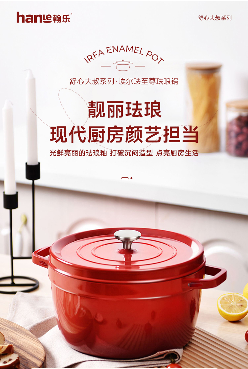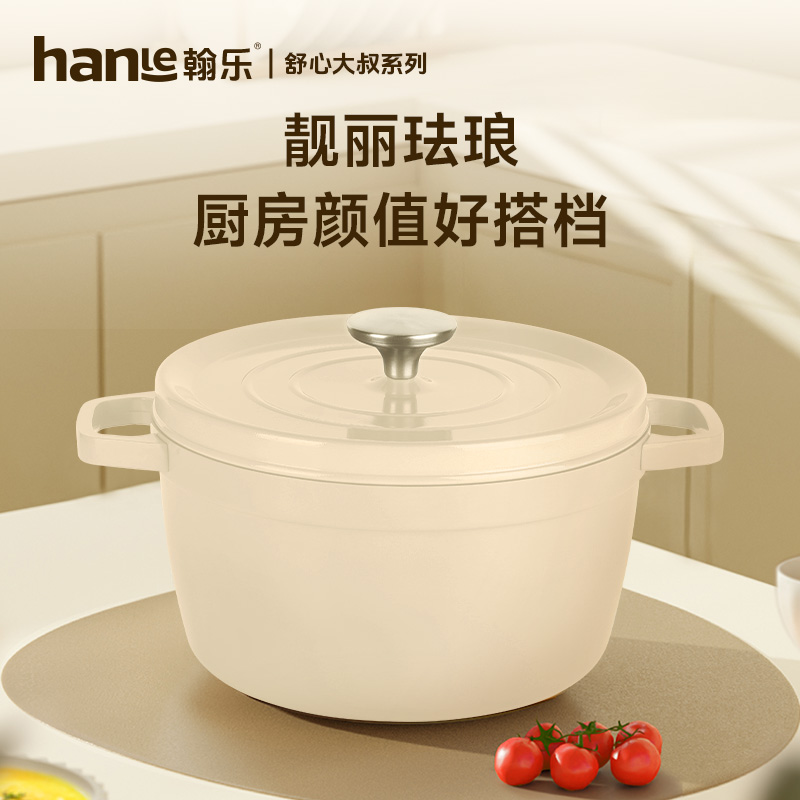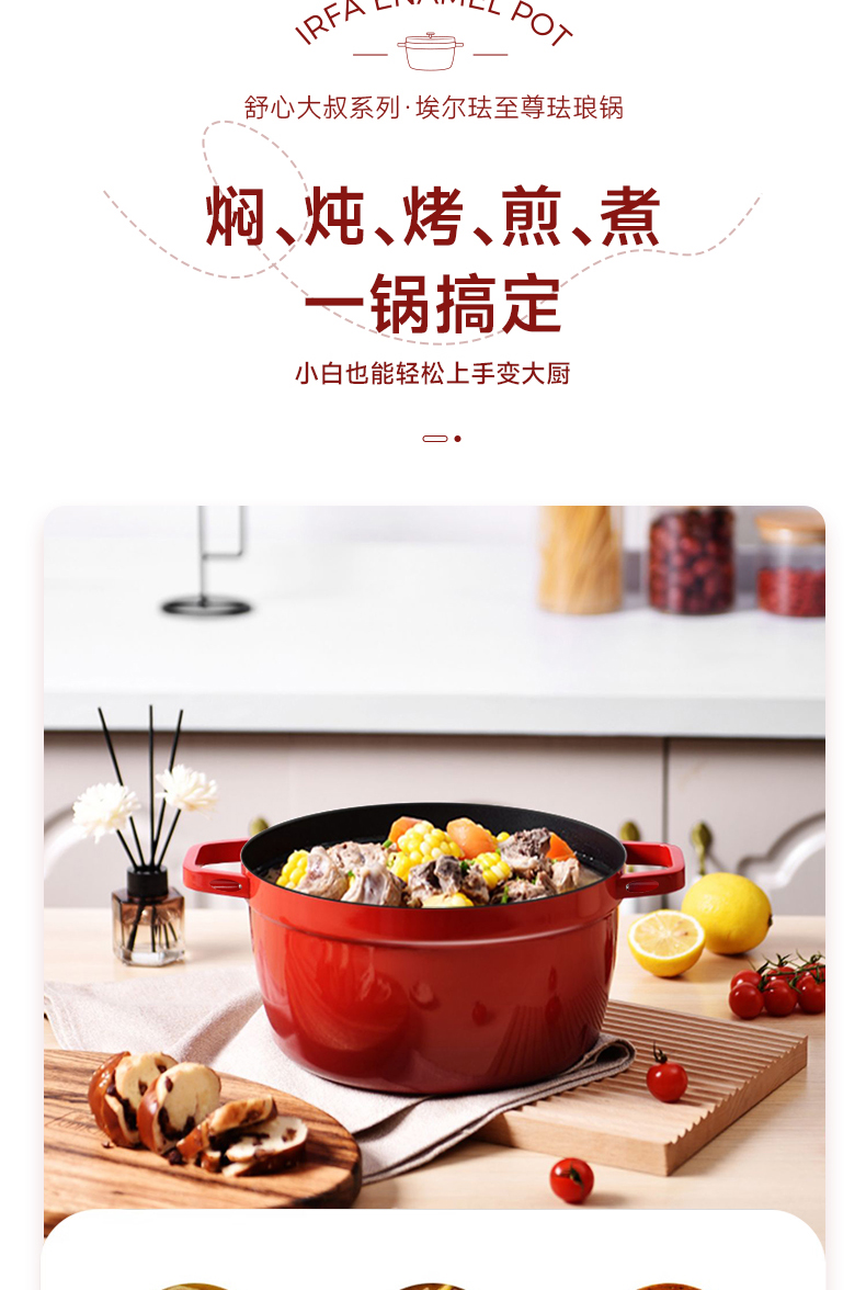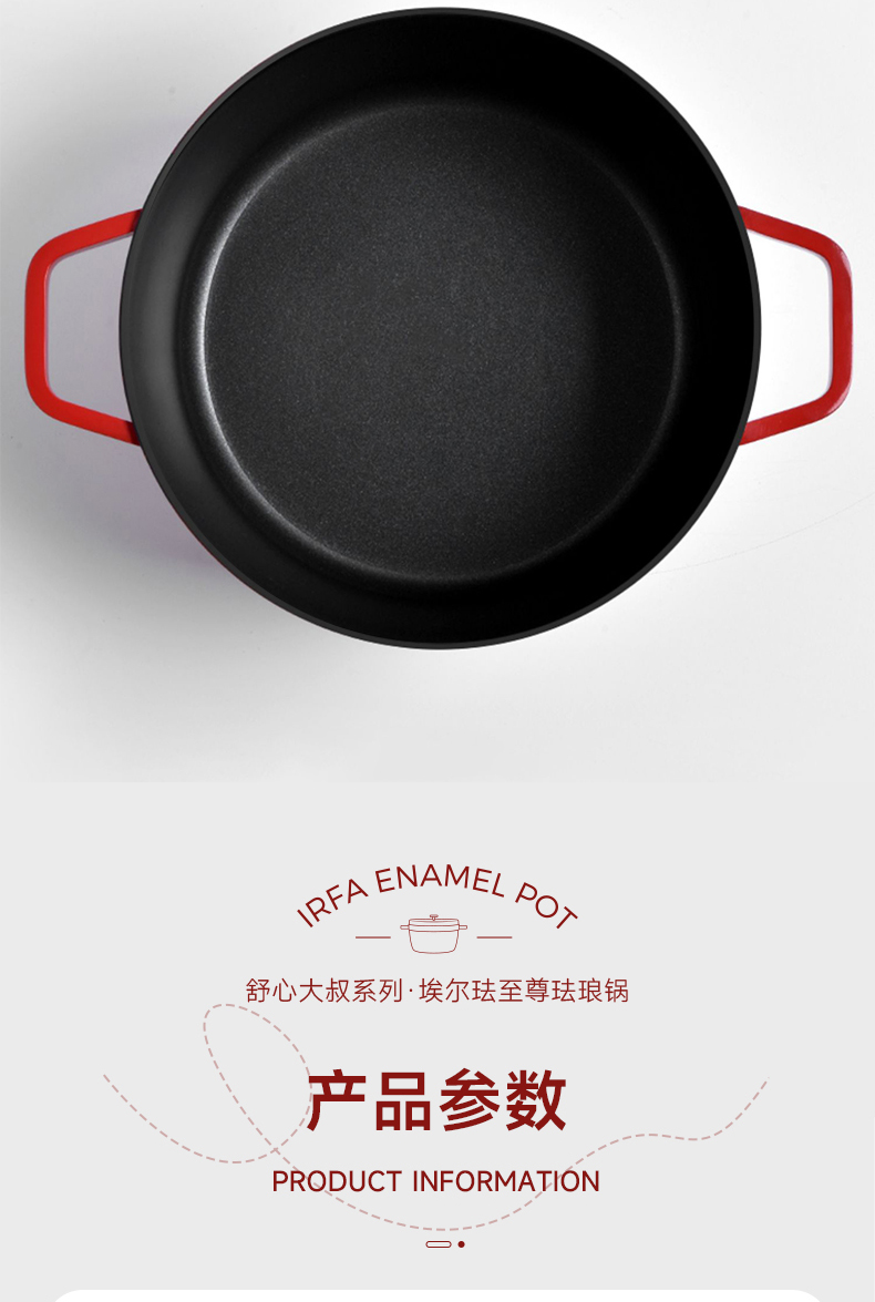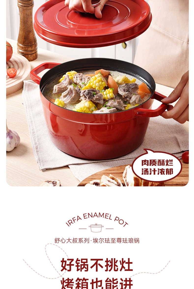 埃尔法至尊珐琅锅大容量双色可选,满足家庭日常所需,聚热保温锅内水分自循环,一锅多用,不挑炉灶,不粘易清洗,微压烹饪,直径约24cm,高度约18cm,精铁材质,2.5kg