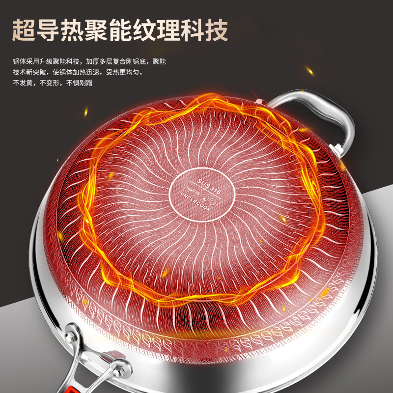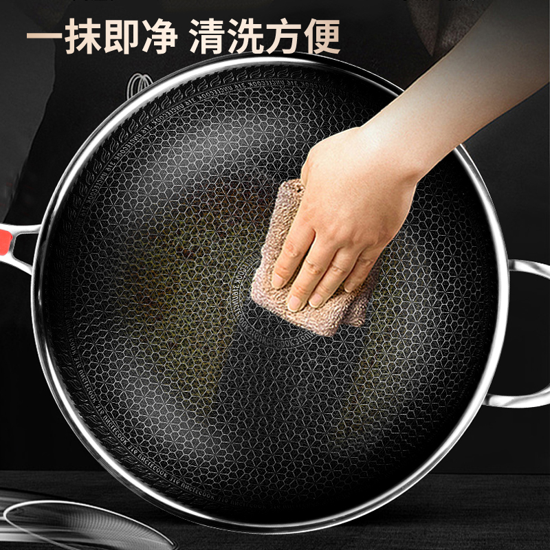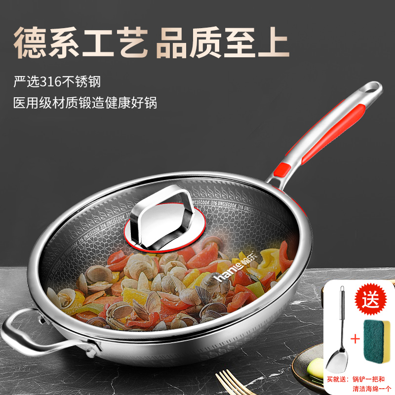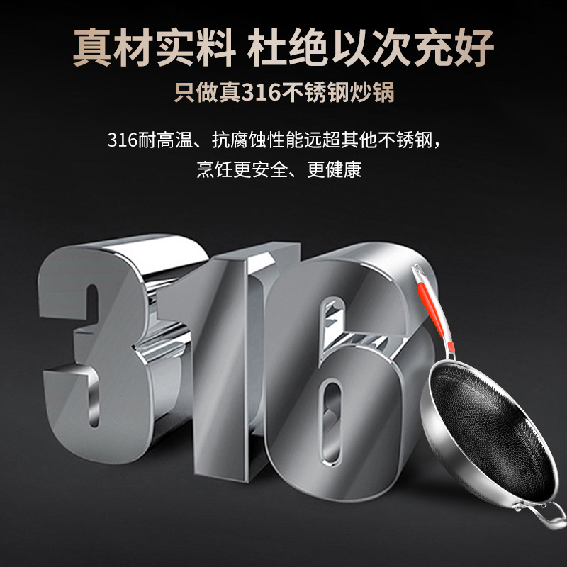 316不锈钢,蜂窝设计物理不粘,无涂层可用钢铲,不糊底更耐刮,煤气电磁炉通用