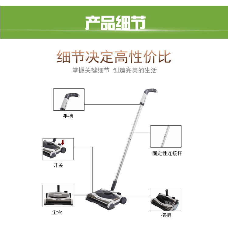 2、人性化设计:采用特殊软质刷毛设计,360度万向旋转扫把头。