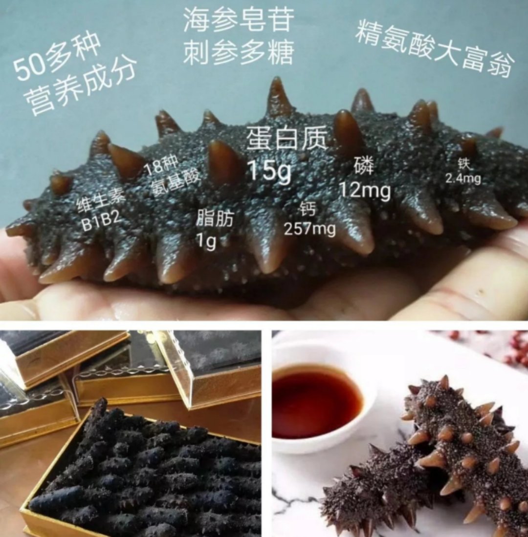 海参肉质软嫩,营养丰富,是典型的高蛋白、低脂肪食物,滋味腴美,风味高雅,是久负盛名的名馔佳肴,与燕窝、鲍鱼、鱼翅齐名,是传统的“海味八珍”之一,被视作为中餐的灵魂之一。