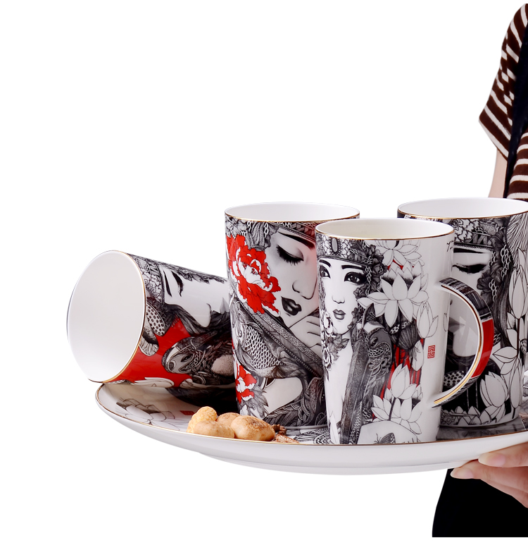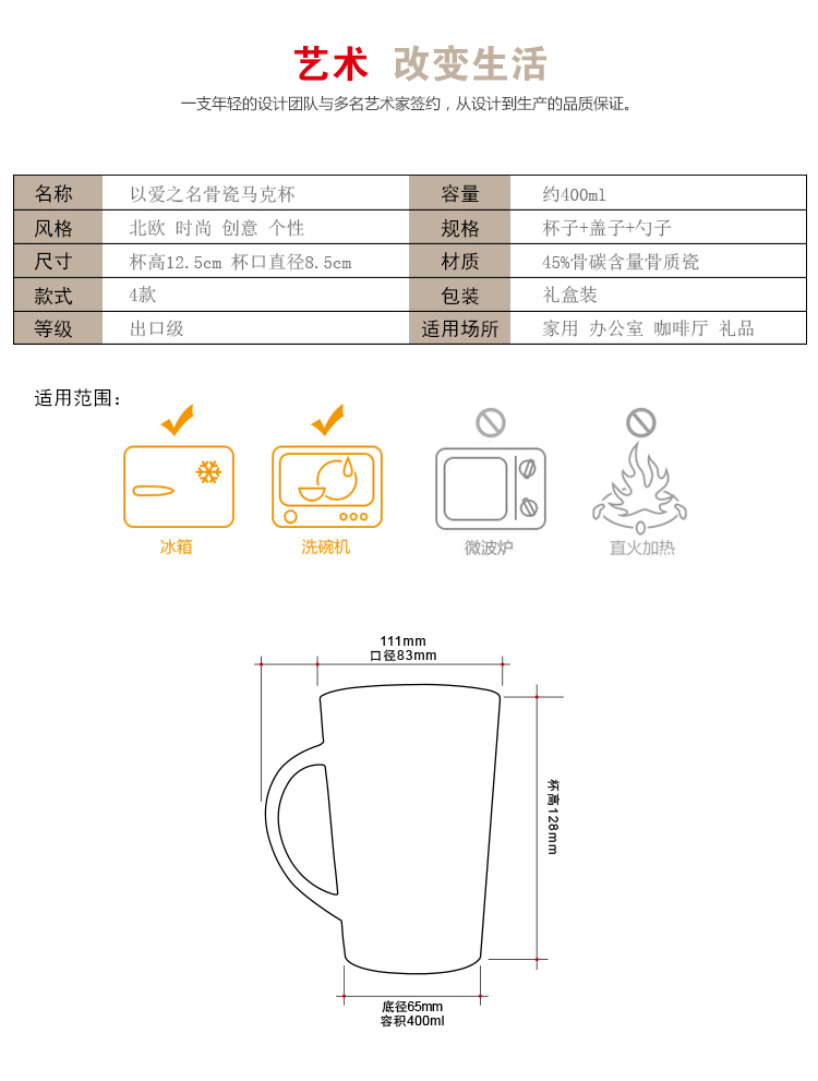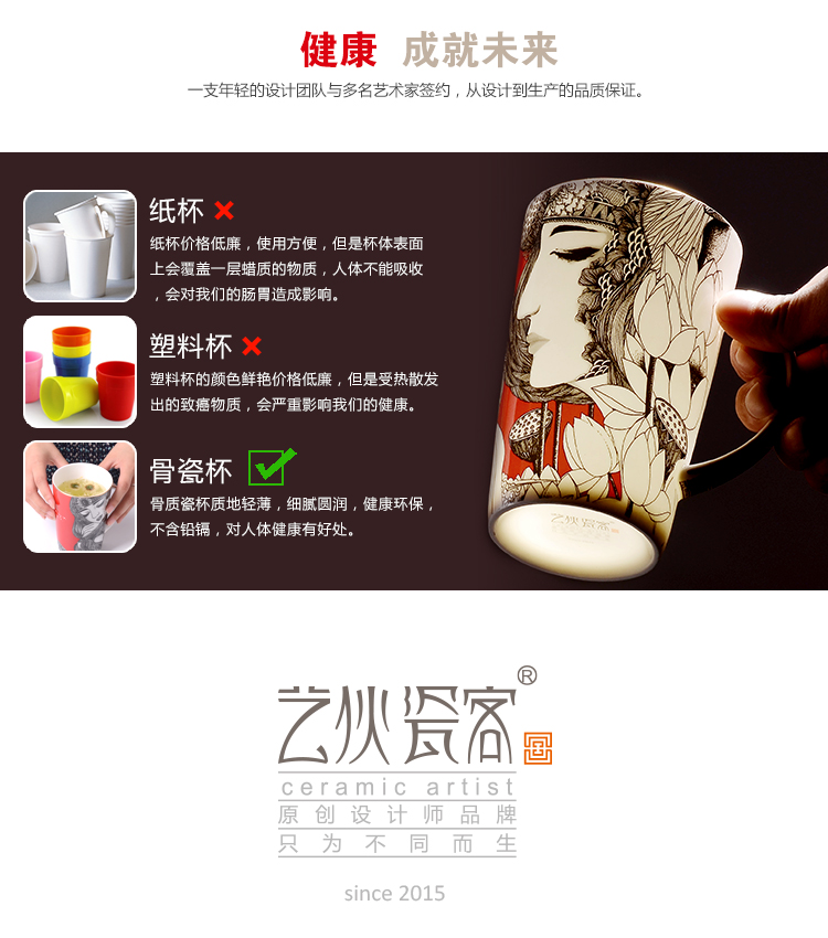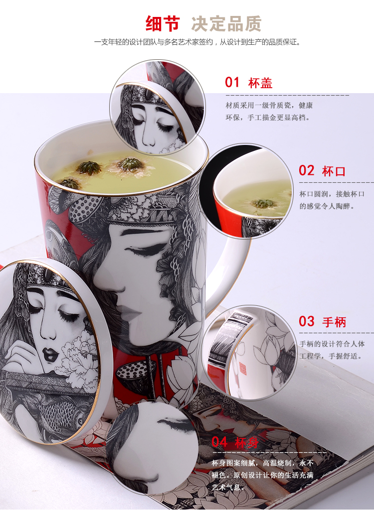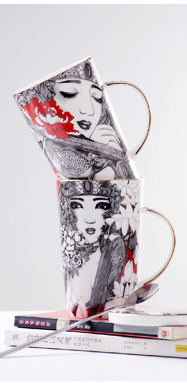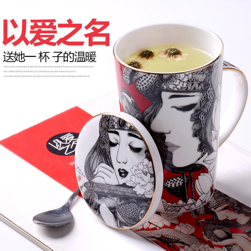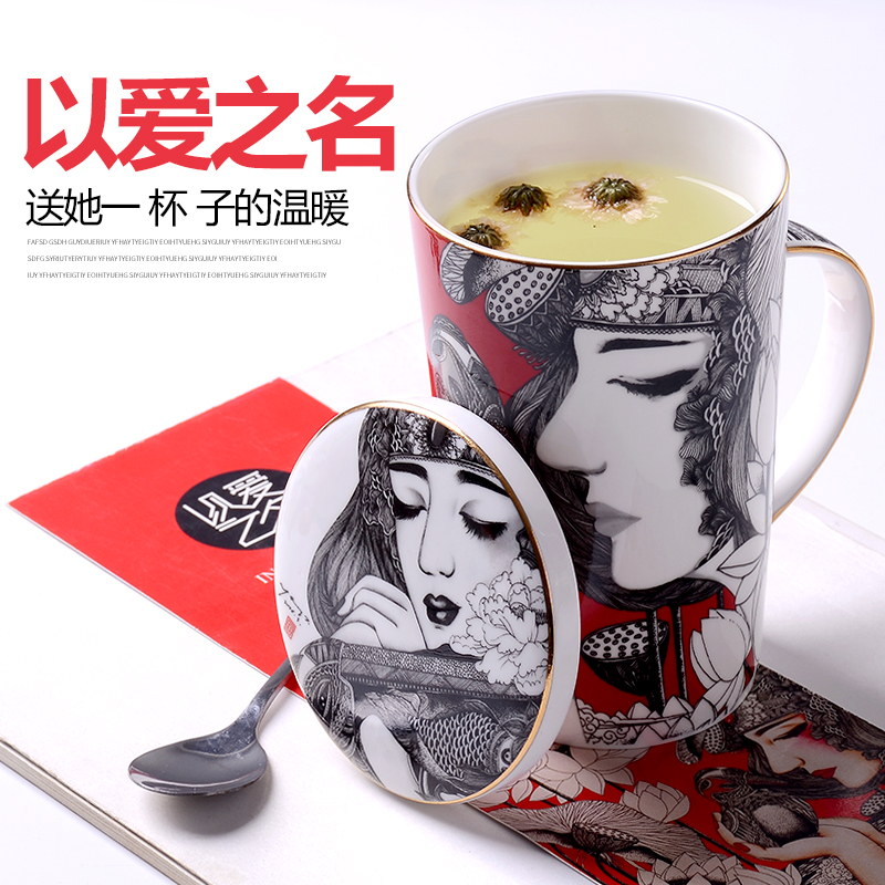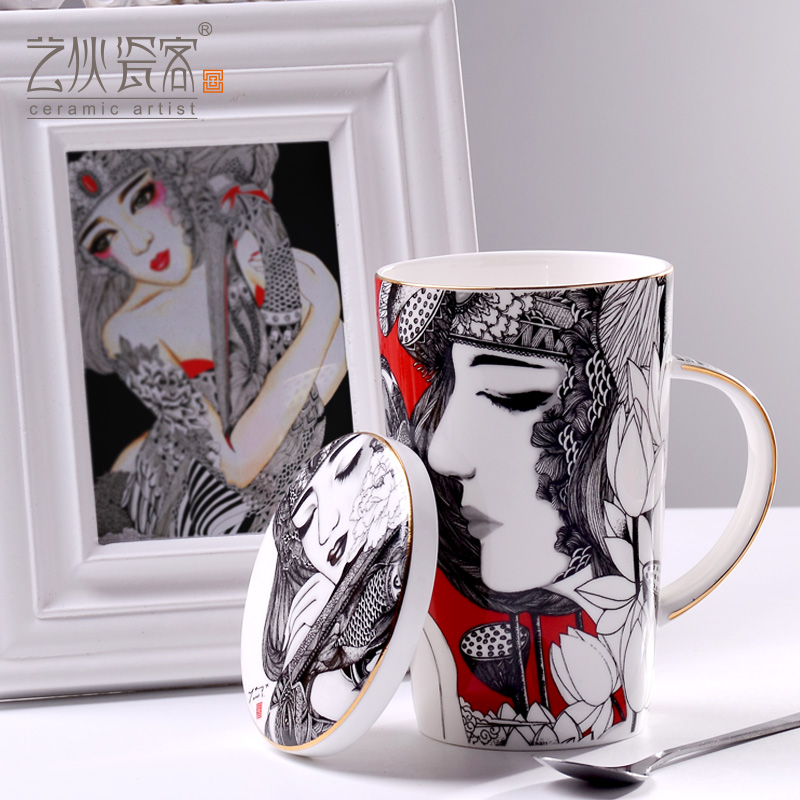 艺伙瓷客创意礼物插画杯子骨瓷水杯带盖大容量杯情侣马克杯
