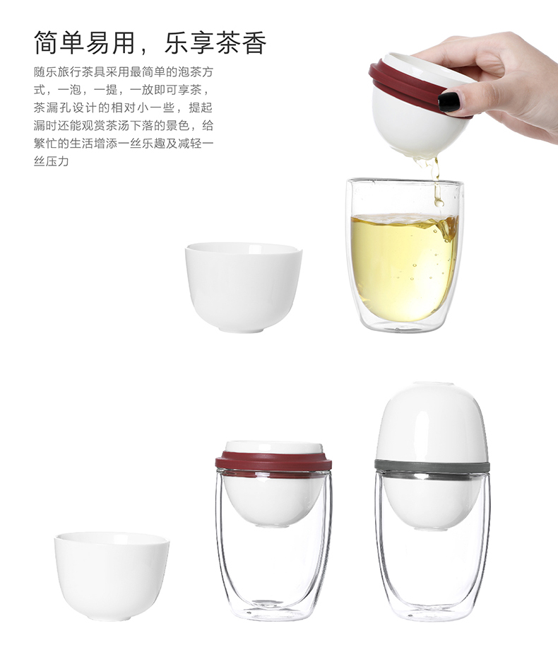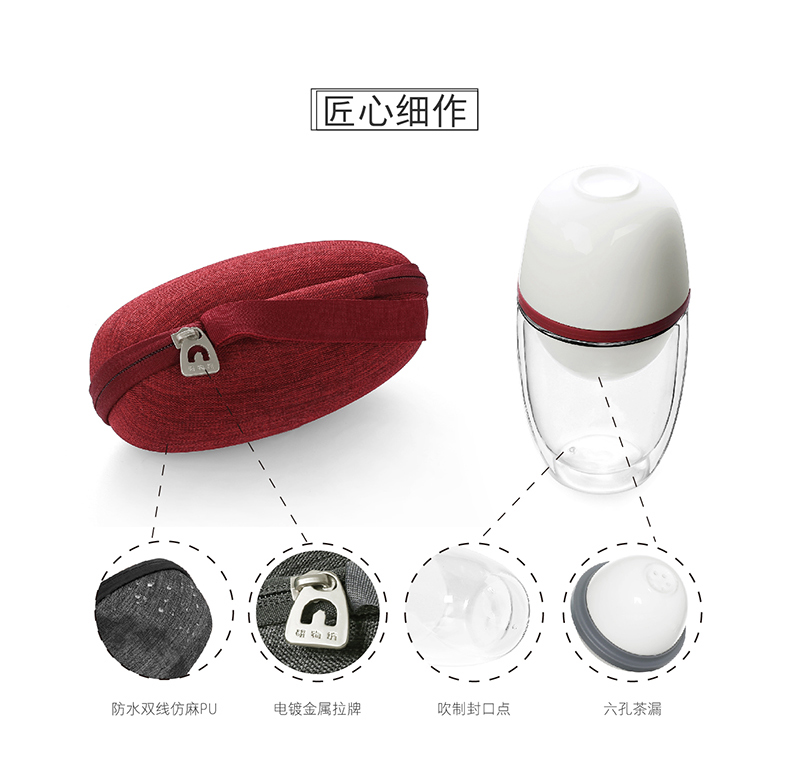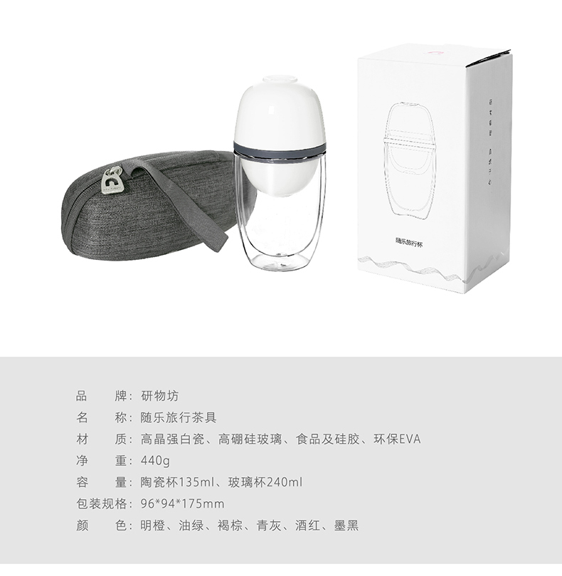 配置参数:彩盒X1, 便携旅行包X1,玻璃杯X1, 陶瓷茶漏X1,陶瓷杯X1