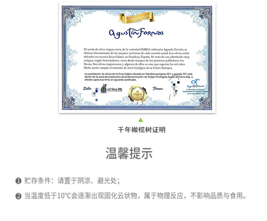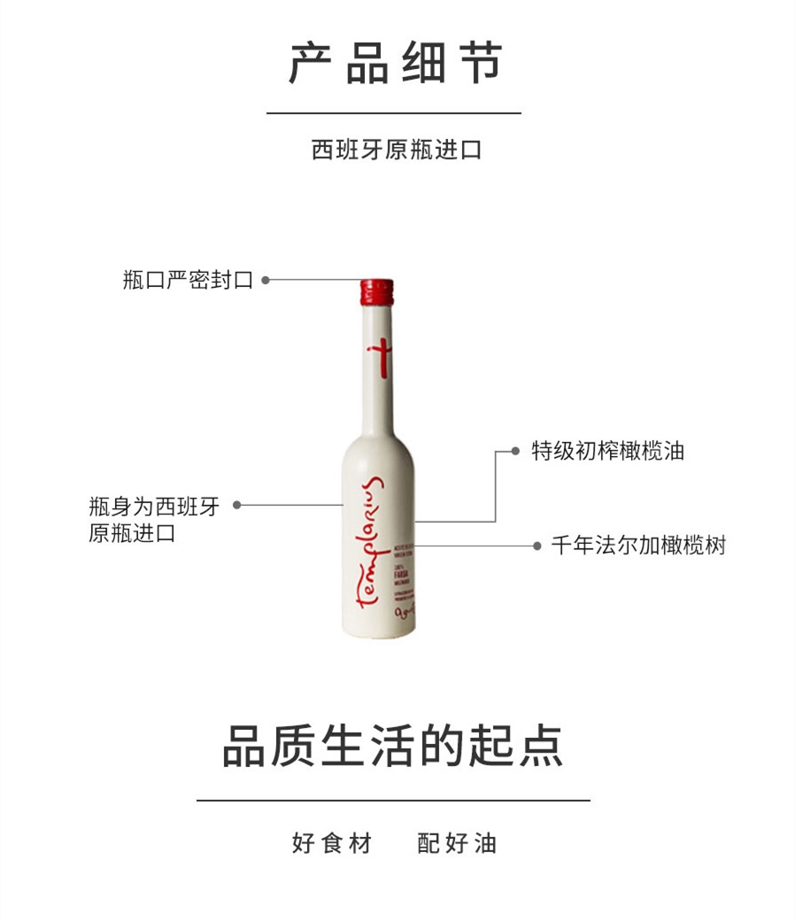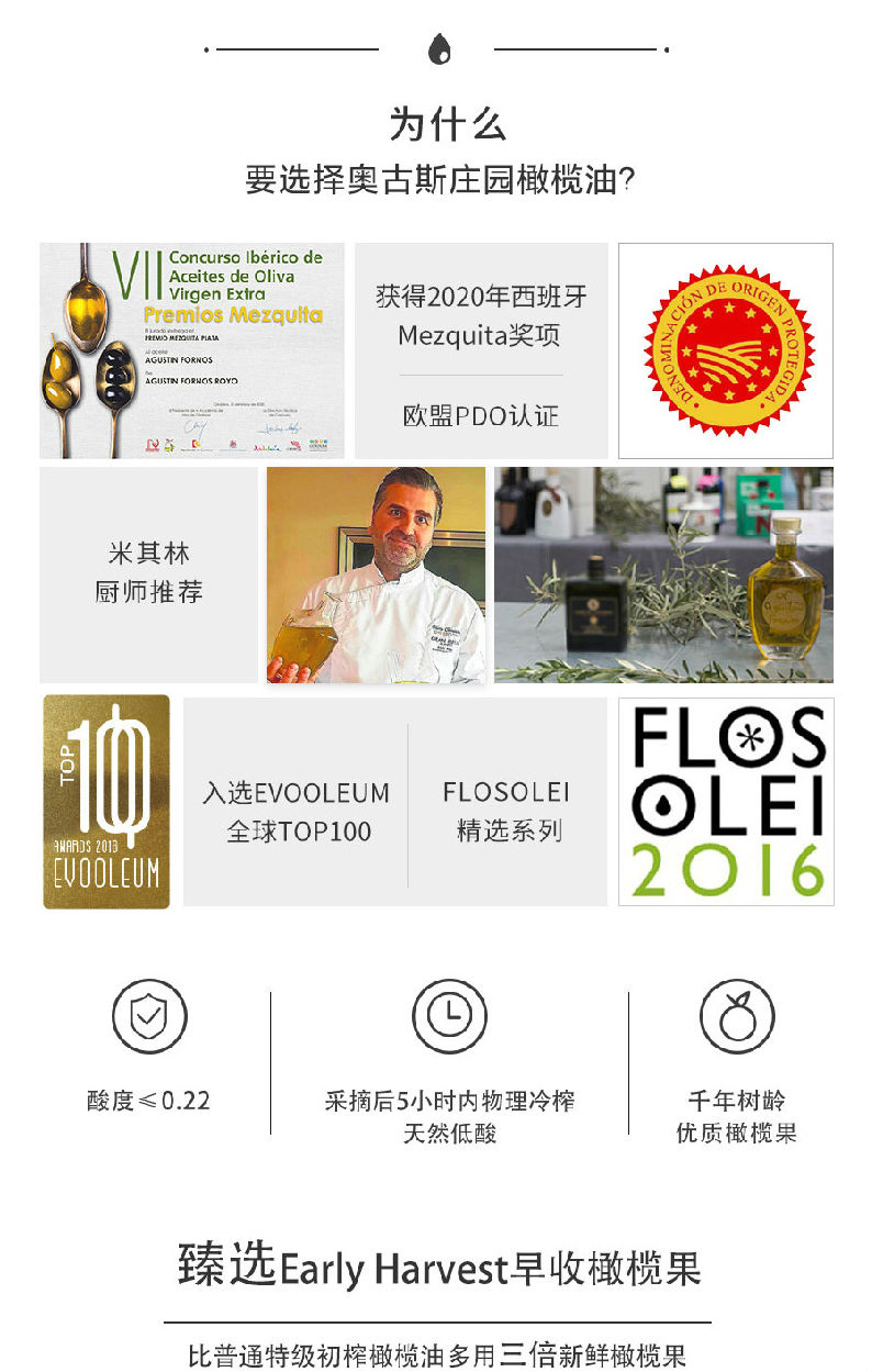 臻选千年树龄法尔加橄榄果,手工采摘,皇家品质。呈杏仁和绿核桃的香气,味道清淡,质地顺滑,略苦,营养更高。