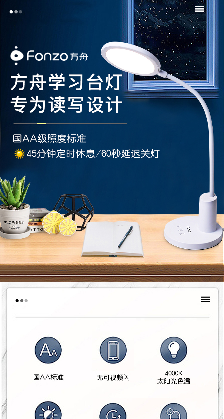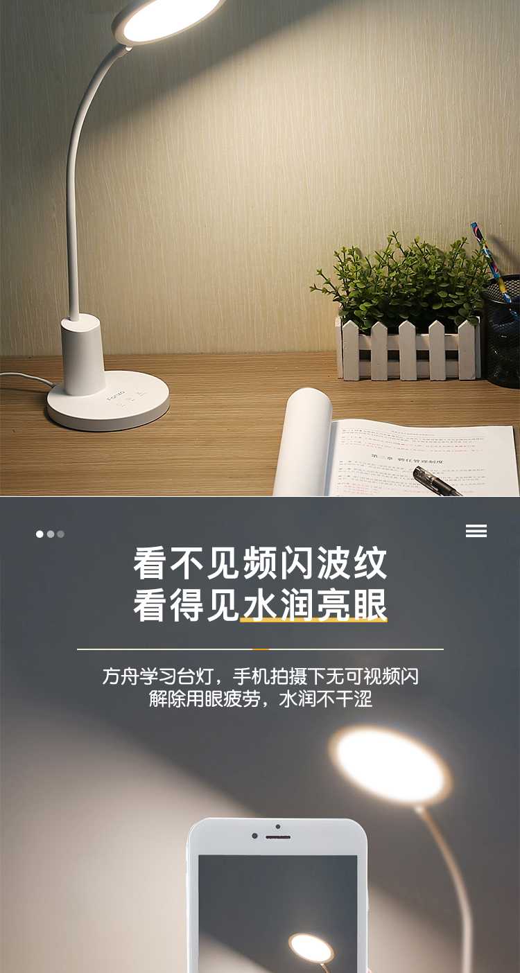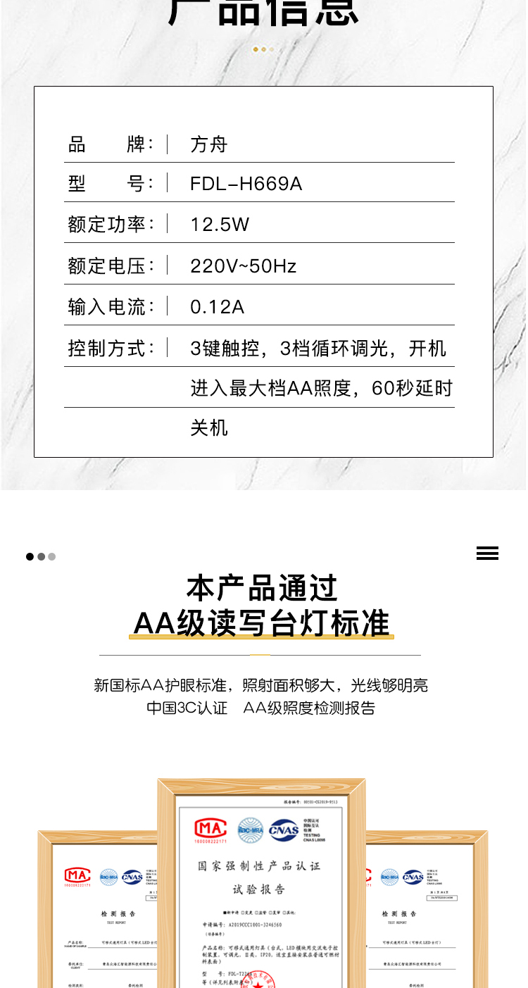 产品名称: 方舟LED学习台灯 产品型号: FDL-H669A 产品尺寸: 155*155*310mm 产品毛重:1.67kg 装 箱 数:16pcs 额定电压:220V-50HZ 额定功率:12.5W 输入电流:0.12A 控制方式:3键触控,3挡循环调光,开机进入最大挡AA照度,60秒延时关机
