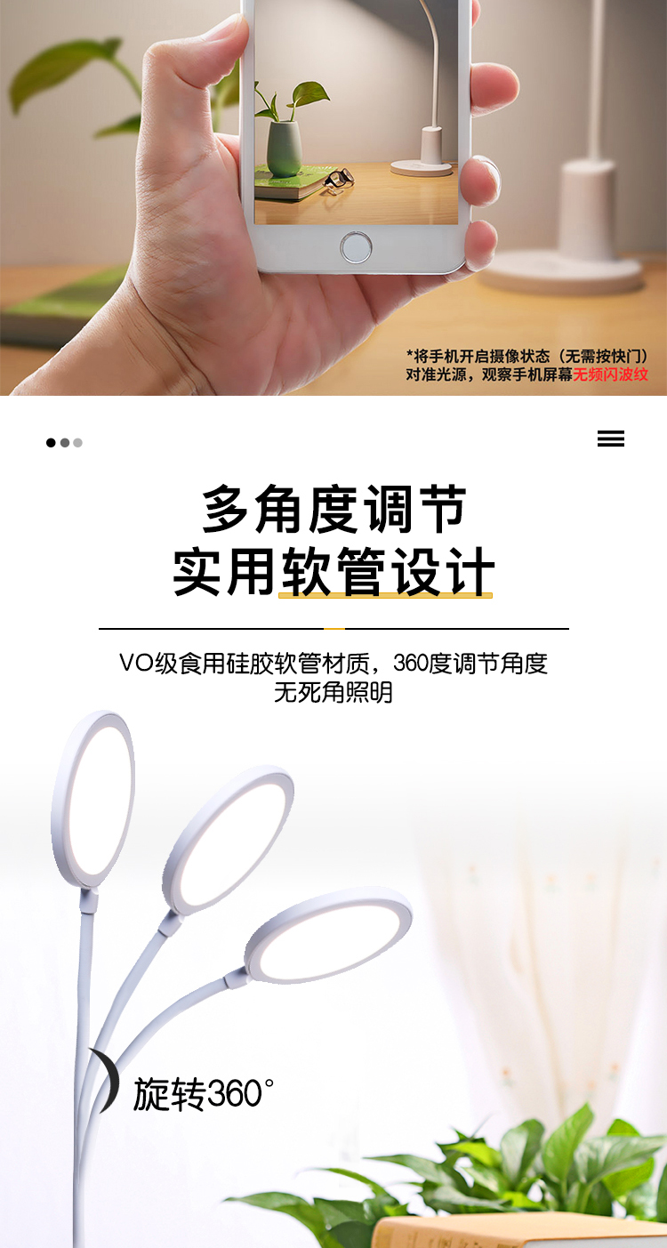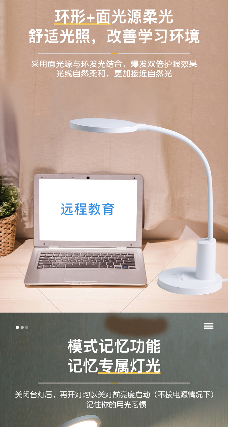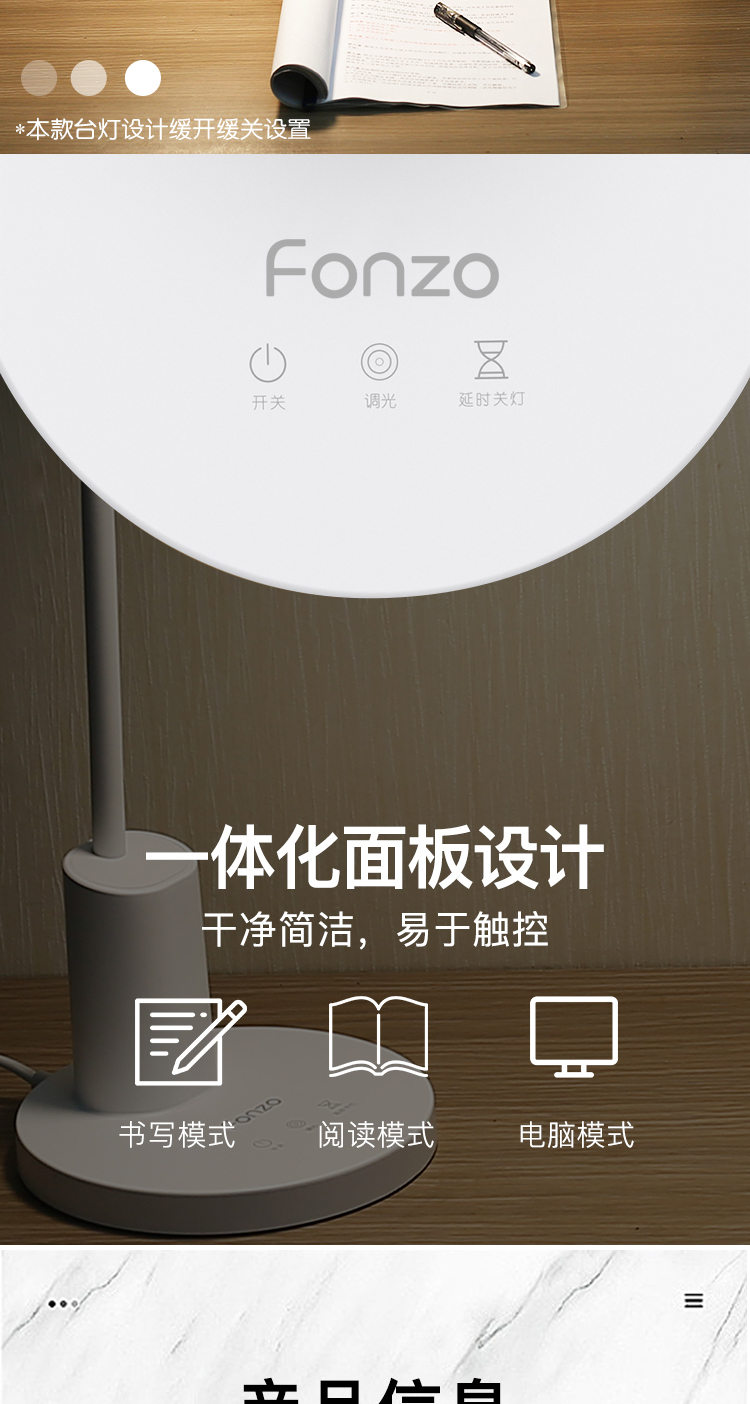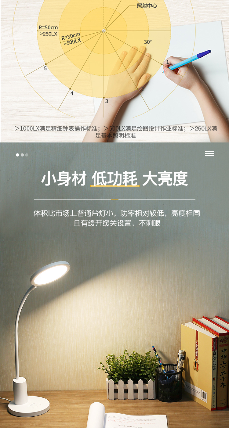 产品名称: 方舟LED学习台灯 产品型号: FDL-H669A 产品尺寸: 155*155*310mm 产品毛重:1.67kg 装 箱 数:16pcs 额定电压:220V-50HZ 额定功率:12.5W 输入电流:0.12A 控制方式:3键触控,3挡循环调光,开机进入最大挡AA照度,60秒延时关机
