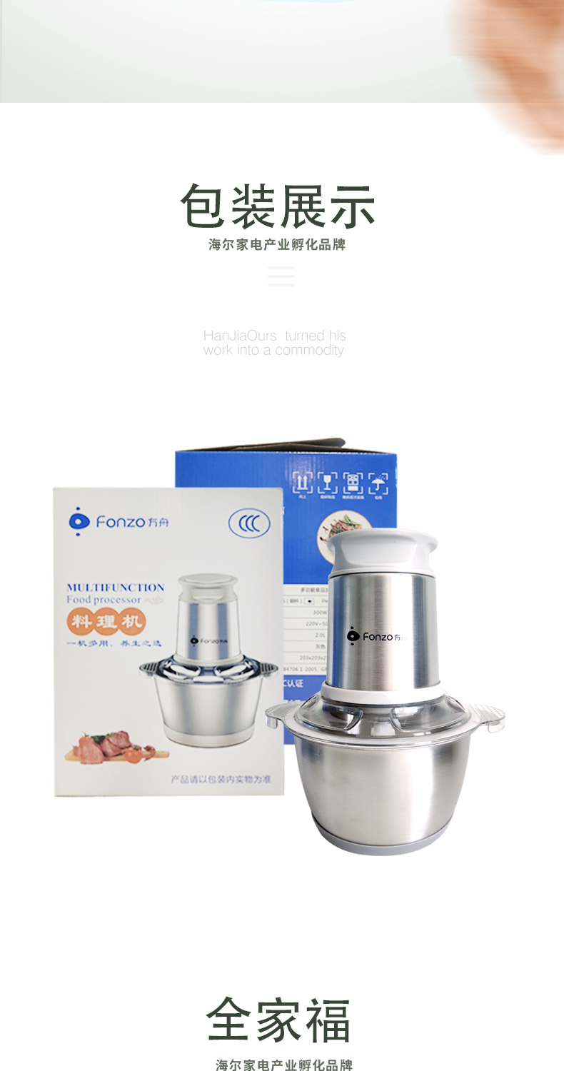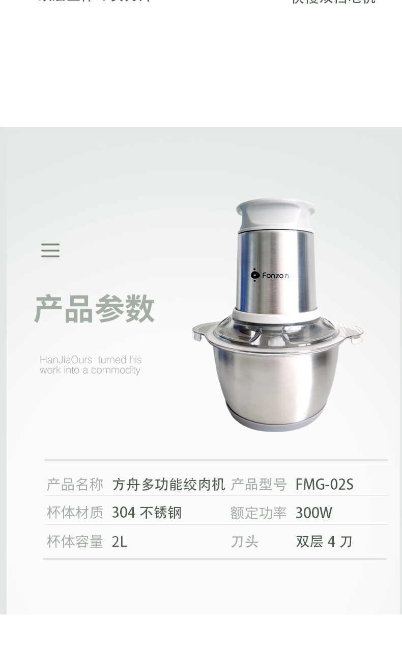 产品名称:方舟多功能绞肉机 产品型号:FMG-02S 产品尺寸:203*203*272mm 产品毛重:2.0kg 装箱数:12pcs 额定功率:300W 额定频率:220V~50HZ 额定容量:2.0L 颜色:灰色