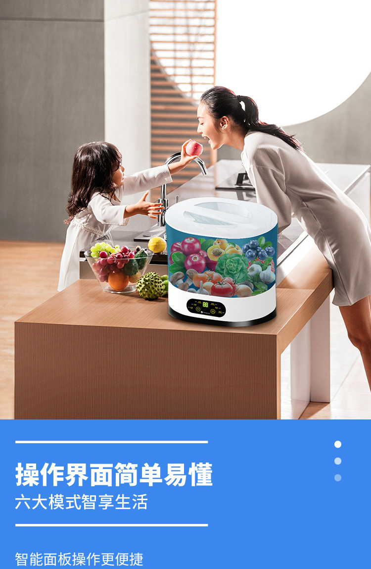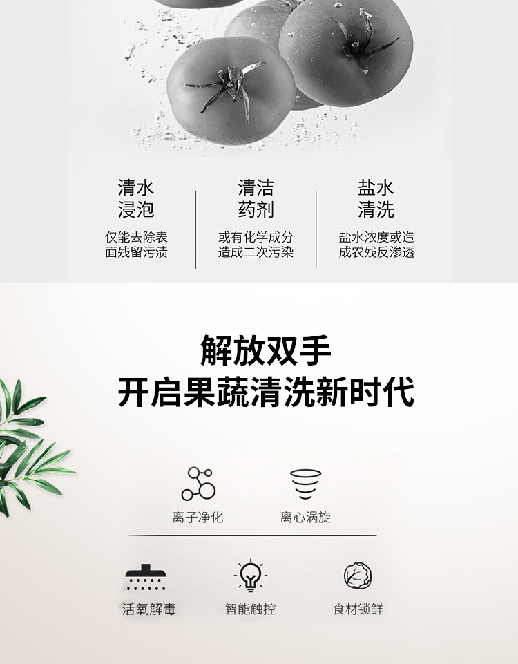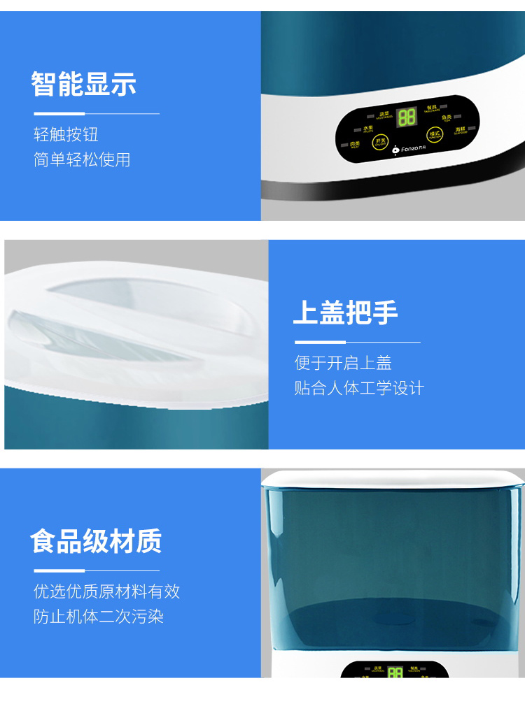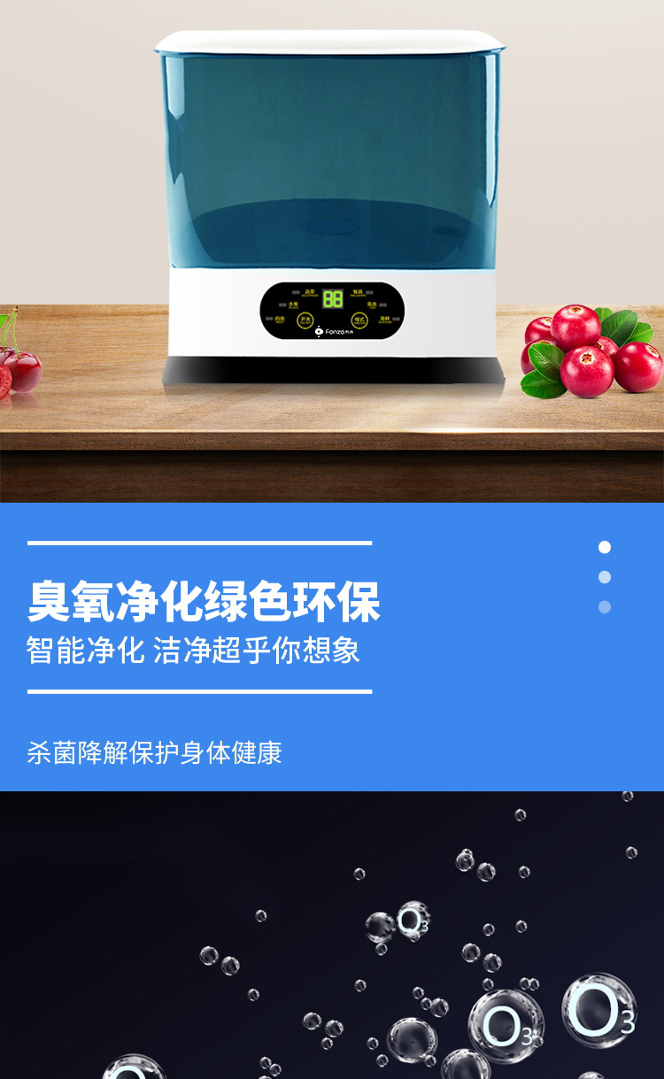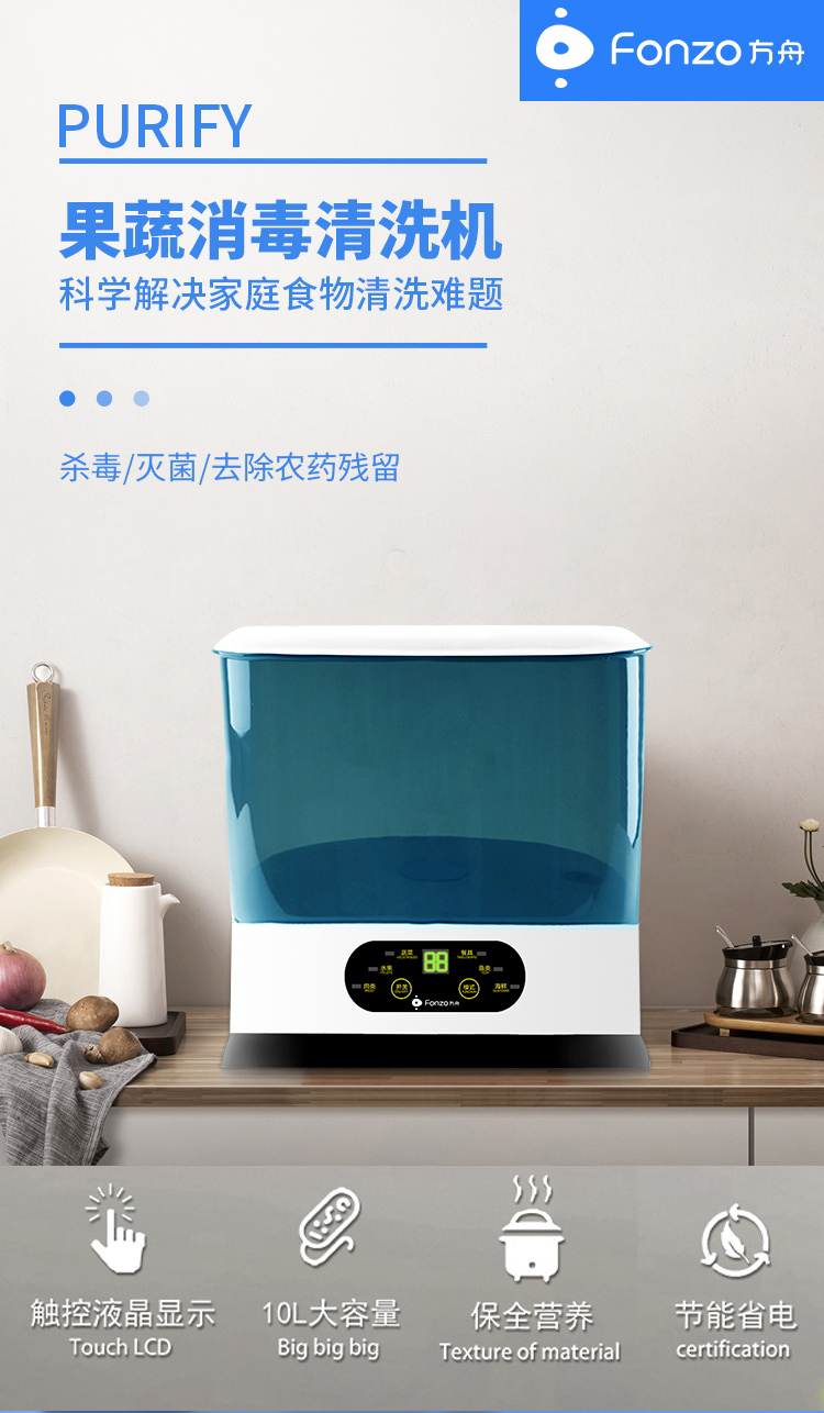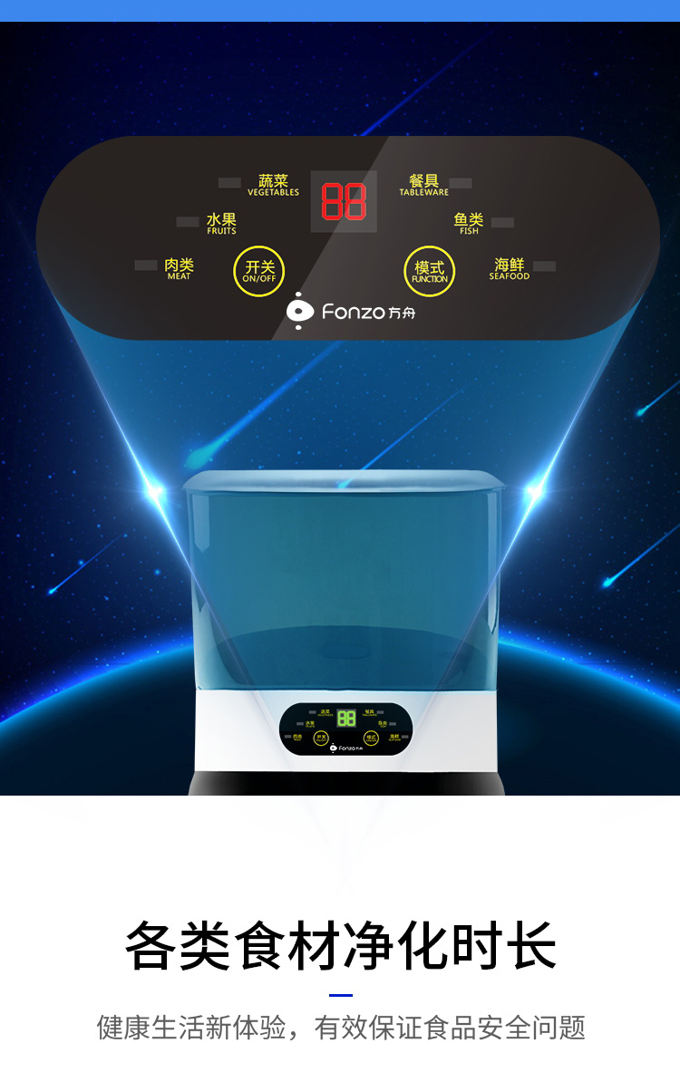 产品名称:方舟果蔬消毒机 产品型号:GS-400 产品尺寸:315*300*245mm 产品毛重:5.0kg 装箱数:4pcs 产品容量:10L 产品颜色:蓝色 额定电压:220V~50Hz 额定功率:15W 控制方式:触控液晶显示