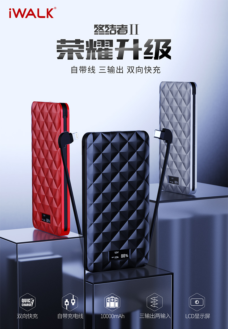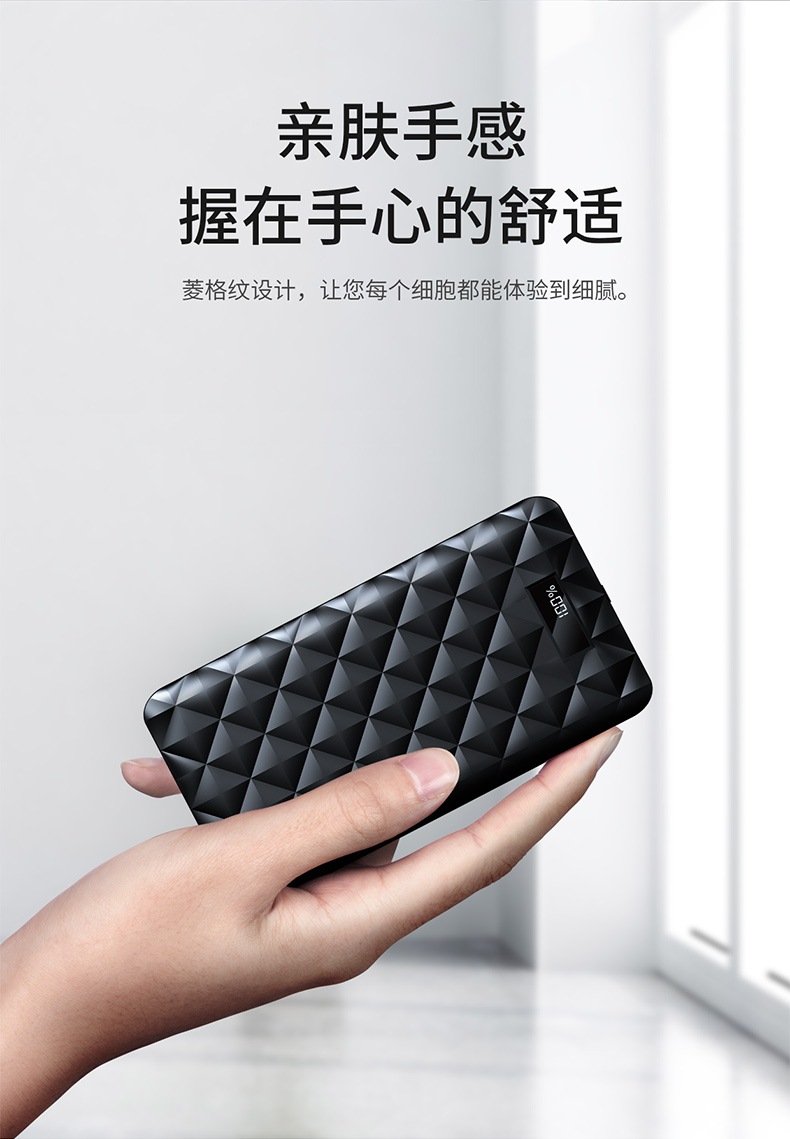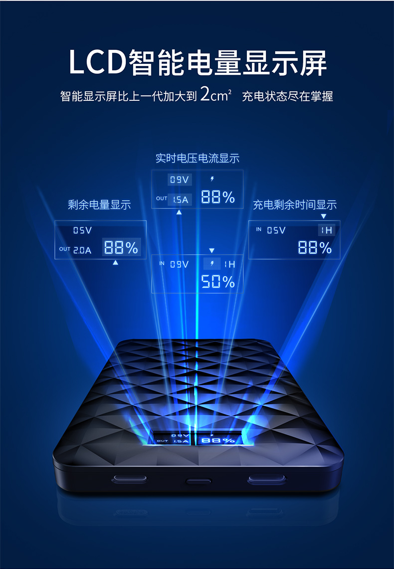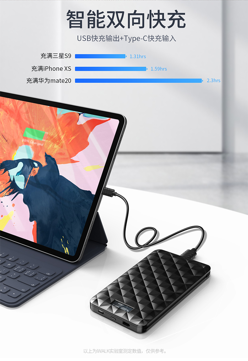 ・ 大智能LCD显示屏,科技感十足; ・ 自带线,三输出;苹果Lightning线,Type-C充线,USB输出;总输出18W; ・ 两输入;苹果Lightning充电口,Type-C输入给充电宝充电; ・ 本体3.5小时快速充电; ・ 边充边放;支持手机和充电宝同时充电; ・ 背部防滑设计, 表面钻石菱纹格奢华设计,礼盒包装; ・ 智能双向PD快充,USB快充输出、Type-C快充PD输入; ・ 专利认证,授权产品; ・ 支持低电流充电,转换可为蓝牙耳机,运动手环充电;