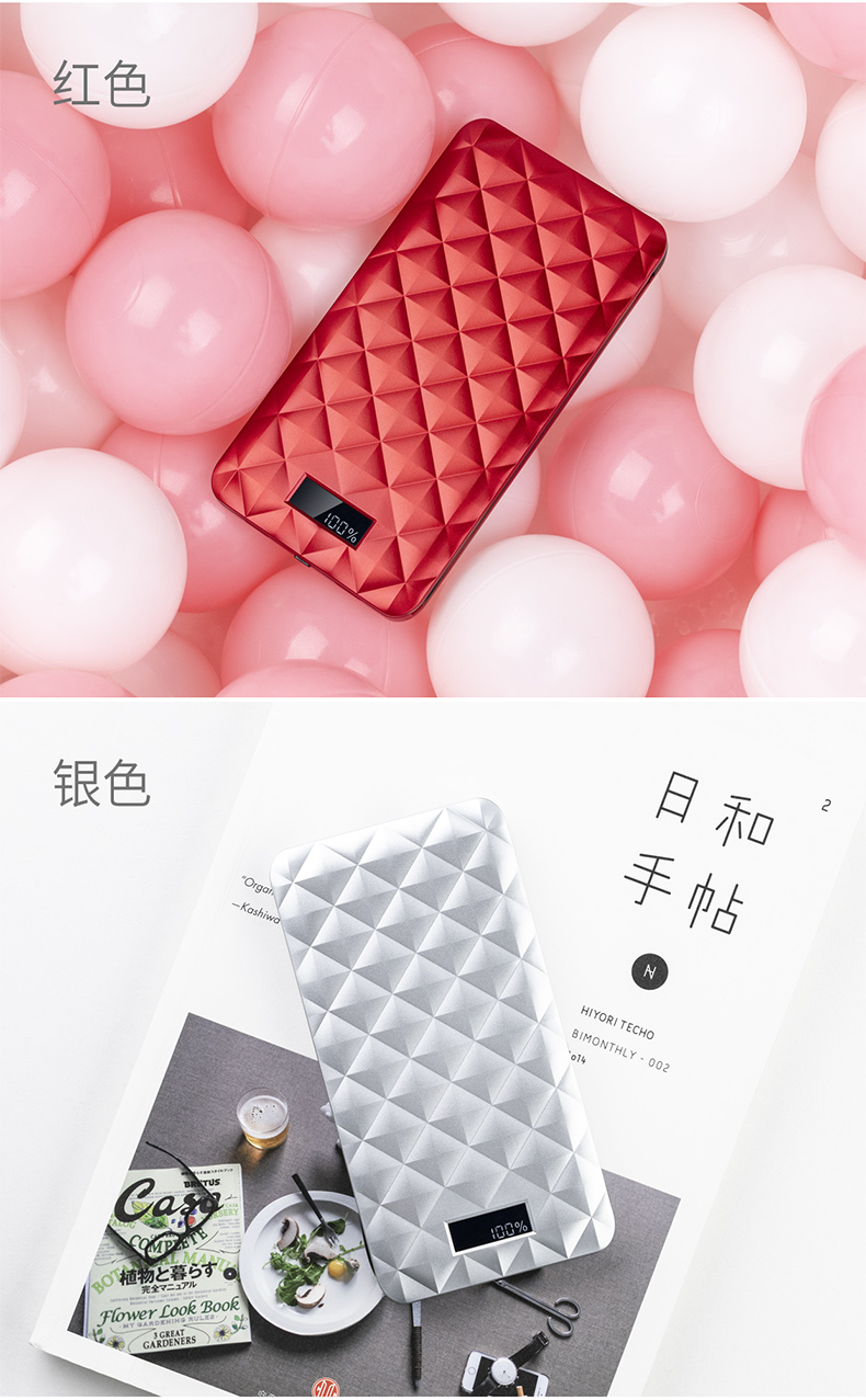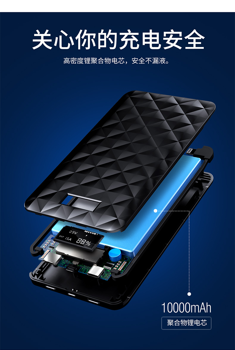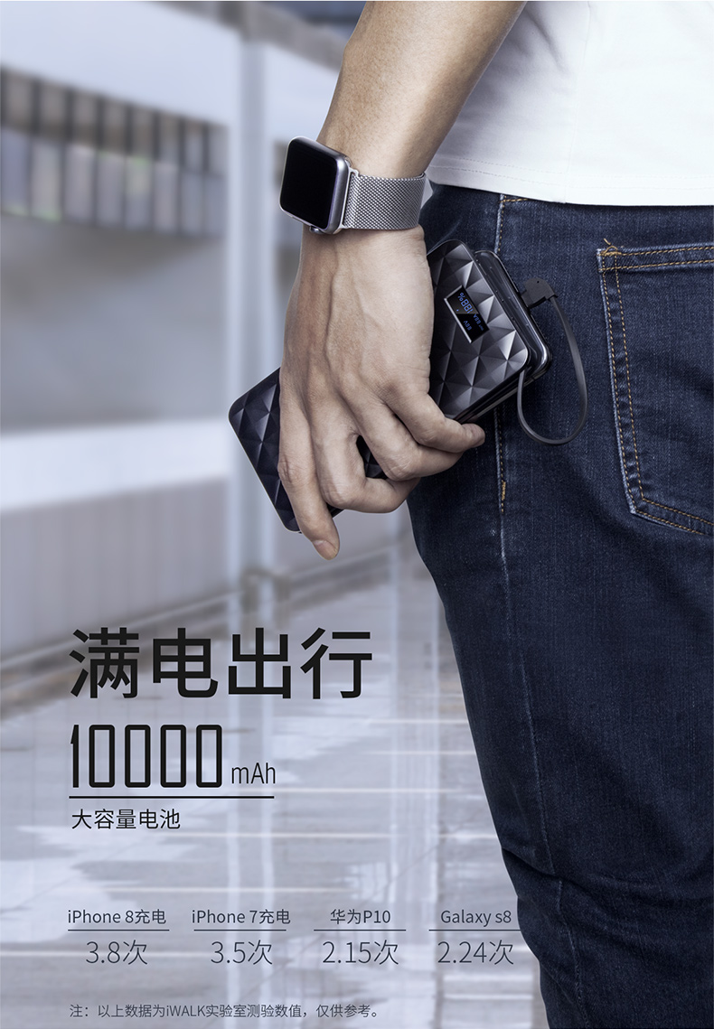 ・ 大智能LCD显示屏,科技感十足; ・ 自带线,三输出;苹果Lightning线,Type-C充线,USB输出;总输出18W; ・ 两输入;苹果Lightning充电口,Type-C输入给充电宝充电; ・ 本体3.5小时快速充电; ・ 边充边放;支持手机和充电宝同时充电; ・ 背部防滑设计, 表面钻石菱纹格奢华设计,礼盒包装; ・ 智能双向PD快充,USB快充输出、Type-C快充PD输入; ・ 专利认证,授权产品; ・ 支持低电流充电,转换可为蓝牙耳机,运动手环充电;