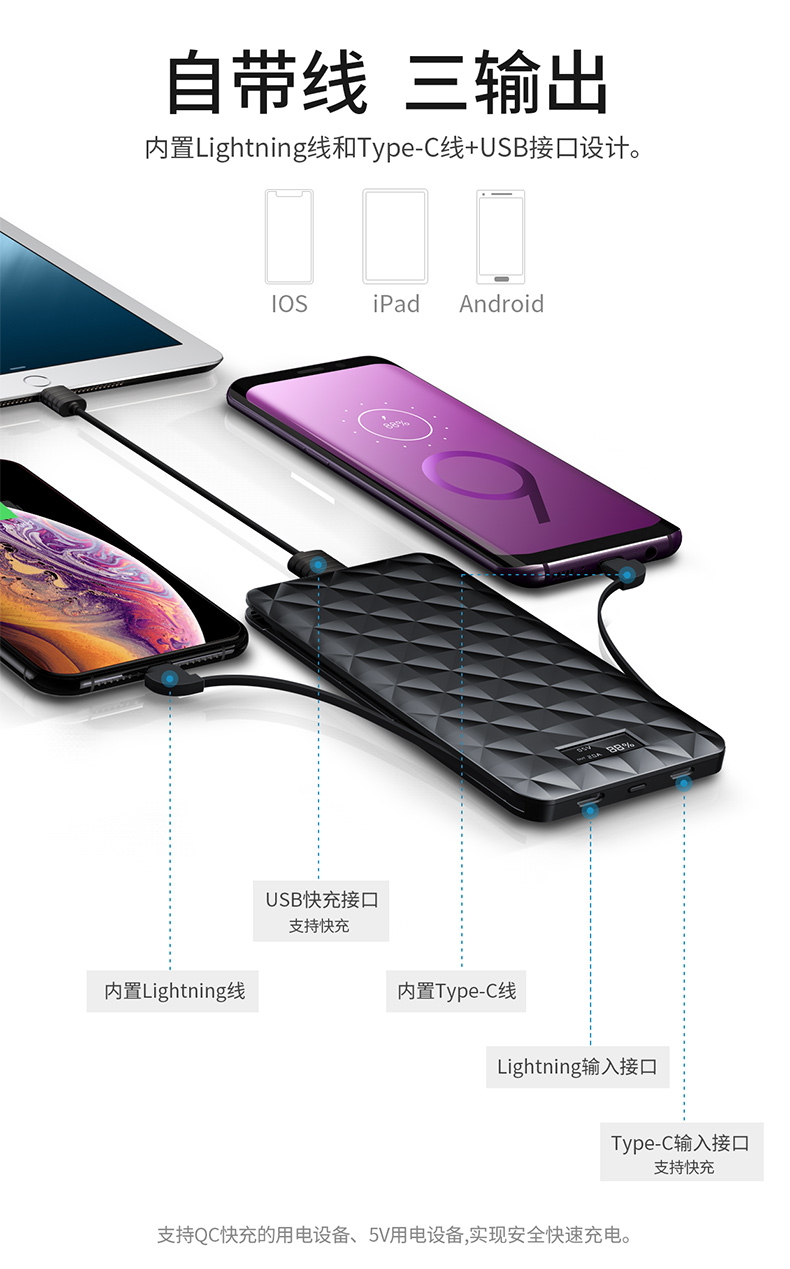 ・ 自带线,三输出;苹果Lightning线,Type-C充线,USB输出;总输出18W;