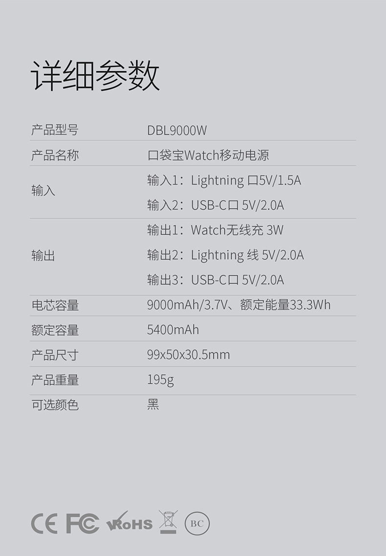 ・ 苹果手表,苹果手机,随时充,随地充。 ・ 内置苹果手表磁吸模块和电池,自带苹果充电线。 ・ 高密度电芯的加持,让口袋宝Watch小得不可思议,仅银行卡大小 ・ 一体设计精致玲珑,摆脱数据线牵扯烦恼,9000毫安,保证满电出行 ・ 具备三输出充电功能,可同时为Apple Watch、苹果手机、以及其他智能设备充电 ・磁力吸附,快速充电,手表充电,绿灯常亮。 ・双输入,充电接口,可用苹果充电线跟TYPE-C线给它充电,让充电更加灵活