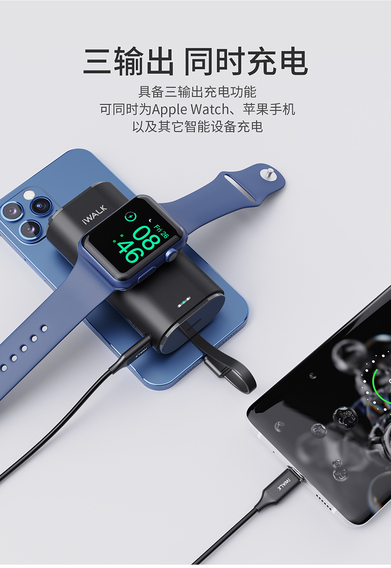 ・ 具备三输出充电功能,可同时为Apple Watch、苹果手机、以及其他智能设备充电
