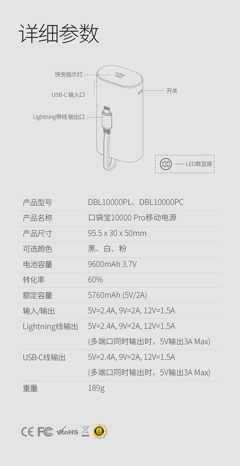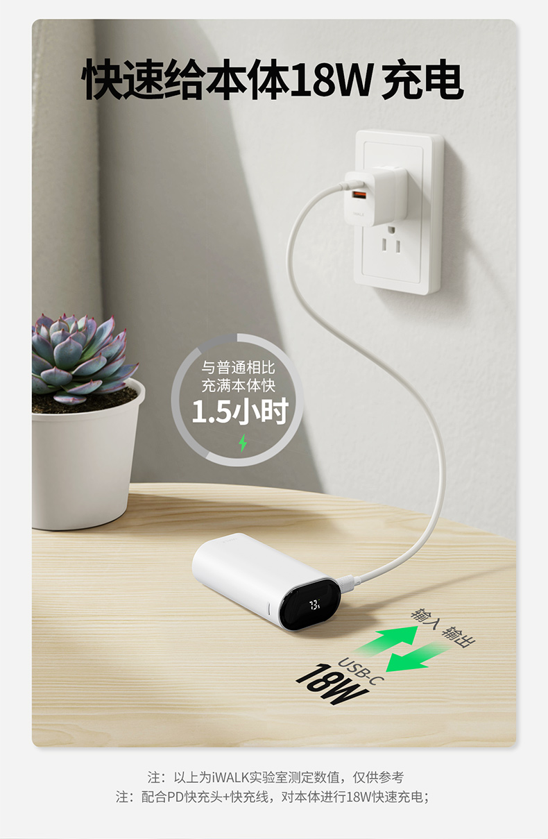 ・ 自带线18W双向快充,解锁快充新体验。 ・ 快速给本体18W充电,体积比小更小。 ・LCD数显,剩余电量一目了然,精准掌握剩余电量 ・ 出街即出彩,多色可选,简约百搭 ・ 小巧随身带,仅189克,轻若无物,再小的包包也能放。 ・小身材,大容量9600毫安。iCPU智能温控芯片,保持手机电池健康 ・双输出,支持两部手机同时充电,每一处细节皆精心打磨。