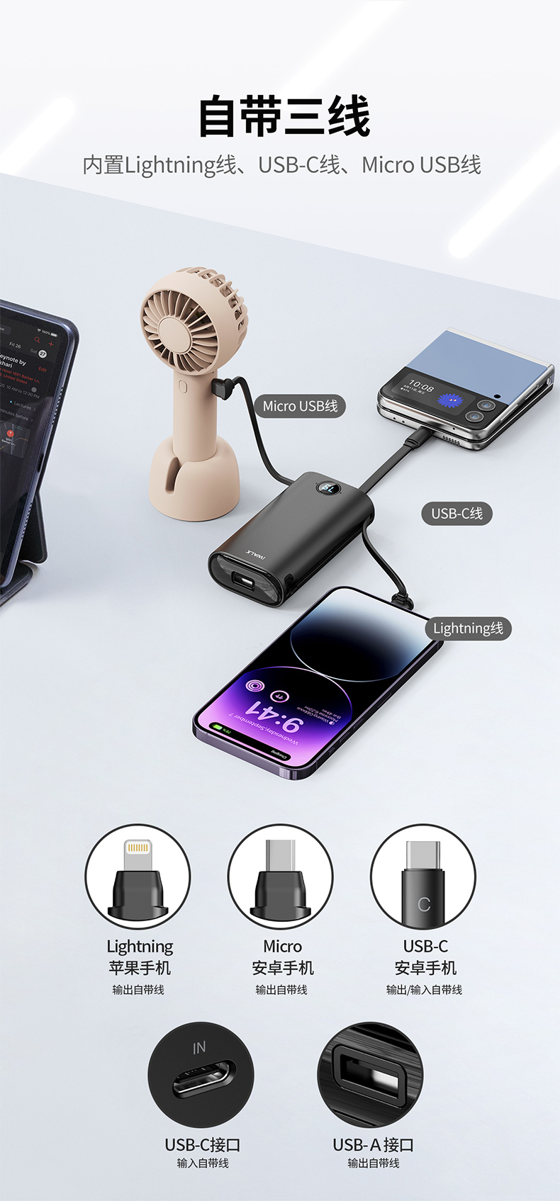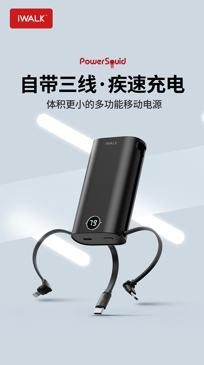 ・ 鱿鱼·脚就是线,自带线的快充移动电源。