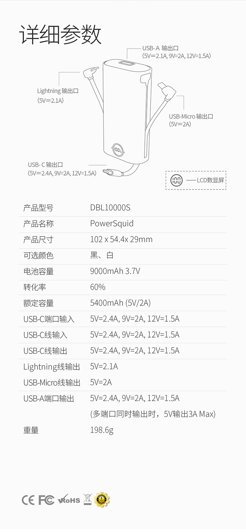 ・ 鱿鱼·脚就是线,自带线的快充移动电源。 ・ 不需要带任何线,自带线18W双向快充 ・LCD数显,剩余电量一目了然,精准掌握剩余电量 ・ 出街即出彩,多色可选,简约百搭 ・ 小巧随身带,仅18克,轻若无物,再小的包包也能放。 ・小身材,大容量9000毫安。iCPU智能温控芯片,保持手机电池健康 ・四输出,支持多部手机同时充电,每一处细节皆精心打磨。