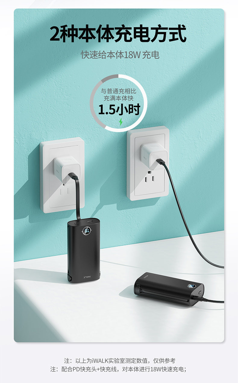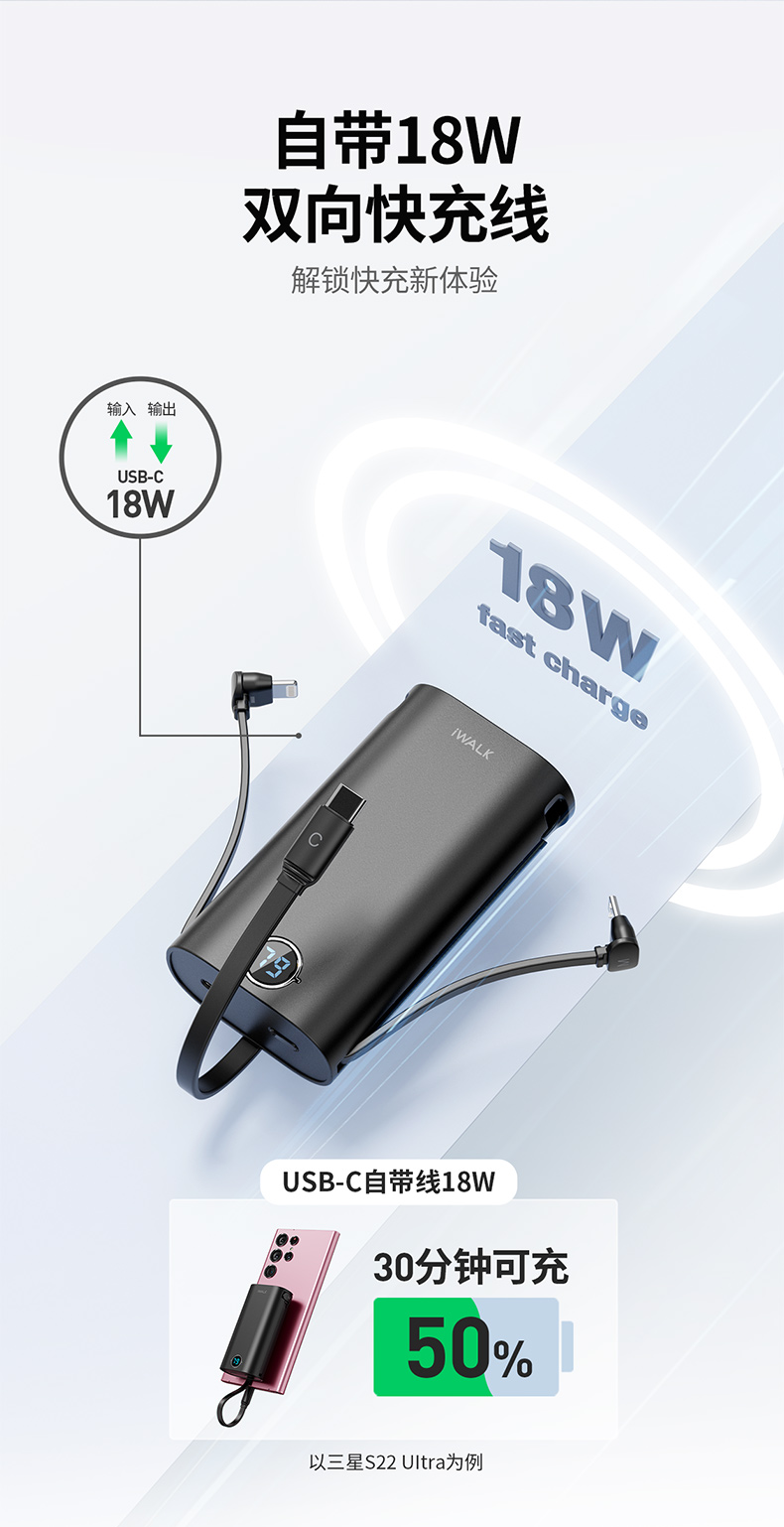 ・ 不需要带任何线,自带线18W双向快充
