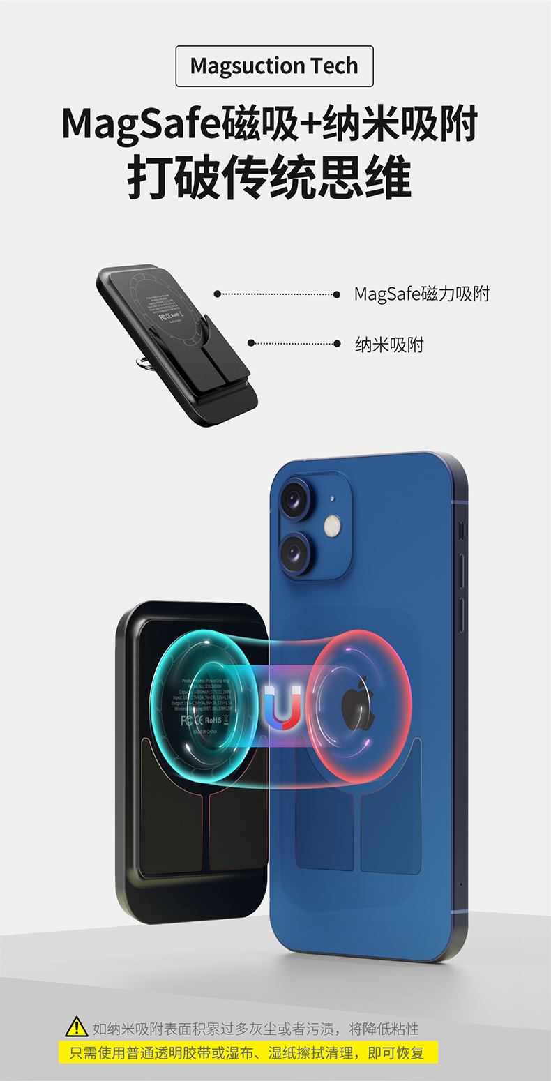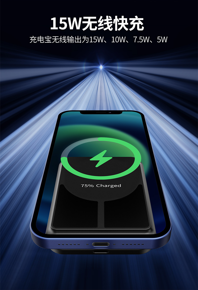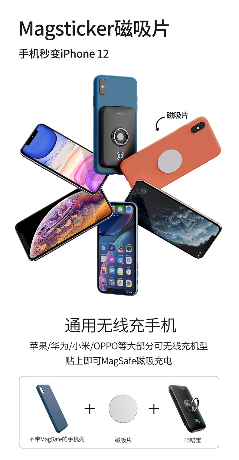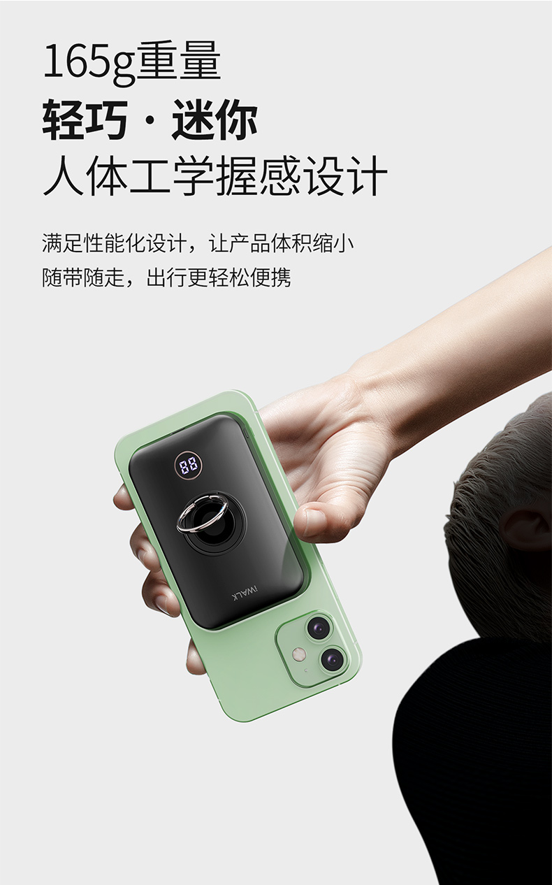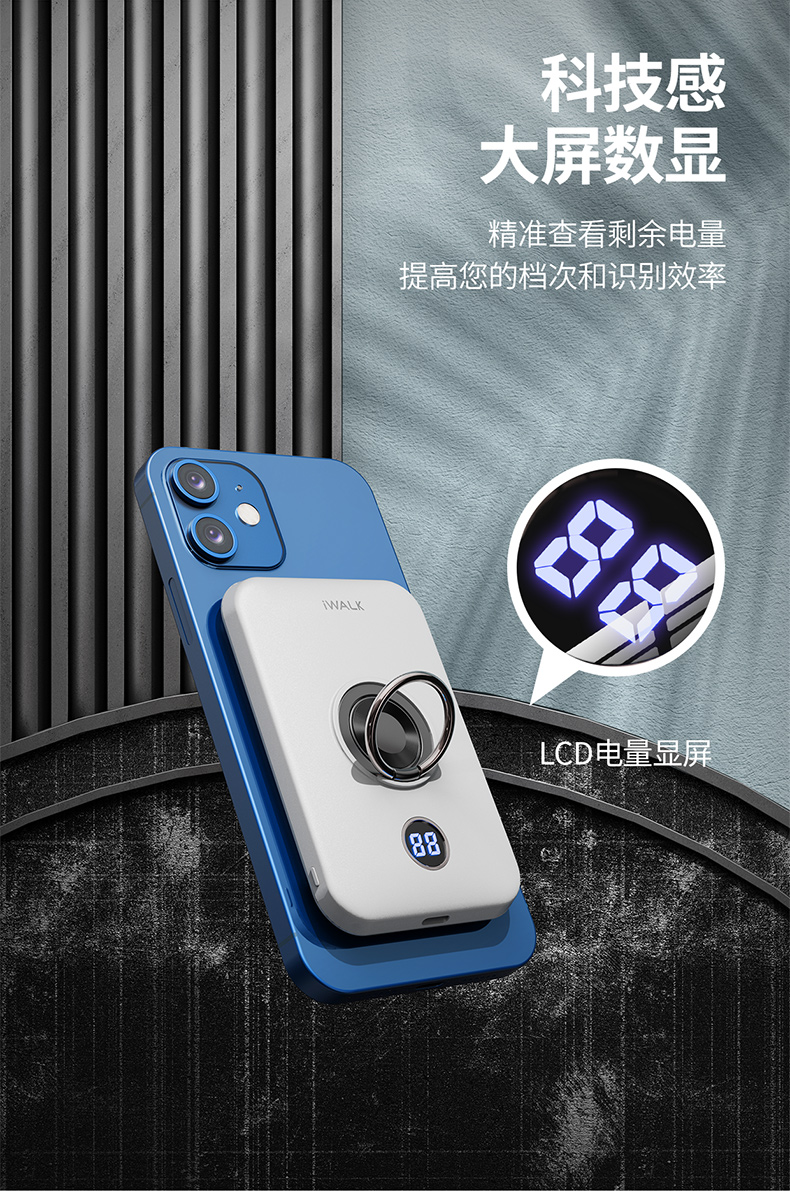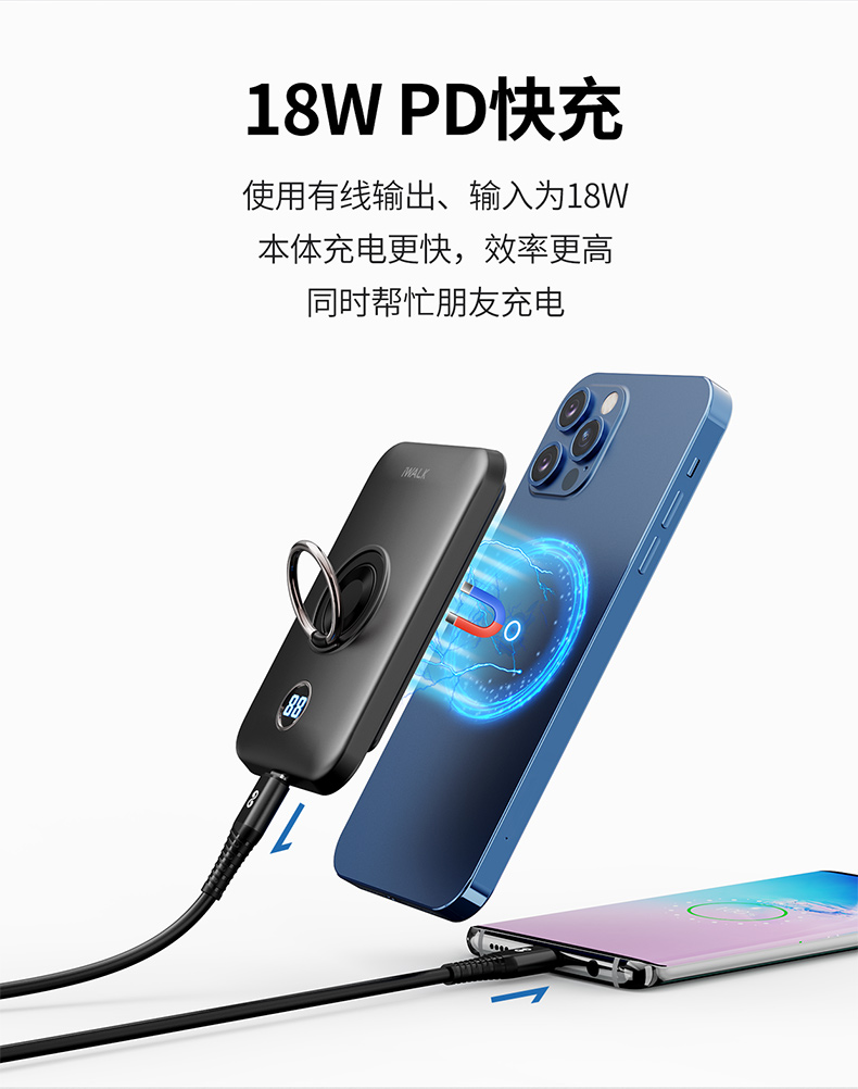 ・ 6000毫安容量,聚合物电芯 ・ 强磁+纳米吸附承重800g技术 ・ 最大支持15W无线充电 ・ 18W PD双向快充,同时可以充两部手机 ・ 自带指环支架 ・ LCD电量显示 ・ 边充边放功能 ・ 超薄便携,最方便的应急充 ・ 所有支持无线充的手机设备都可以充电