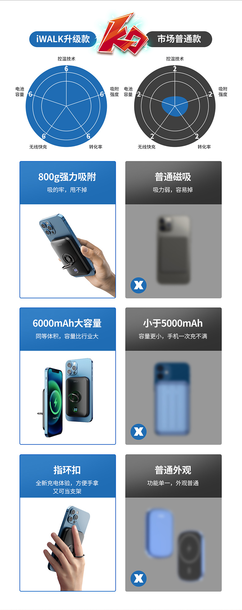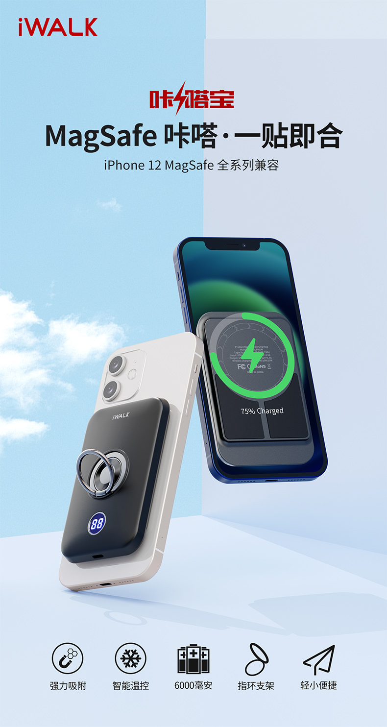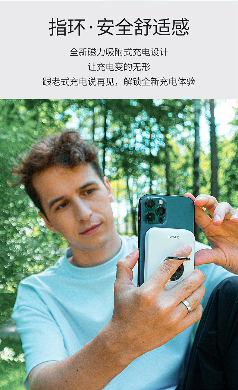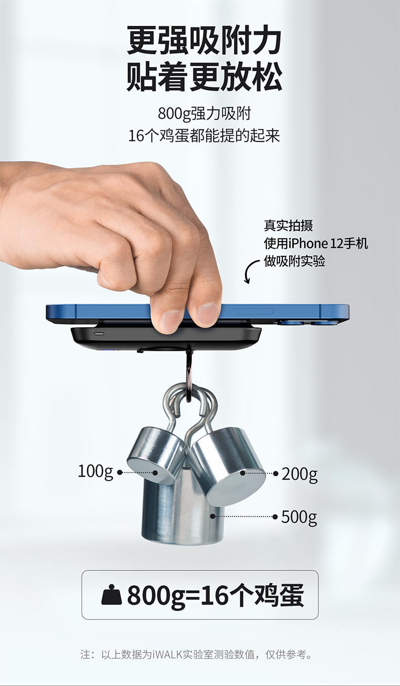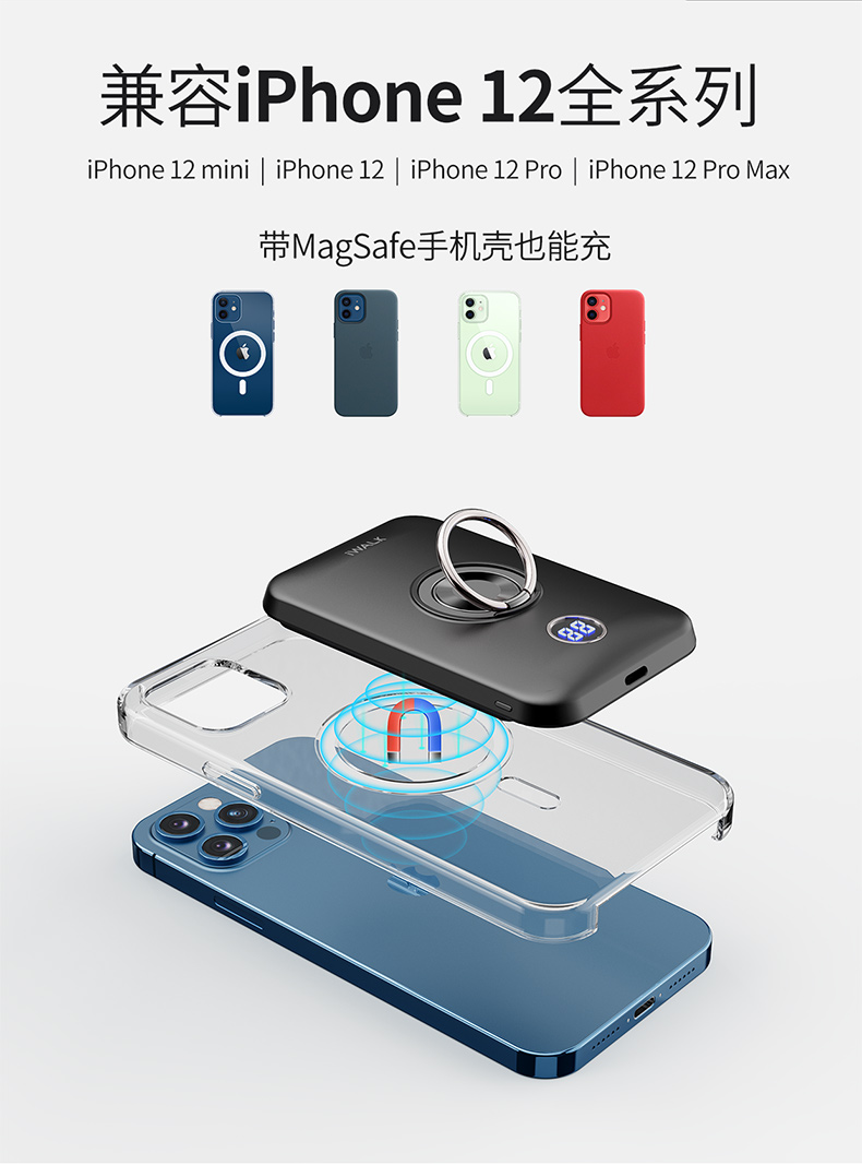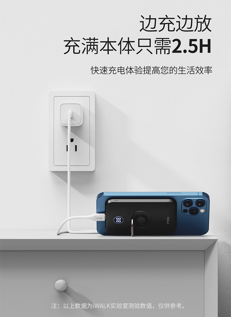 ・ 6000毫安容量,聚合物电芯 ・ 强磁+纳米吸附承重800g技术 ・ 最大支持15W无线充电 ・ 18W PD双向快充,同时可以充两部手机 ・ 自带指环支架 ・ LCD电量显示 ・ 边充边放功能 ・ 超薄便携,最方便的应急充 ・ 所有支持无线充的手机设备都可以充电