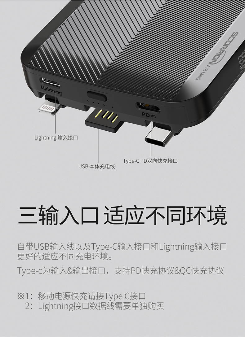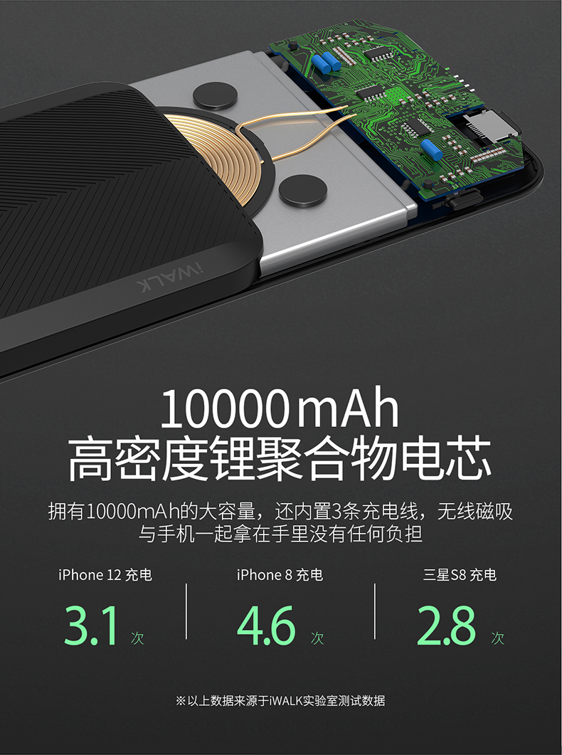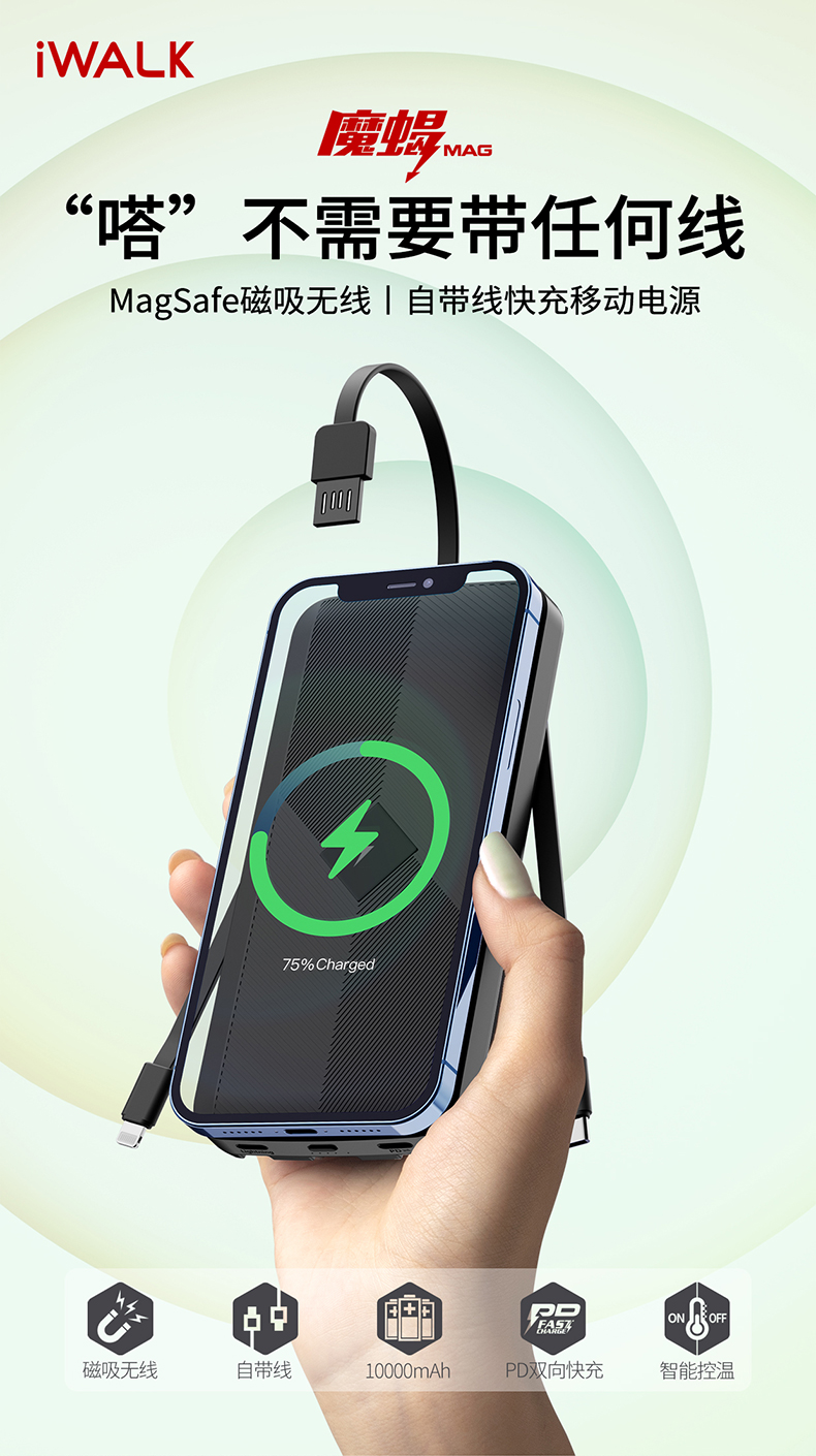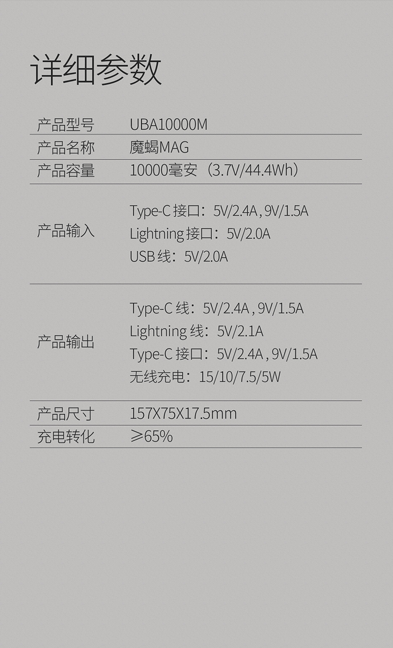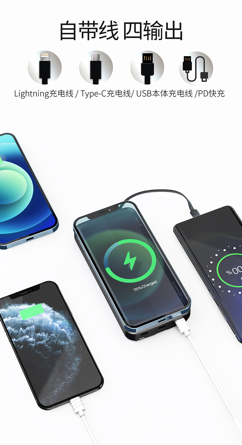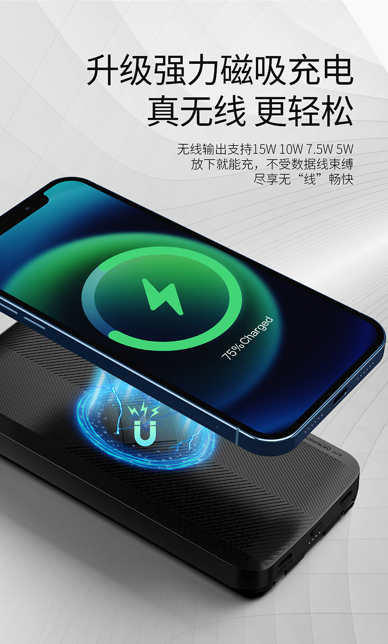 ・ 升级强力磁吸充电,真无线,更轻松,贴着就能充 ・ 双模式快充体验,无线+有线,PD双向快充+QC闪充 ・ 自带线,多输出,支持多个设备同时充电 ・ 智能安全控温芯片,根据环境场景自动调整电流电压 ・ 高品质材质,追求舒适手感,与众不同的质感体验 ・ 10000毫安高密度锂聚合物电芯 ・ 18W max PD+QC快充协议 ・ 广泛兼容多种电子设备