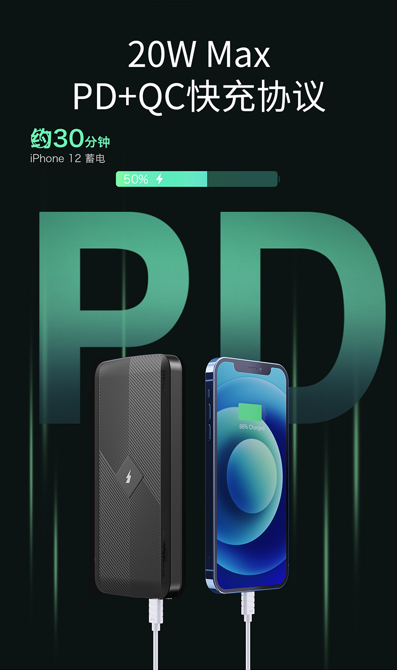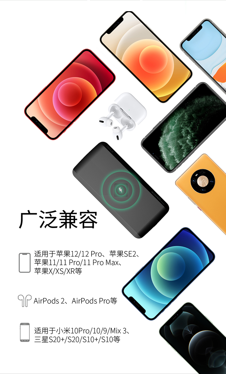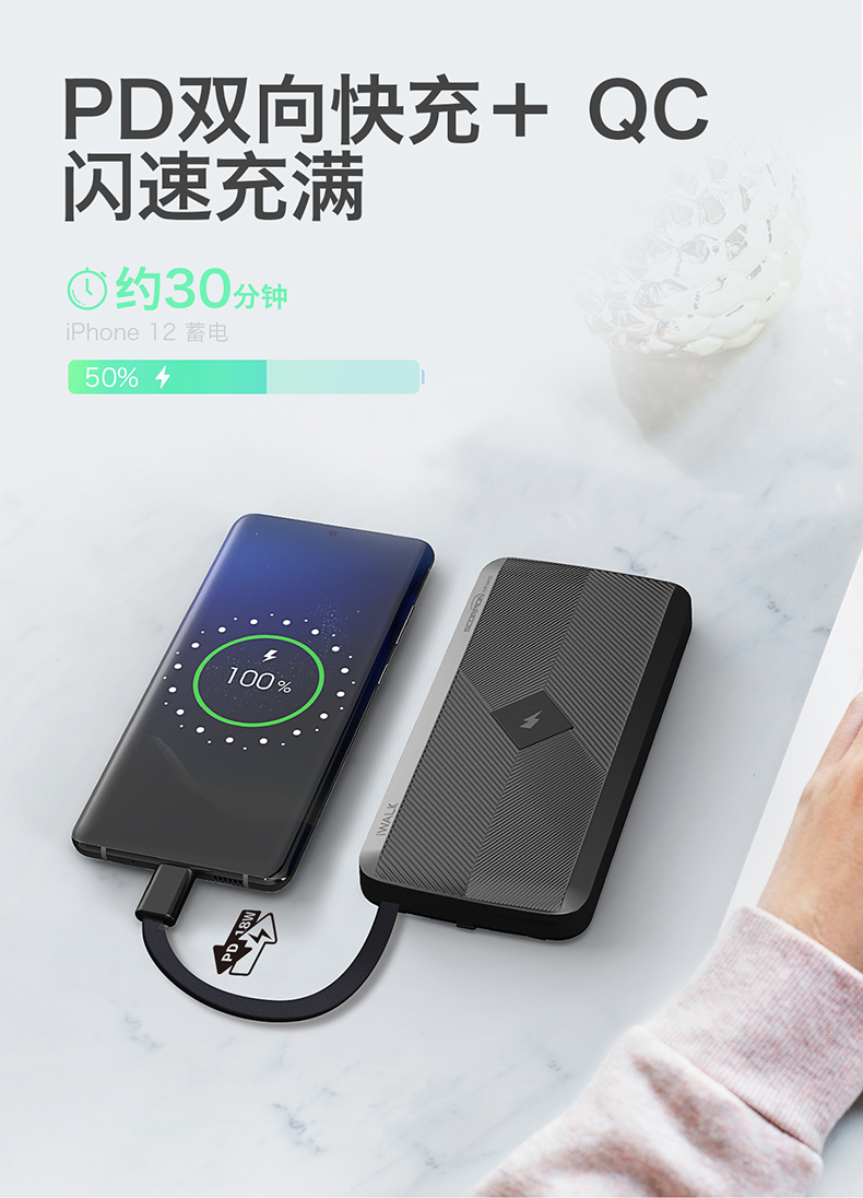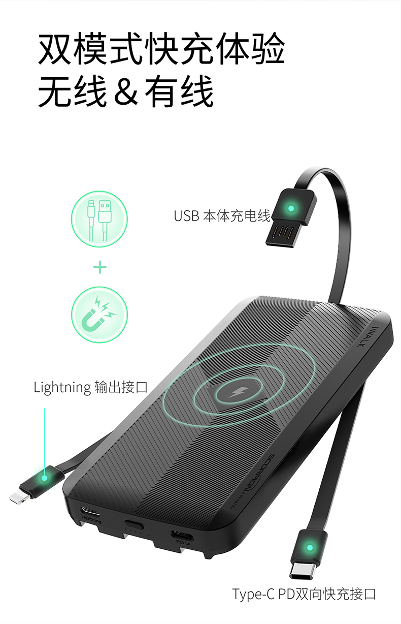 ・ 双模式快充体验,无线+有线,PD双向快充+QC闪充
