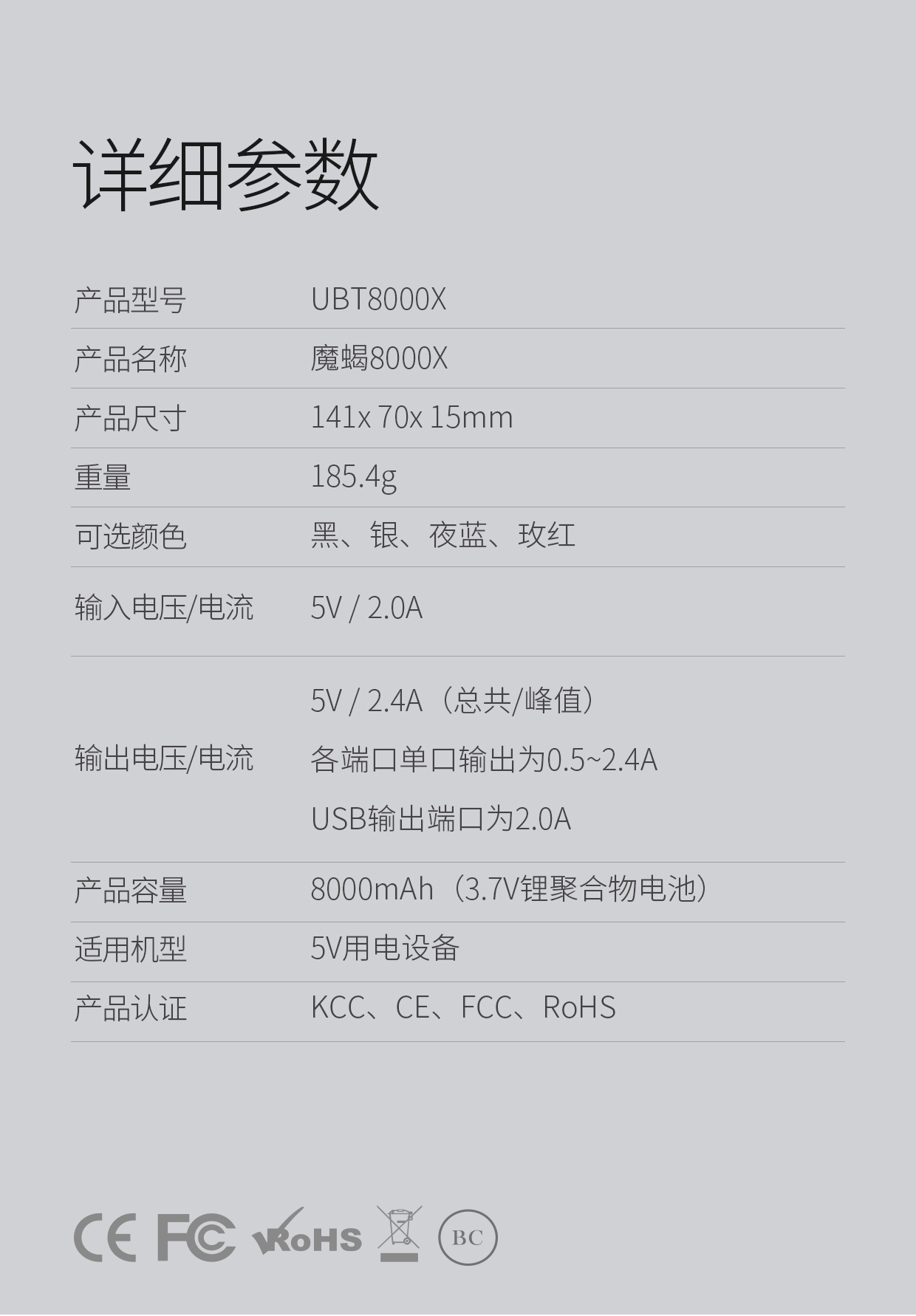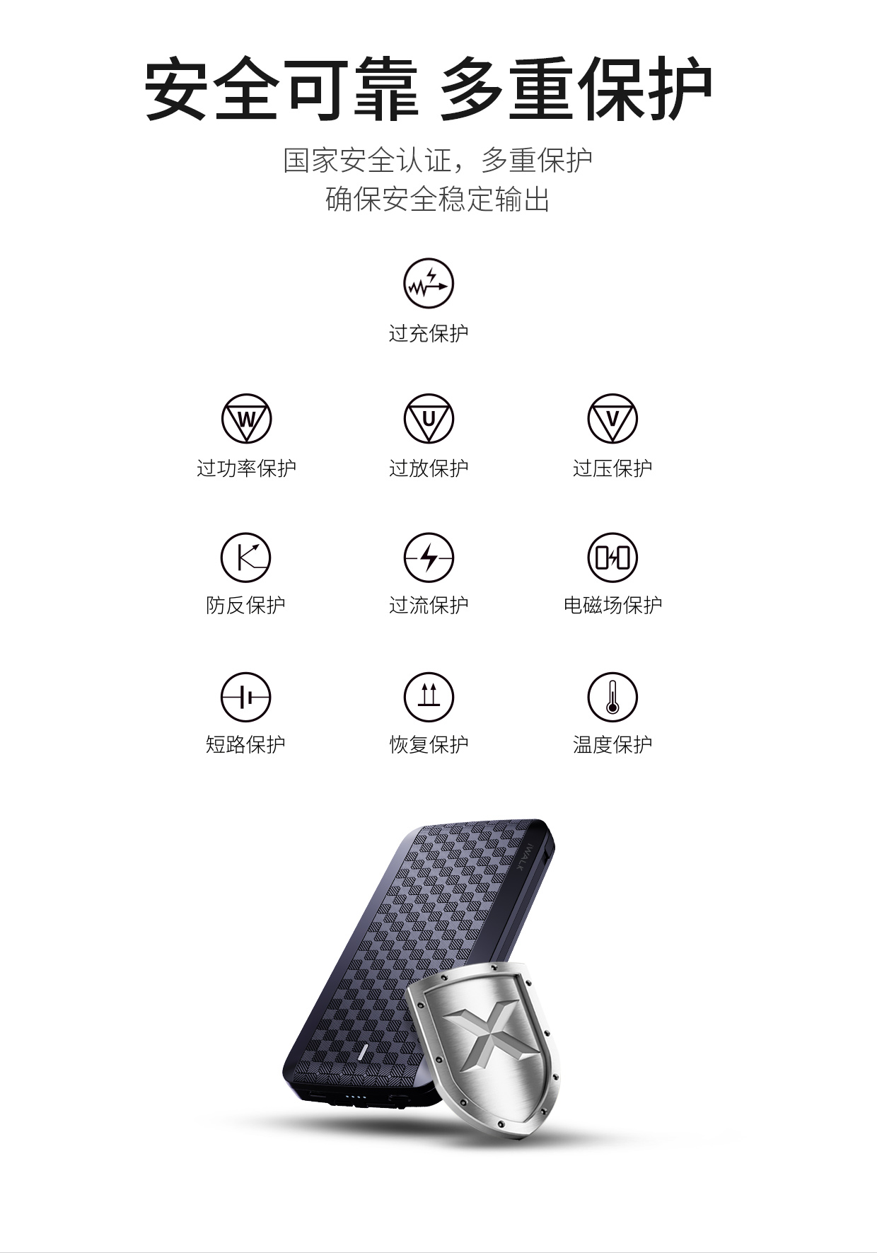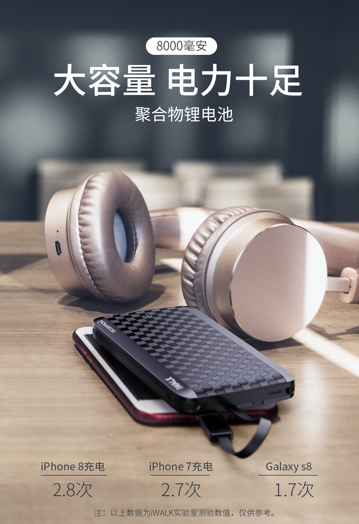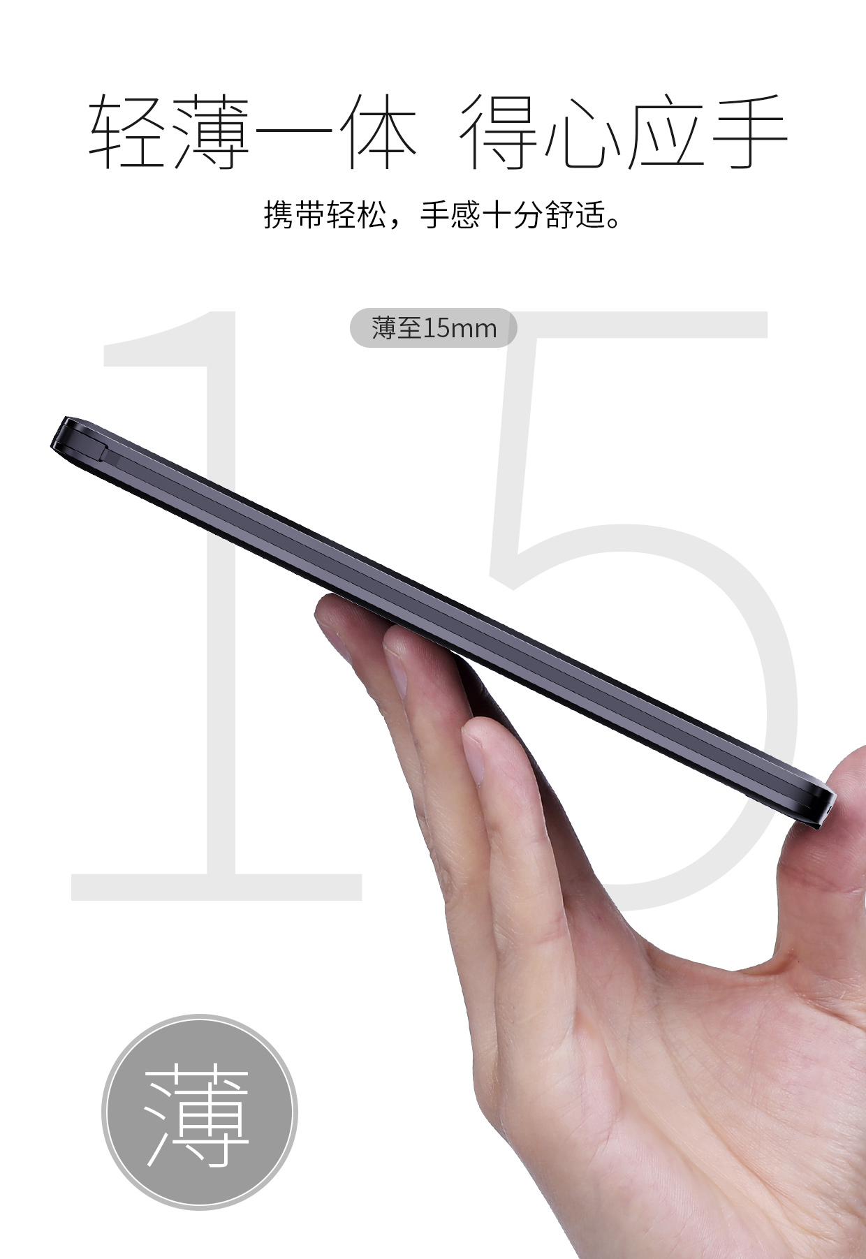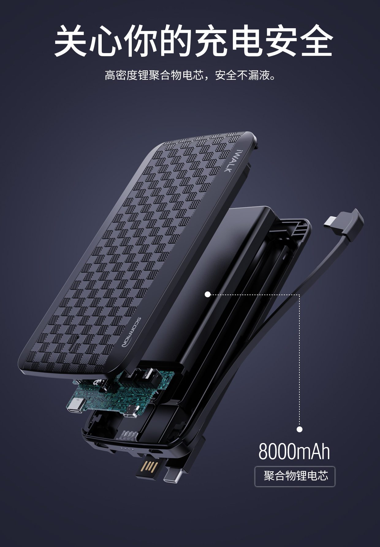 ・ 智能LED灯显示剩余电量 ・ 表面英伦风格设计,简洁时尚 ・ 自带Lightning输出线,Type-C输出线,Micro-USB输出线以及USB输入线 ・ 10重智能保护,200万美金产品质量险 ・ 边充边放(TYPE-C设备边冲边放时无快充功能) ・ 8000毫安容量 ・ 超薄身材,仅15mm ・ 支持MACbook2015款以后的TYPE-C设备充电