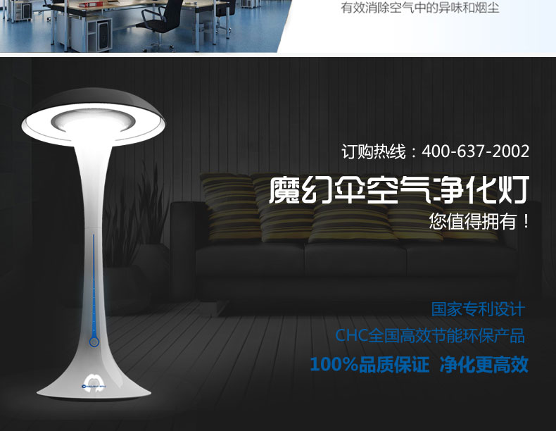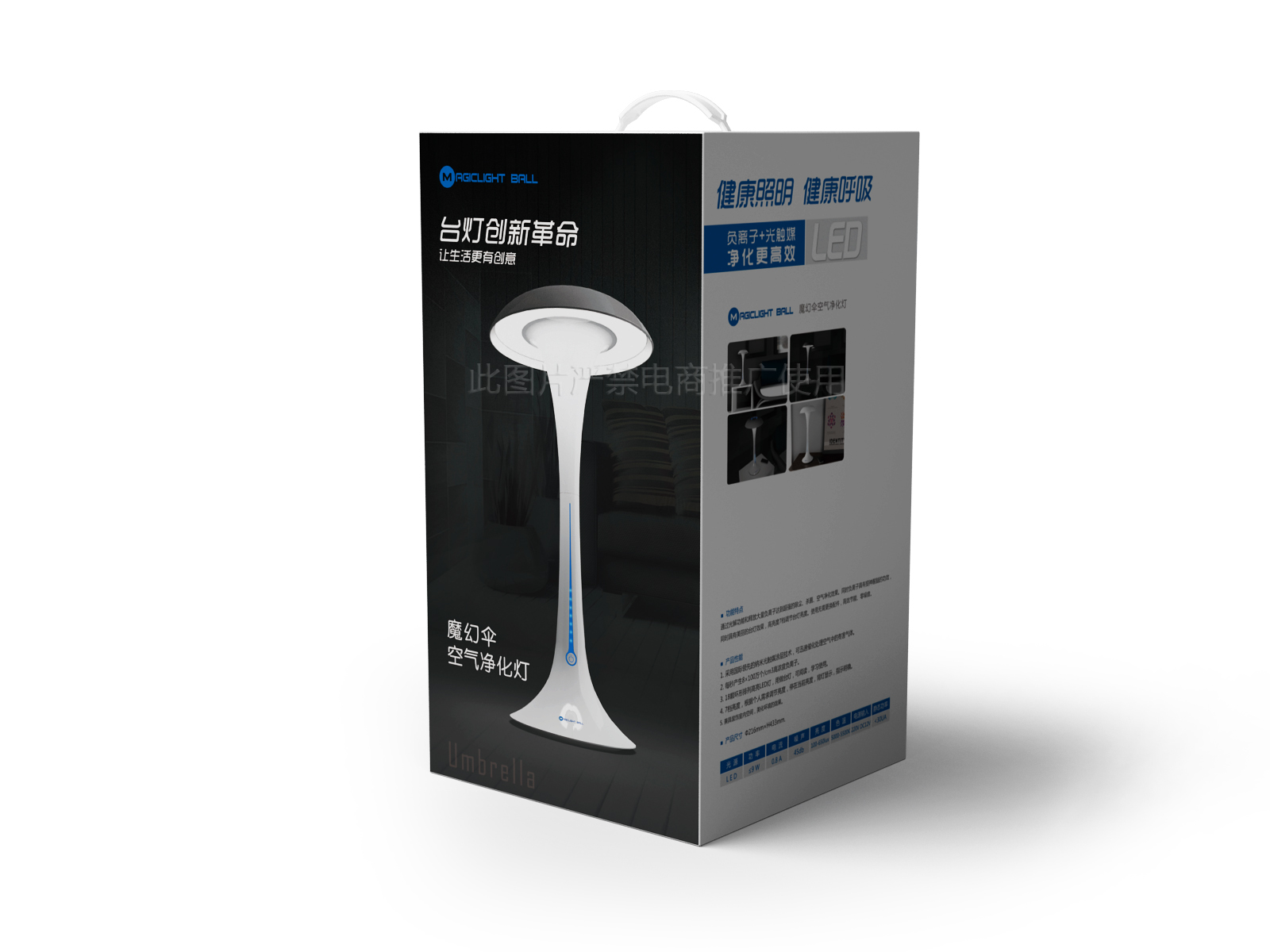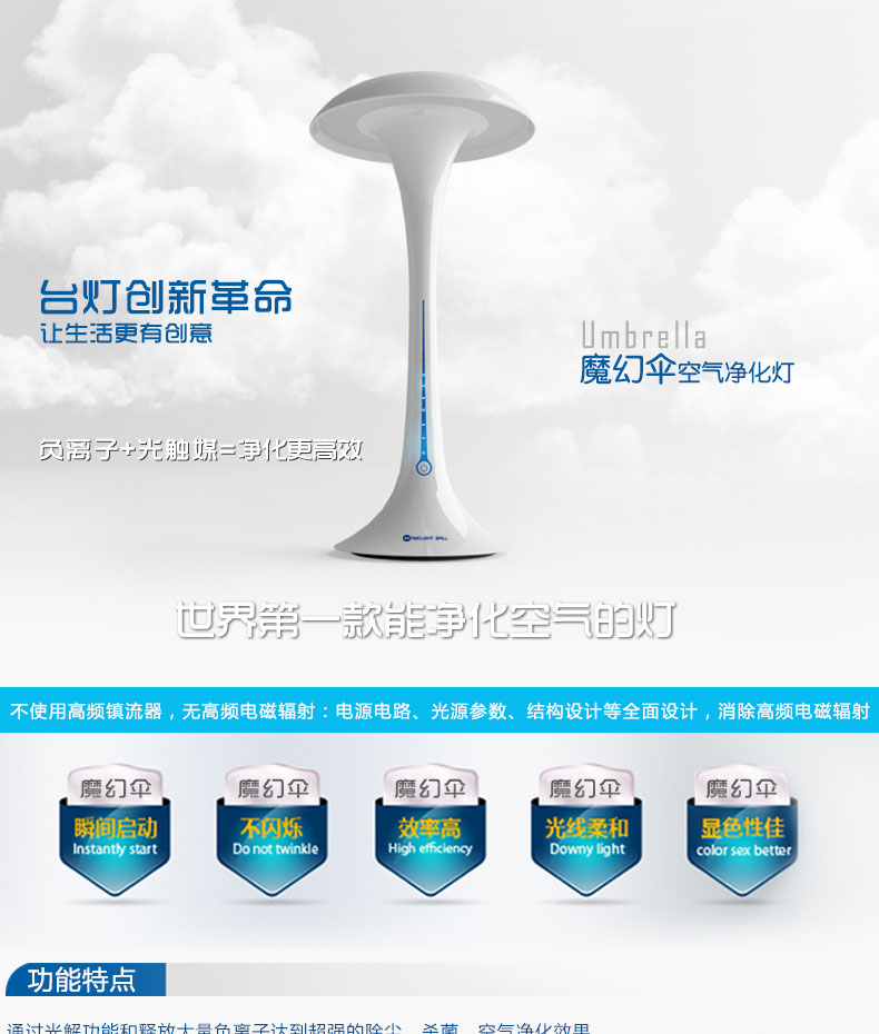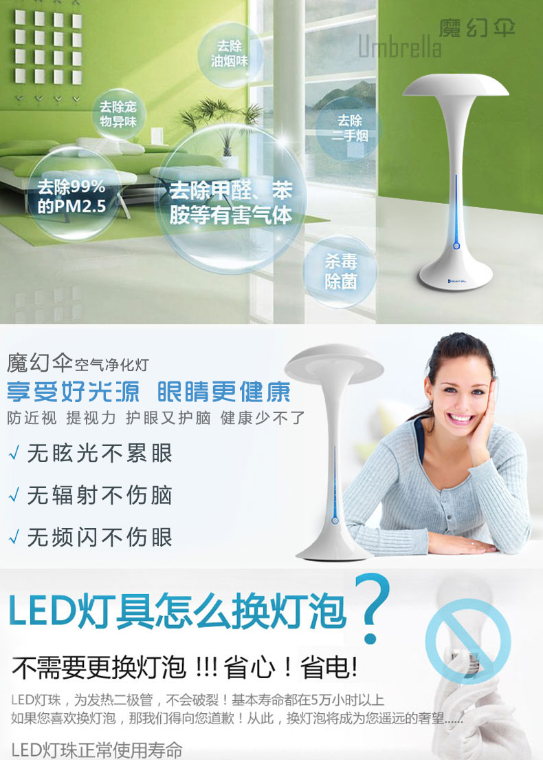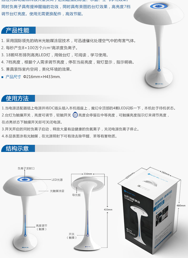 产品简介: 1、材质采用耐高温、耐磨、防潮性、除尘的ABS材料。 2、采用国际领先的纳米光触媒涂层技术,净化房间甲醛、苯、氨、二甲苯等有害气体功能。 3、每秒产生高浓度负离子800万个/cm³, 6-10秒内瞬间分解车内二手烟,PM2.5等微小颗粒污染物。 4、兼具装饰室内空间,美化环境的效果。魔幻伞是一个优雅的灯,同时也有净化功能,一灯两用,既是灯又是净化器,是市面上没有的创意,是跨界产品。灯的效果非常好(7档调节),同时净化效果也很好。 5、 “ISO质量管理体系认证““315”信用品牌,“全国高效节能环保产品” “全国全国质量跟踪重点保护品牌”“国家质检局检验报告”