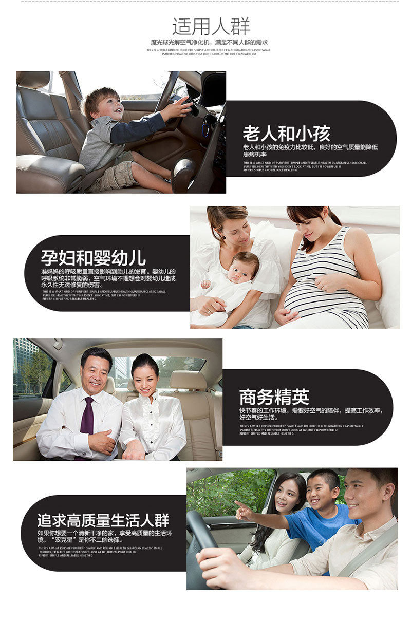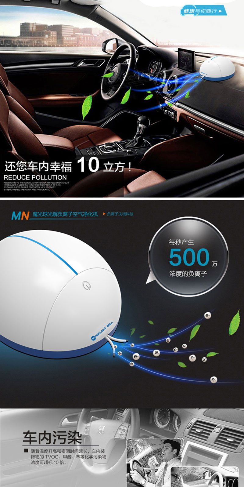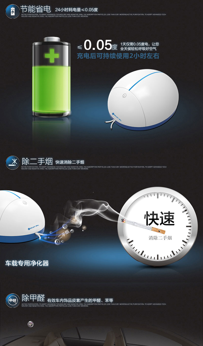 3、每秒产生负离子 500万个/cm³ ,可以在6-10秒内瞬间吸附,中和,沉降车内二手烟,PM2.5等微小颗粒污染物。