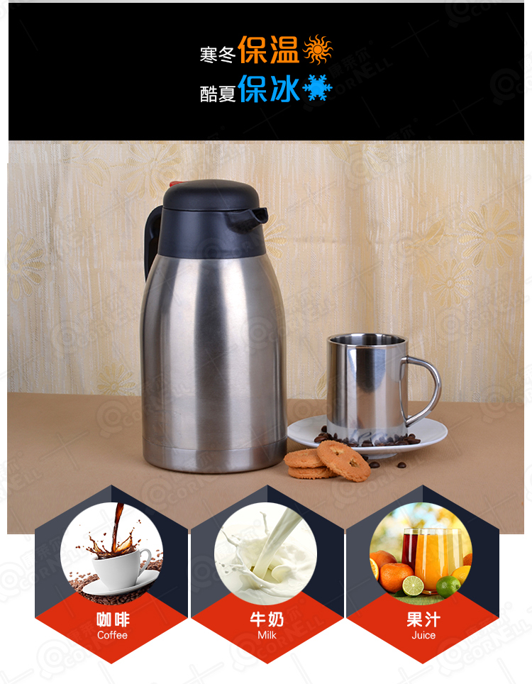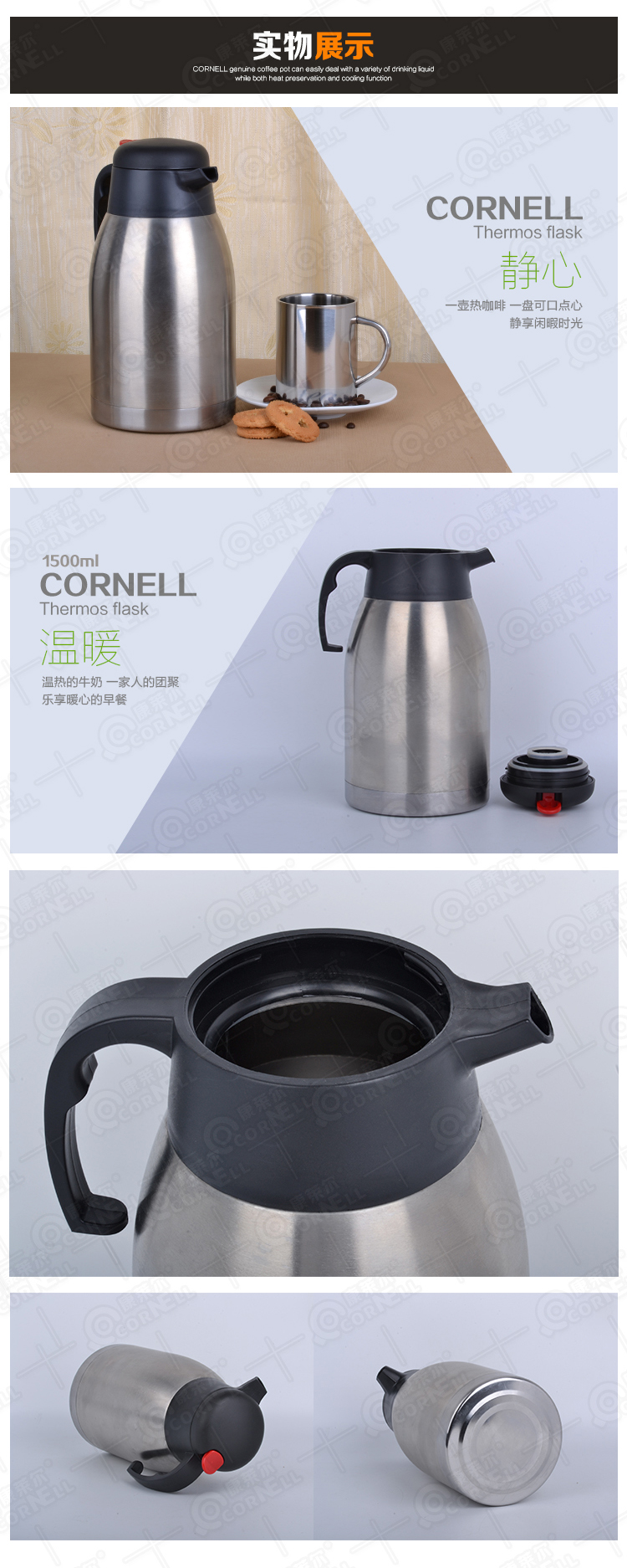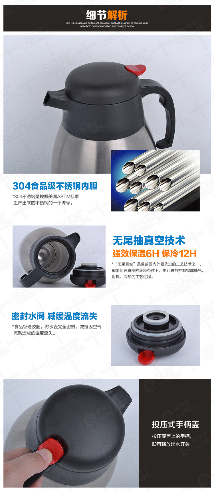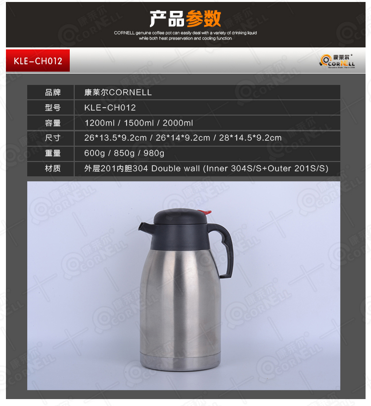 产品名称:咖啡壶 产品型号:KLE-CH012 产品容量:1200ml 产品材质:双层不锈钢 产品包装:OPP袋+彩盒 产品颜色:随机色发货