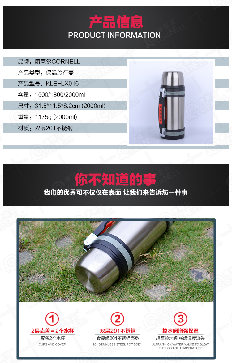 产品型号:KLE-LX016 产品材质:双层不锈钢 产品容量:1800ml 产品颜色:随机色发货 产品包装:OPP袋+彩盒