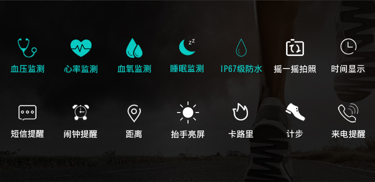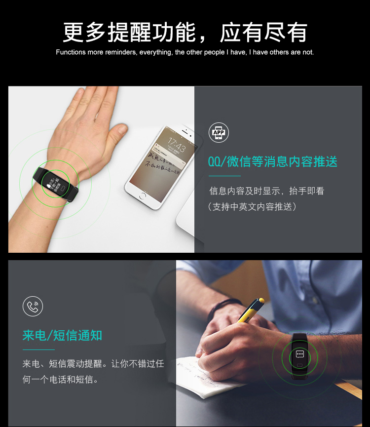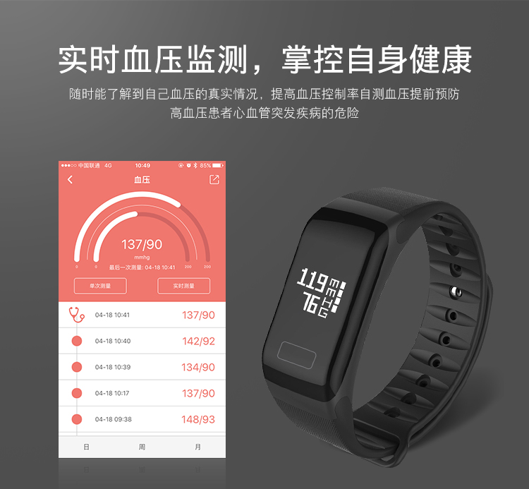 1、蓝牙芯片Nrf51822,0.66 OLED显示屏 2、主机塑胶材质,腕带TPU材质 3、单点触控按键操作 4、电池80mAh,充电2H,待机10天以上 5、设备要求:Android 4.4、IOS8.0及以上系统 6、支持中文,英文,日文、西班牙、葡萄牙、韩国、德国