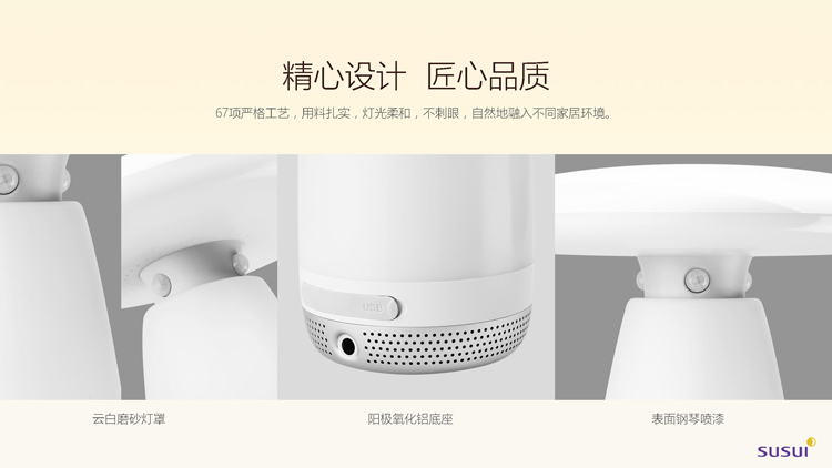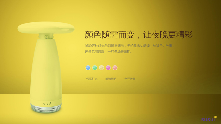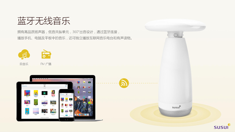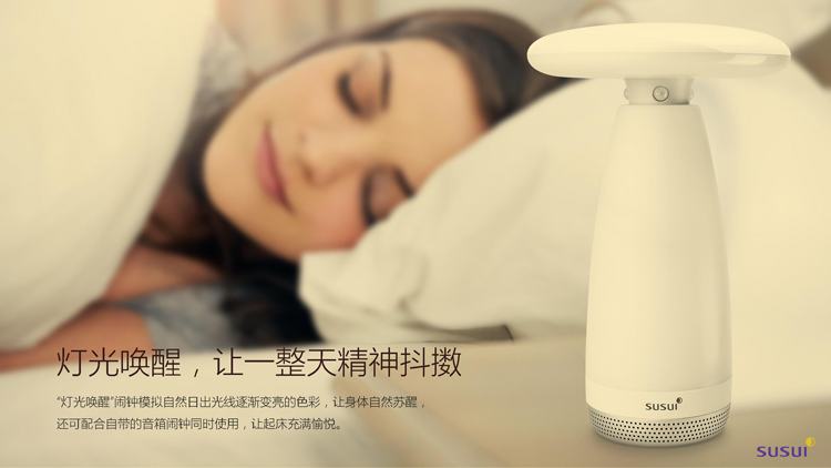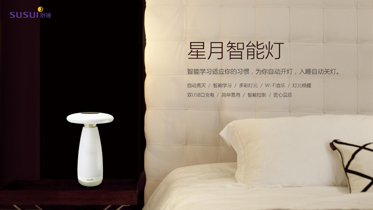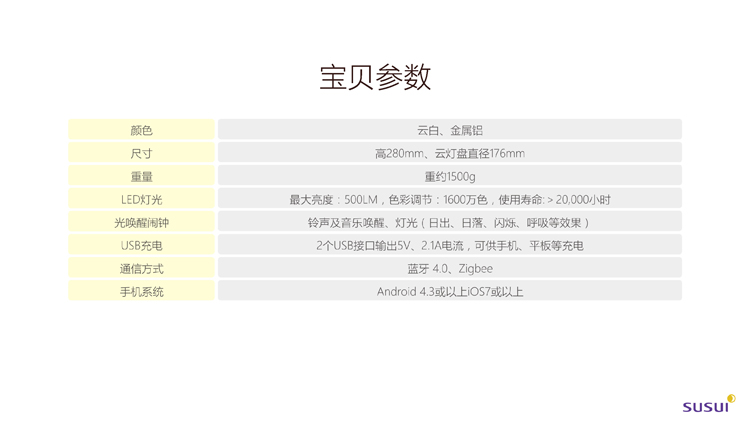 产品名称:舒睡星月智能音响灯 产品尺寸:高280mm,灯盘直径176mm 产品重量:约1500g LED灯光:最大亮度:500LM 色彩调节:1600万色 使用寿命:20000小时 光唤醒闹钟:铃声以及音乐唤醒,灯光 USB充电:2个USB接口,输出5V、2.1A电流,可供手机平板充电 通信方式:蓝牙4.0、Zigbee 手机系统:Android 4.3或以上,IOS 7或以上